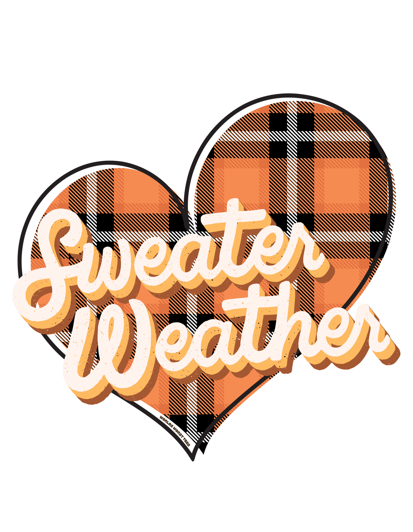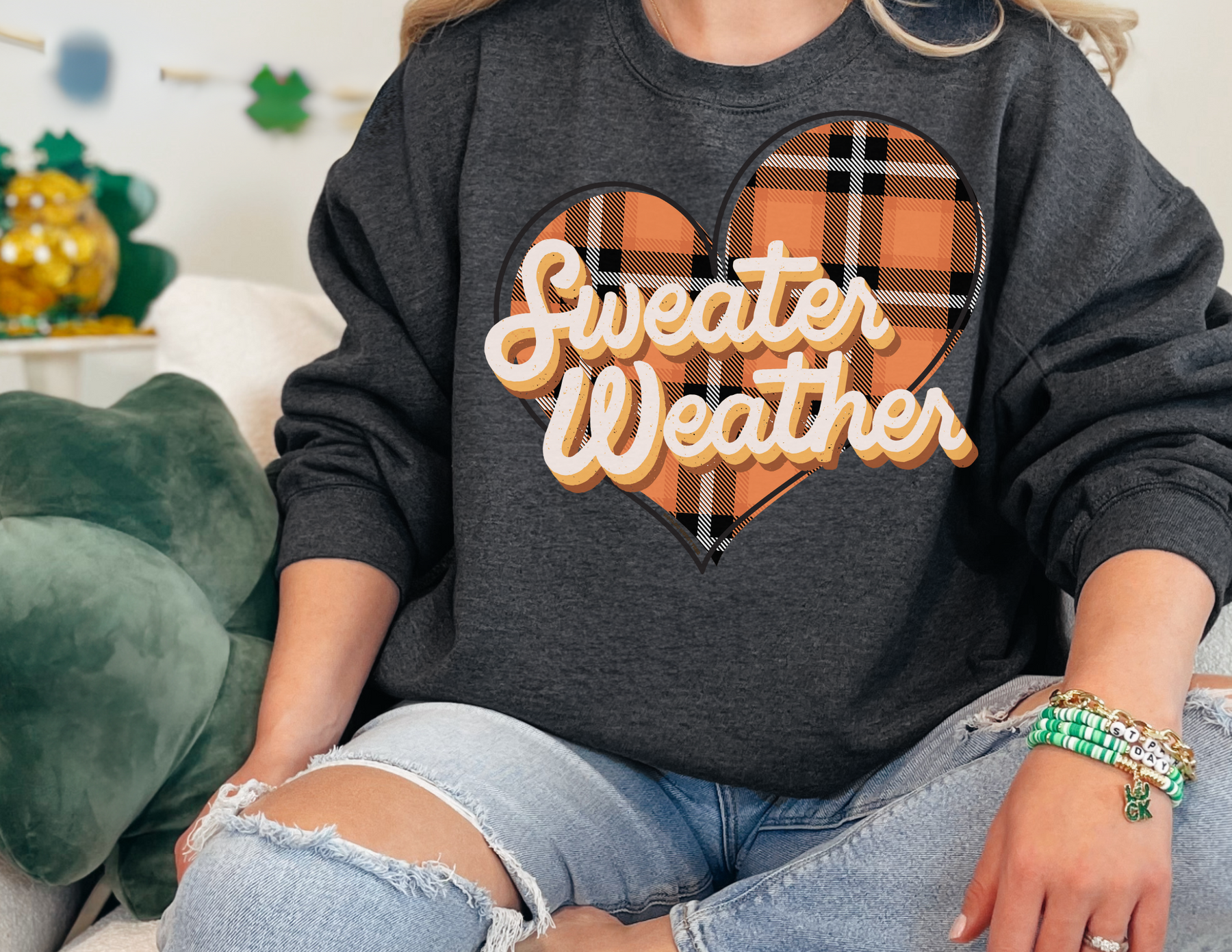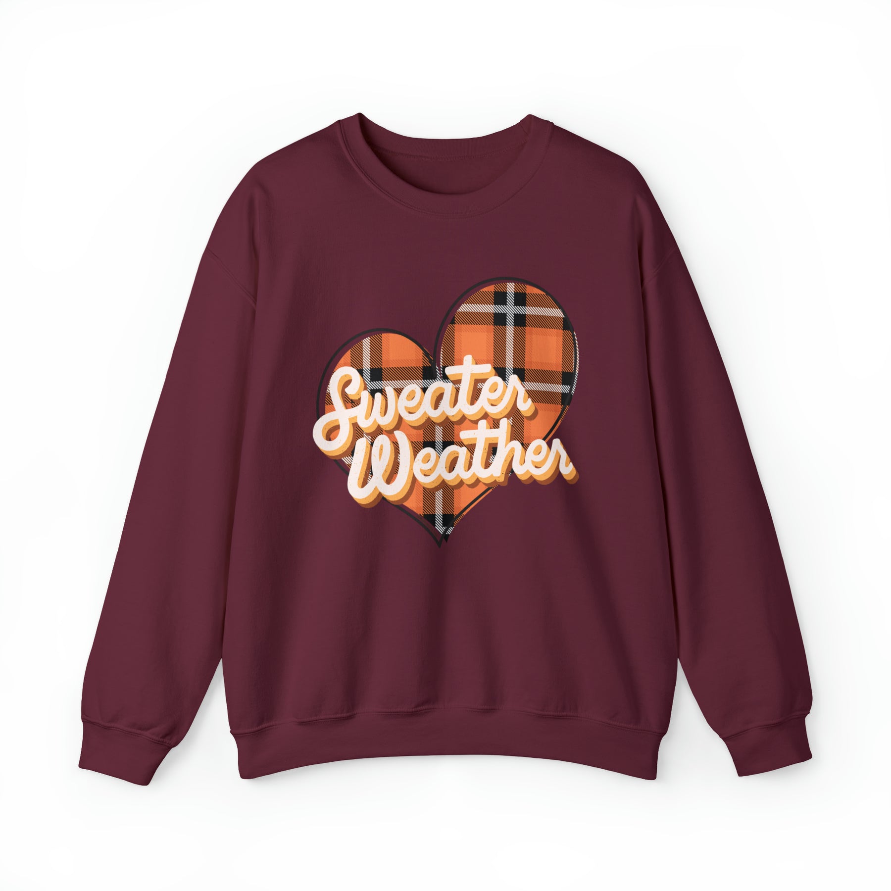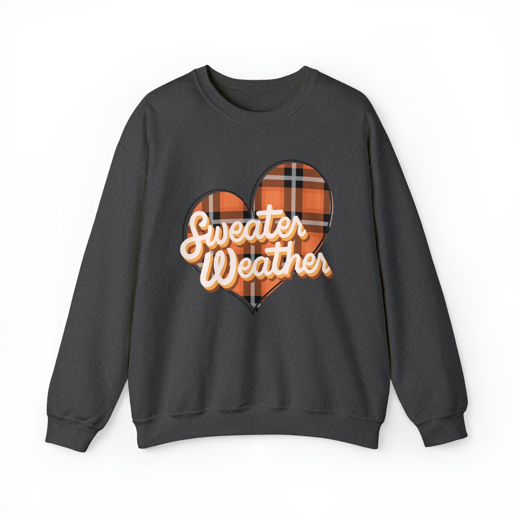 A heavy blend crewneck sweatshirt, the Sweater Weather Crew, in white with a plaid heart design. Unisex, loose fit, ribbed knit collar, polyester-cotton fabric, and no itchy side seams. Ideal comfort for all.