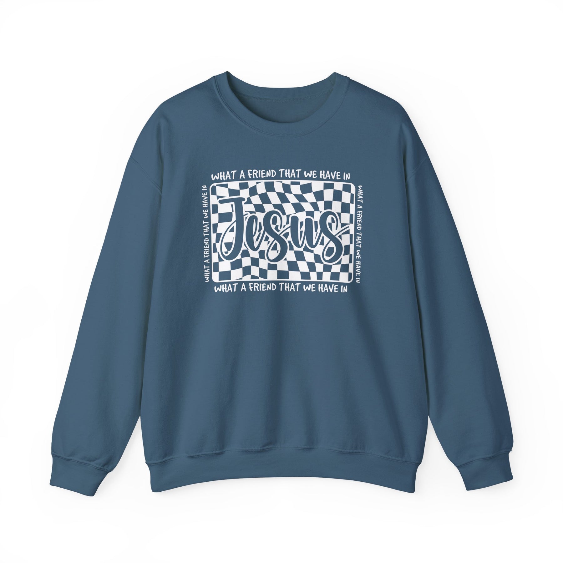 Blue crew-neck sweatshirt featuring a wavy checkerboard graphic with Jesus in script, surrounded by What a friend that we have in. Ideal for colder months.