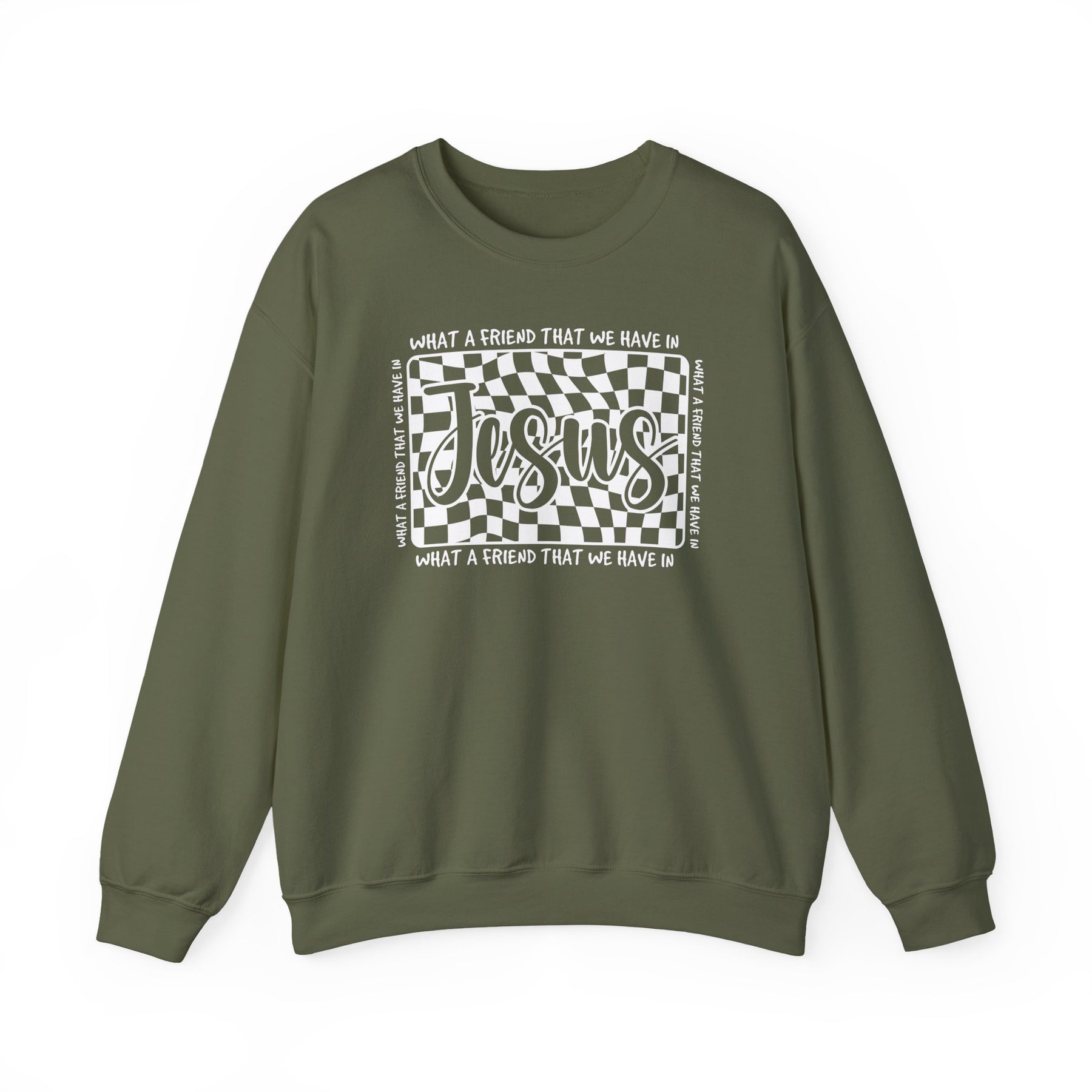 Unisex olive-green crewneck sweatshirt featuring a wavy checkerboard graphic with Jesus script, surrounded by What a friend we have in Jesus text.