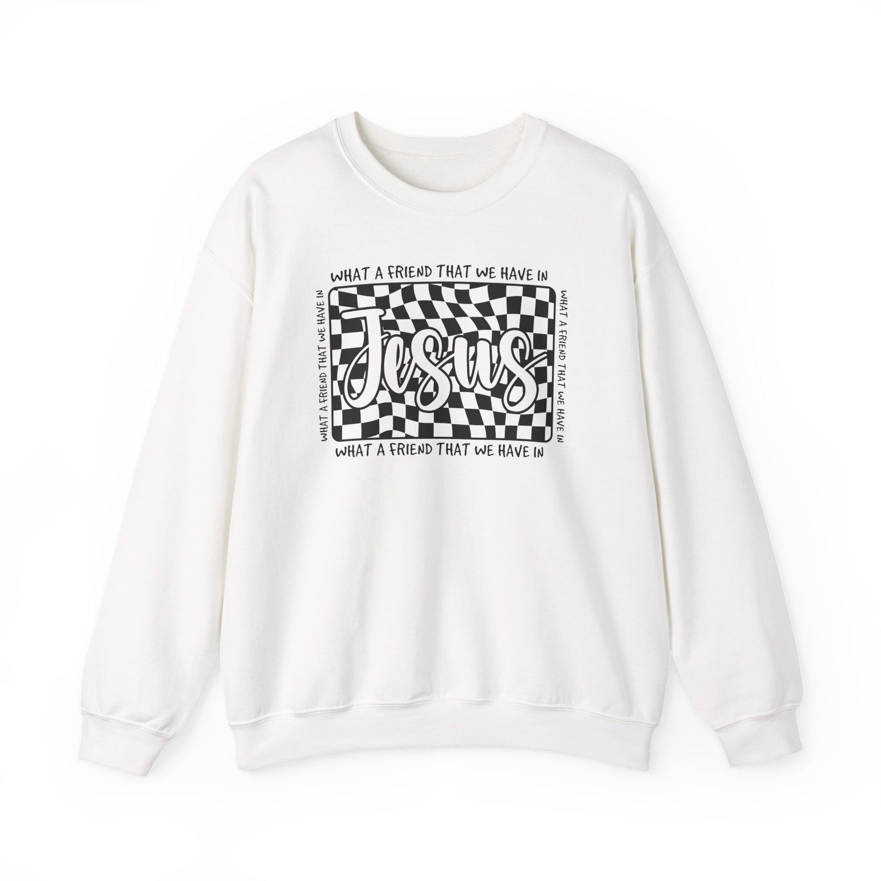 White crew-neck sweatshirt featuring a black-and-white distorted checkerboard graphic with Jesus in hand-lettered style; surrounded by What a friend we have in text.