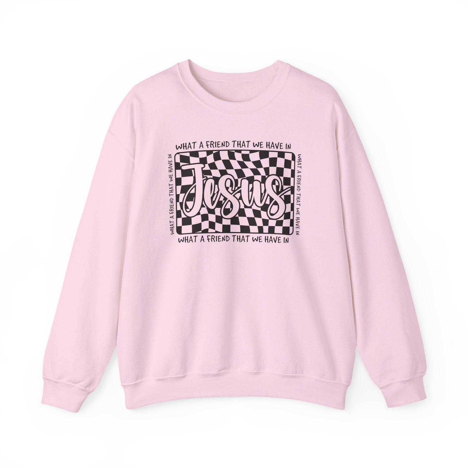 Heather-gray crewneck sweatshirt featuring a wavy checkerboard graphic with Jesus in bold. Encircled by the phrase What a friend that we have in.