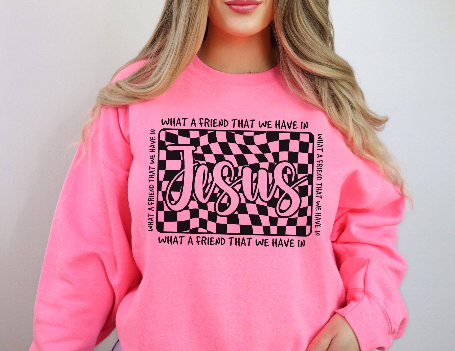 Pink crew-neck sweatshirt featuring What a Friend We Have in Jesus in a warped checkerboard design, offering cozy, durable comfort with ethical production.