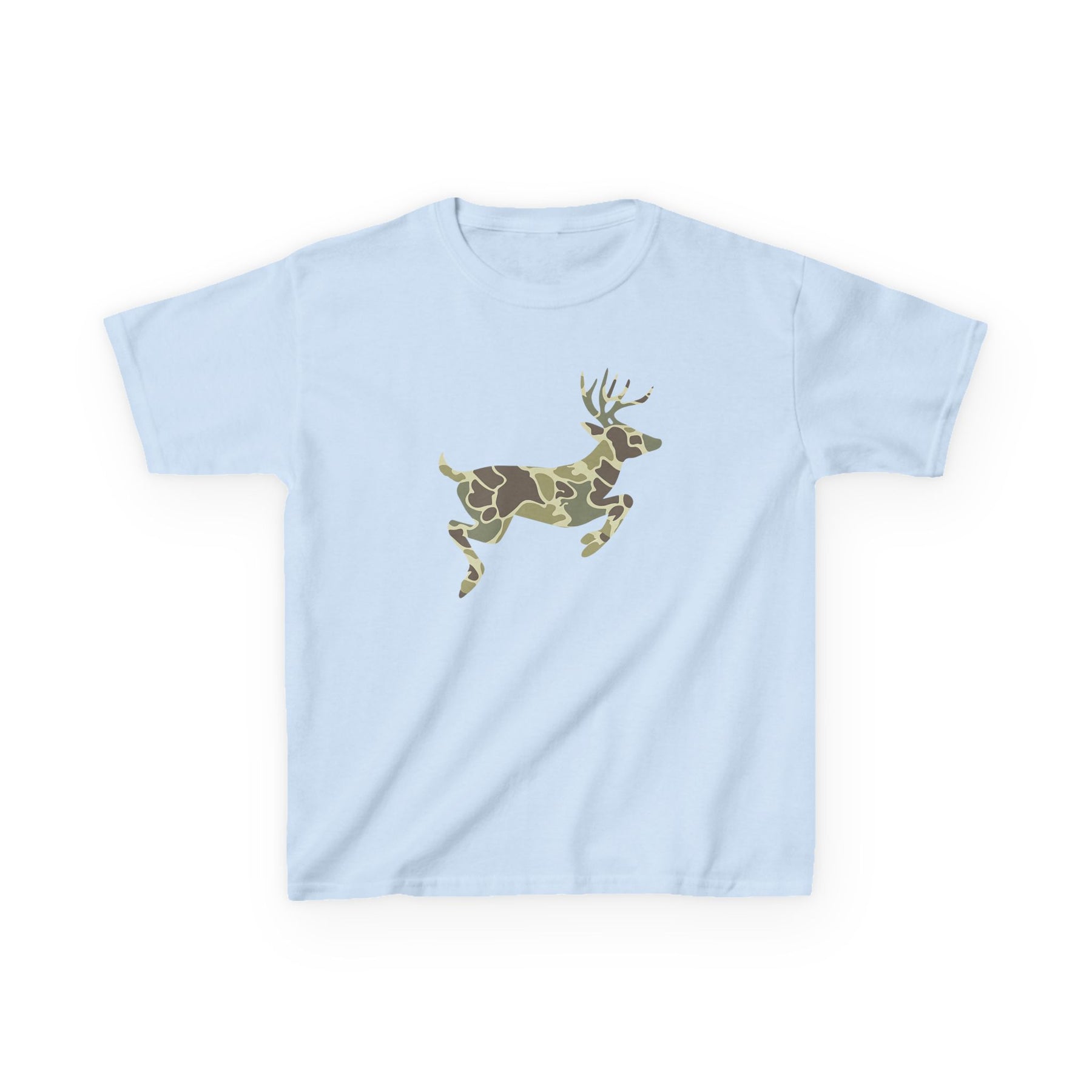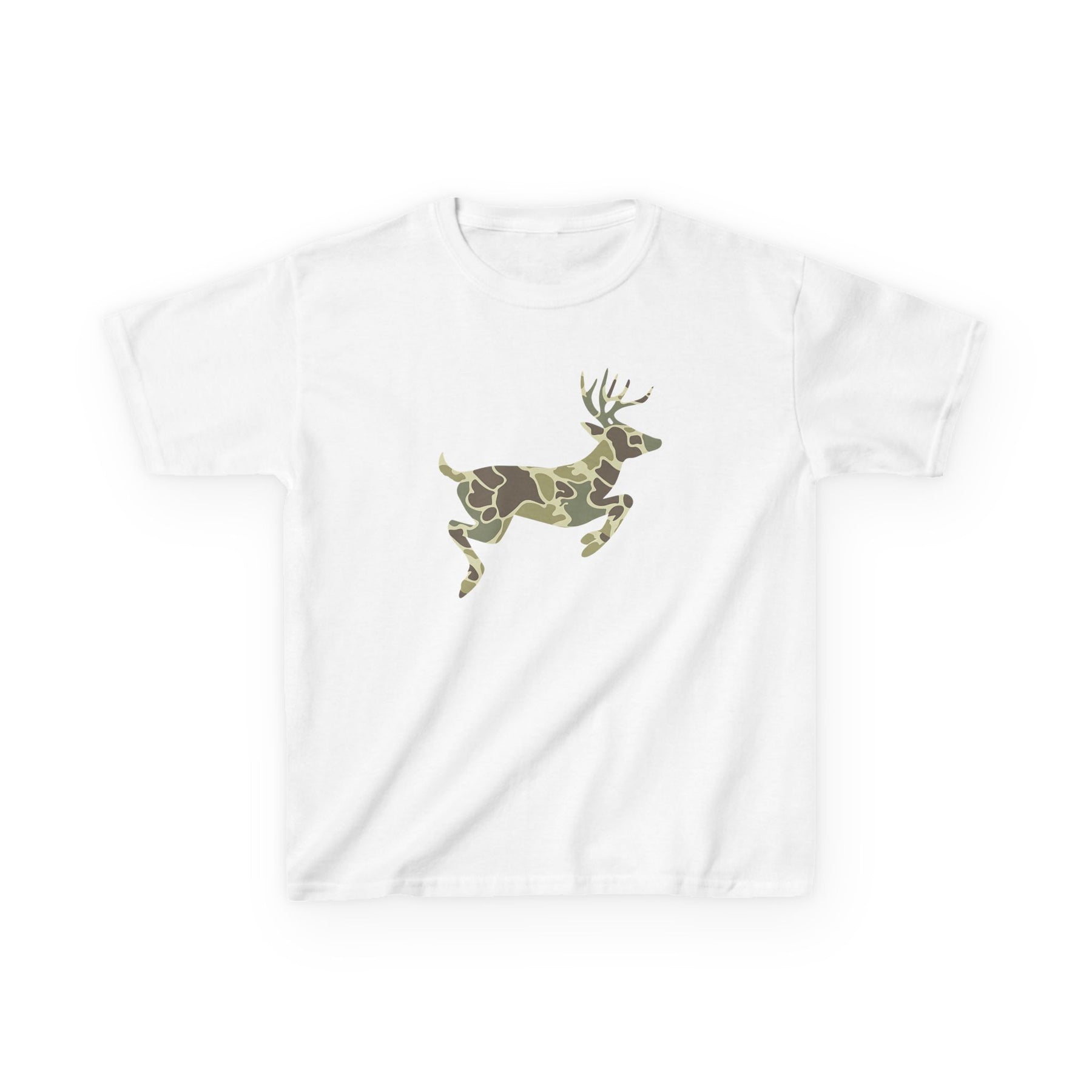 Camo Deer Kids Tee features a white T-shirt with a leaping deer in green-brown camouflage, ideal for everyday wear and crafted from durable cotton.