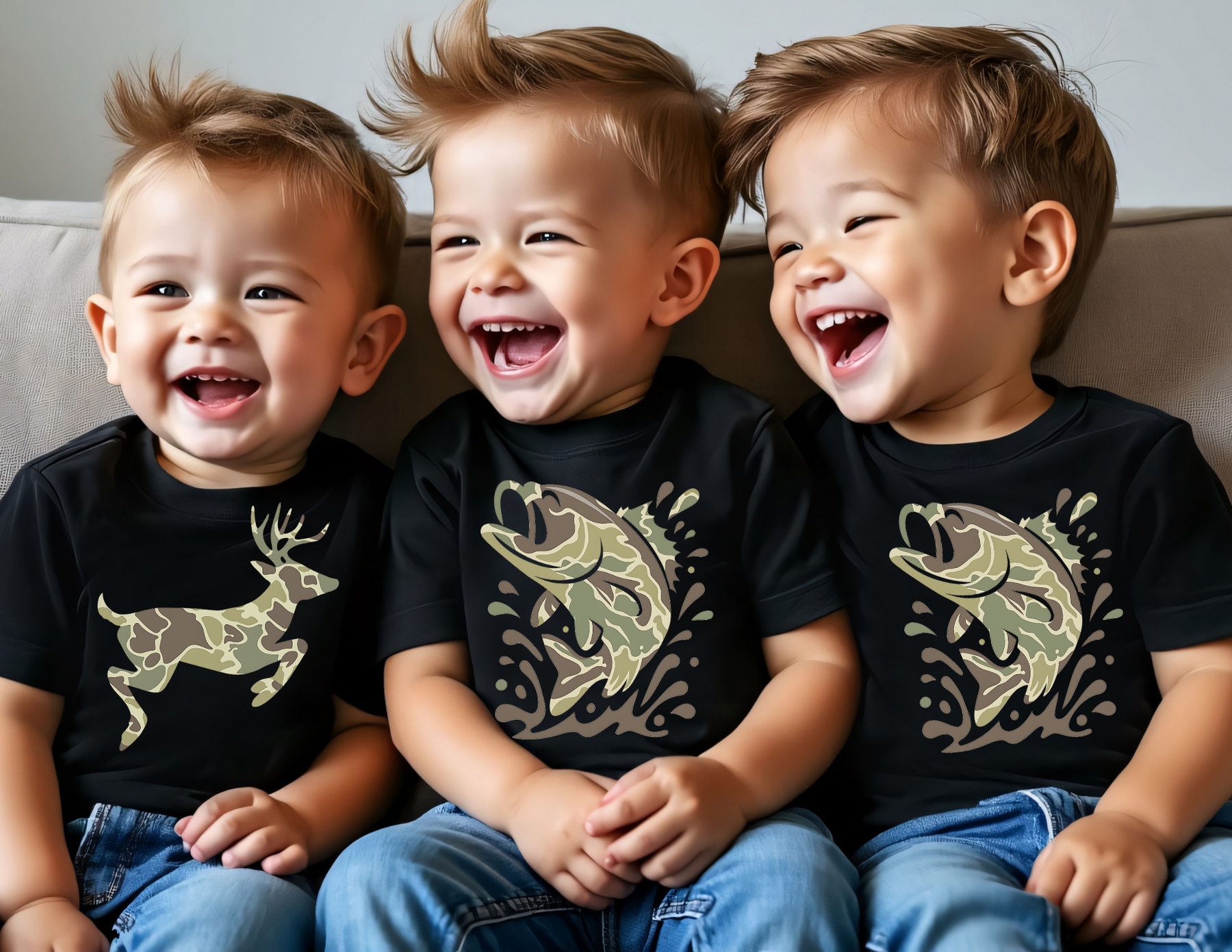 Three toddlers on a couch wear Camo Deer Kids Tees with camouflage animal graphics, laughing and enjoying themselves, showcasing the playful and durable design.