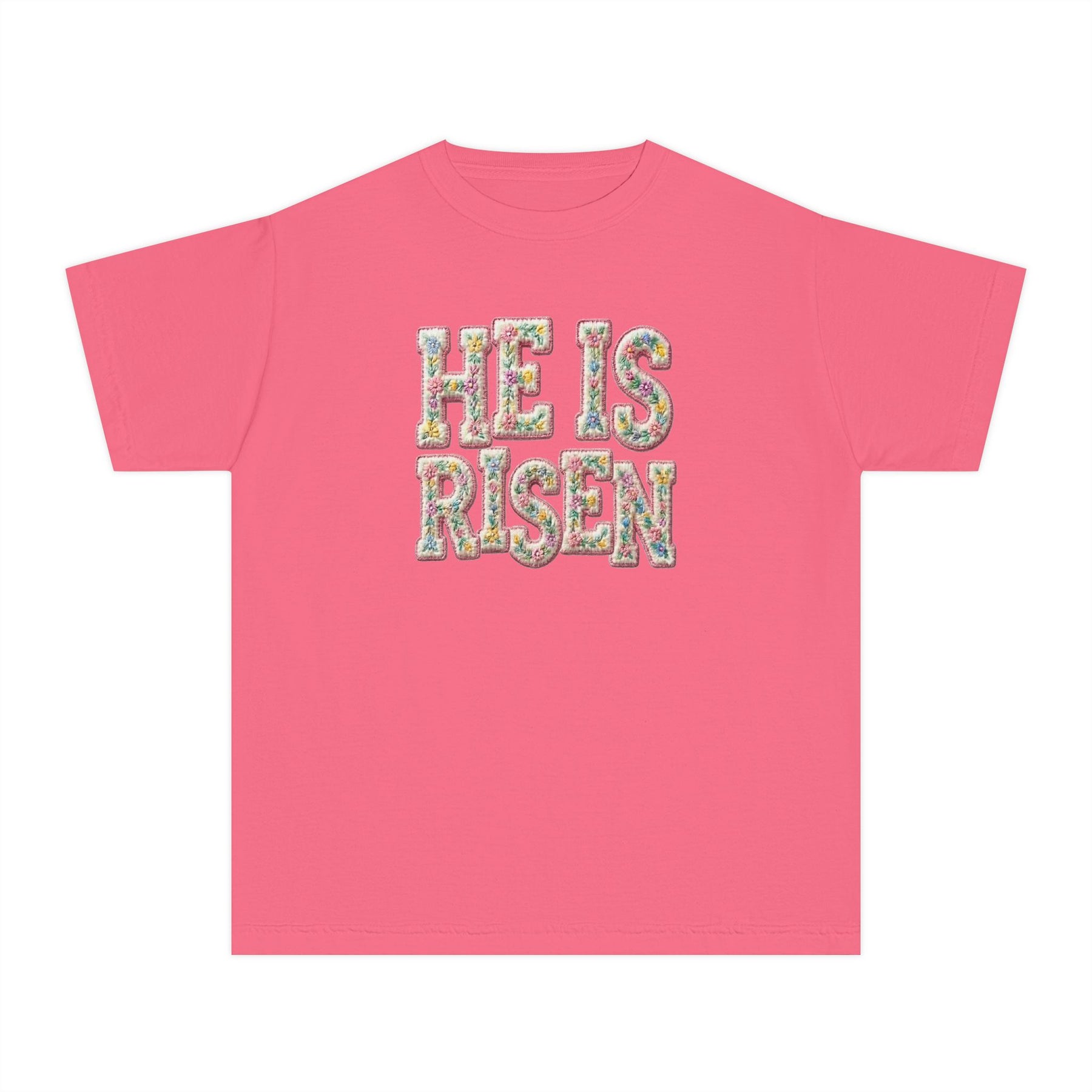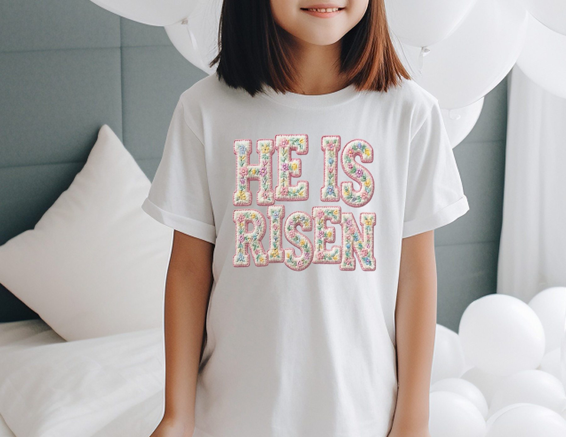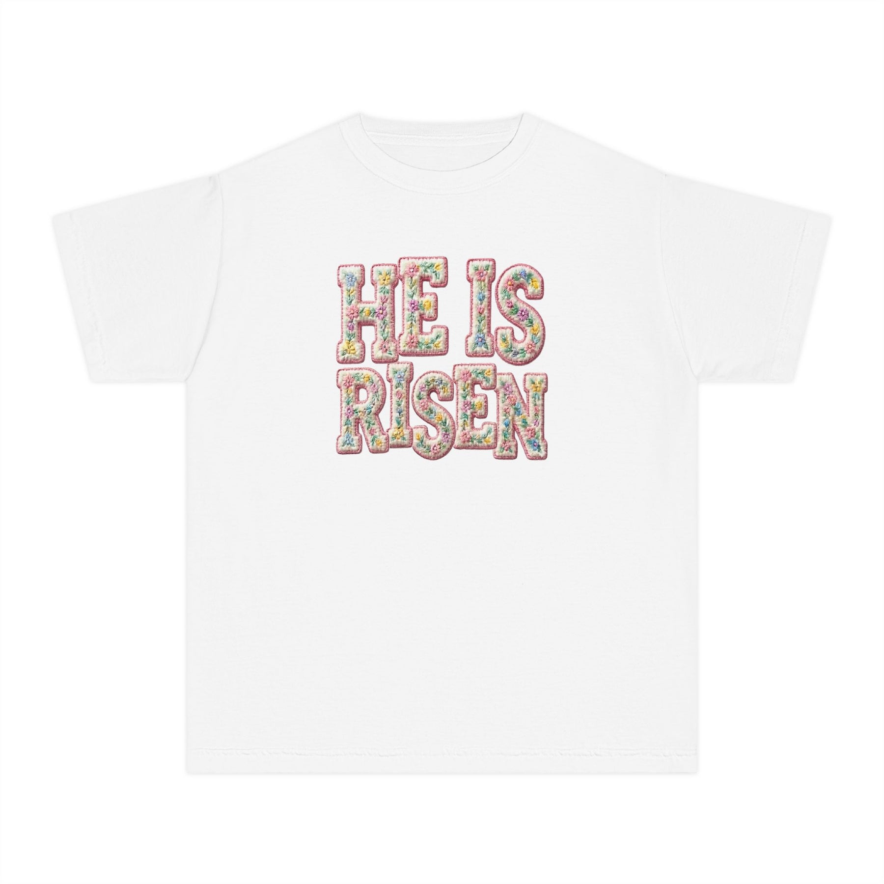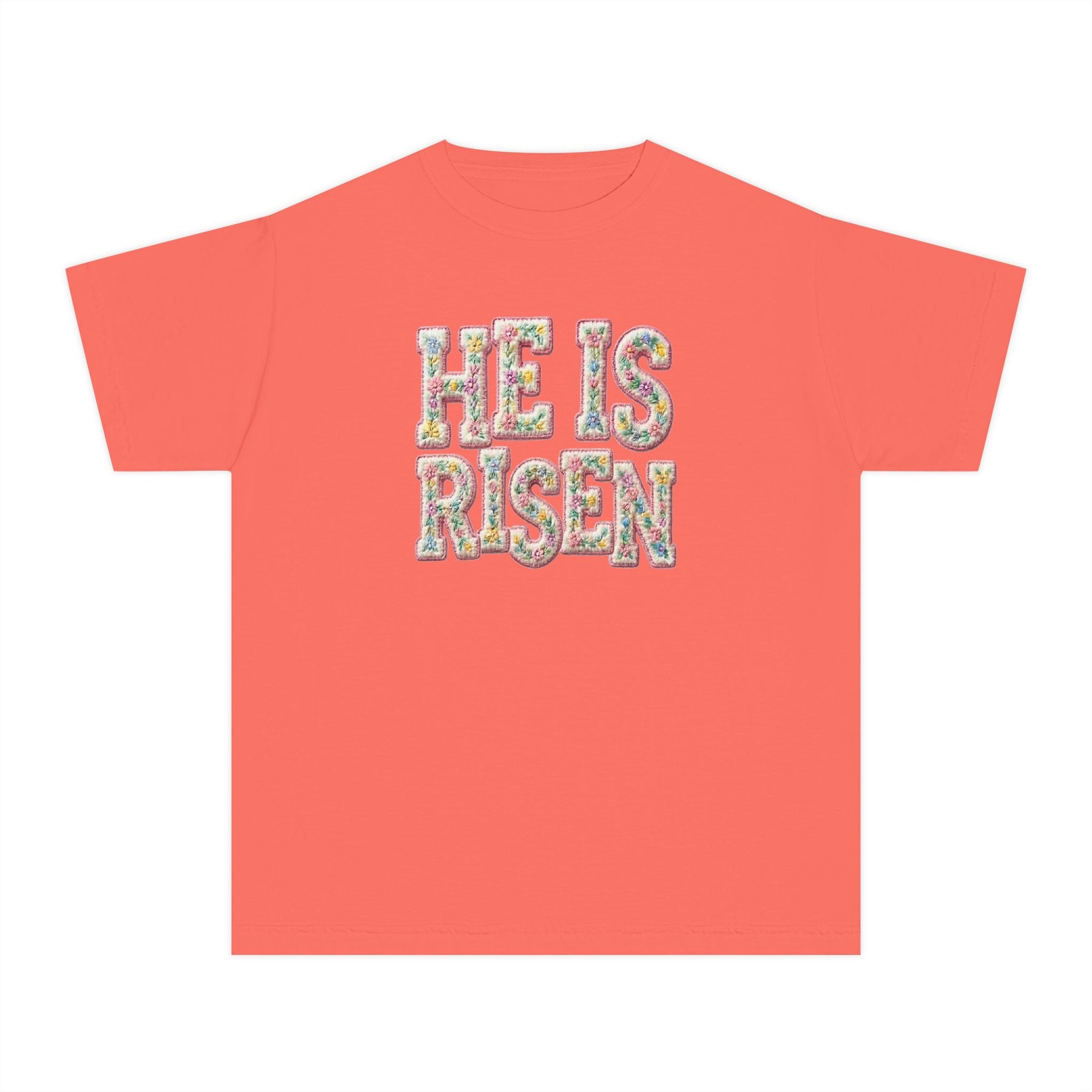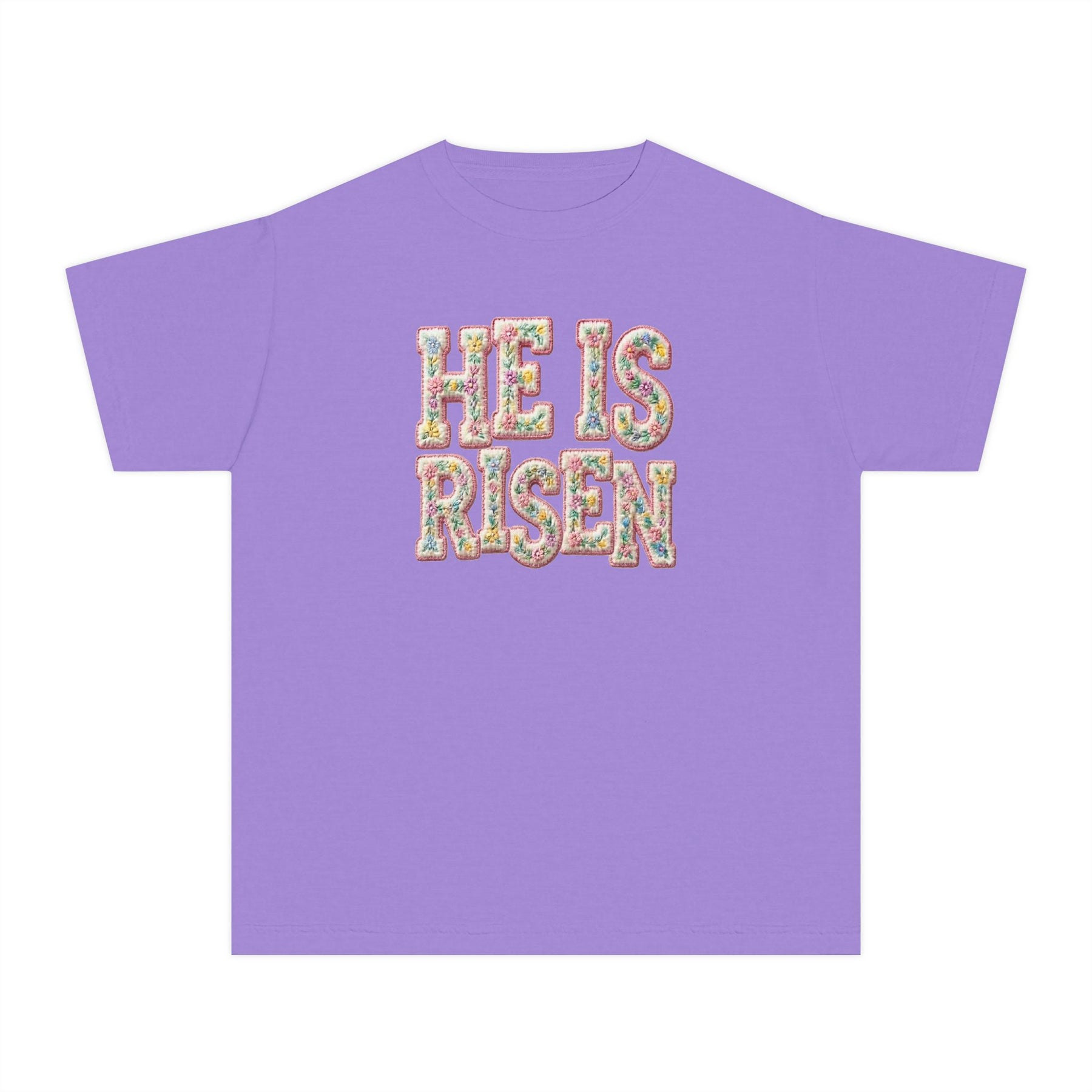 He is Risen Kids Tee: Embroidered HE IS RISEN letters with pastel floral motifs, perfect for active kids. Made from soft, 100% combed ringspun cotton.