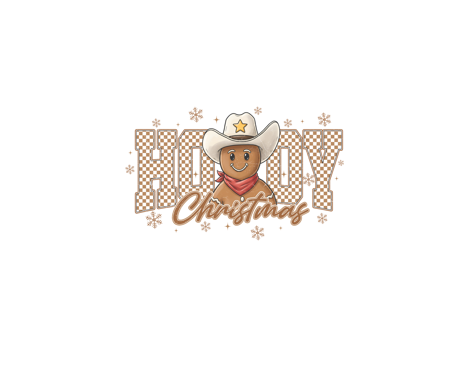Howdy Christmas Kids Tee featuring a cowboy-themed gingerbread cookie in a hat and bandana, surrounded by checkered HOWDY letters and snowflakes, perfect for festive occasions.