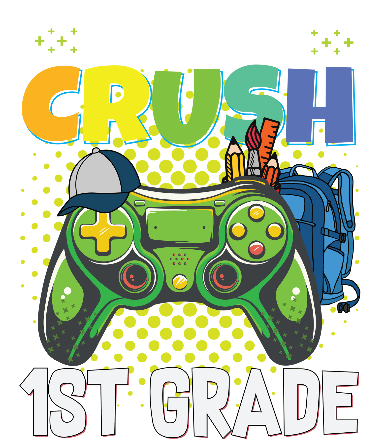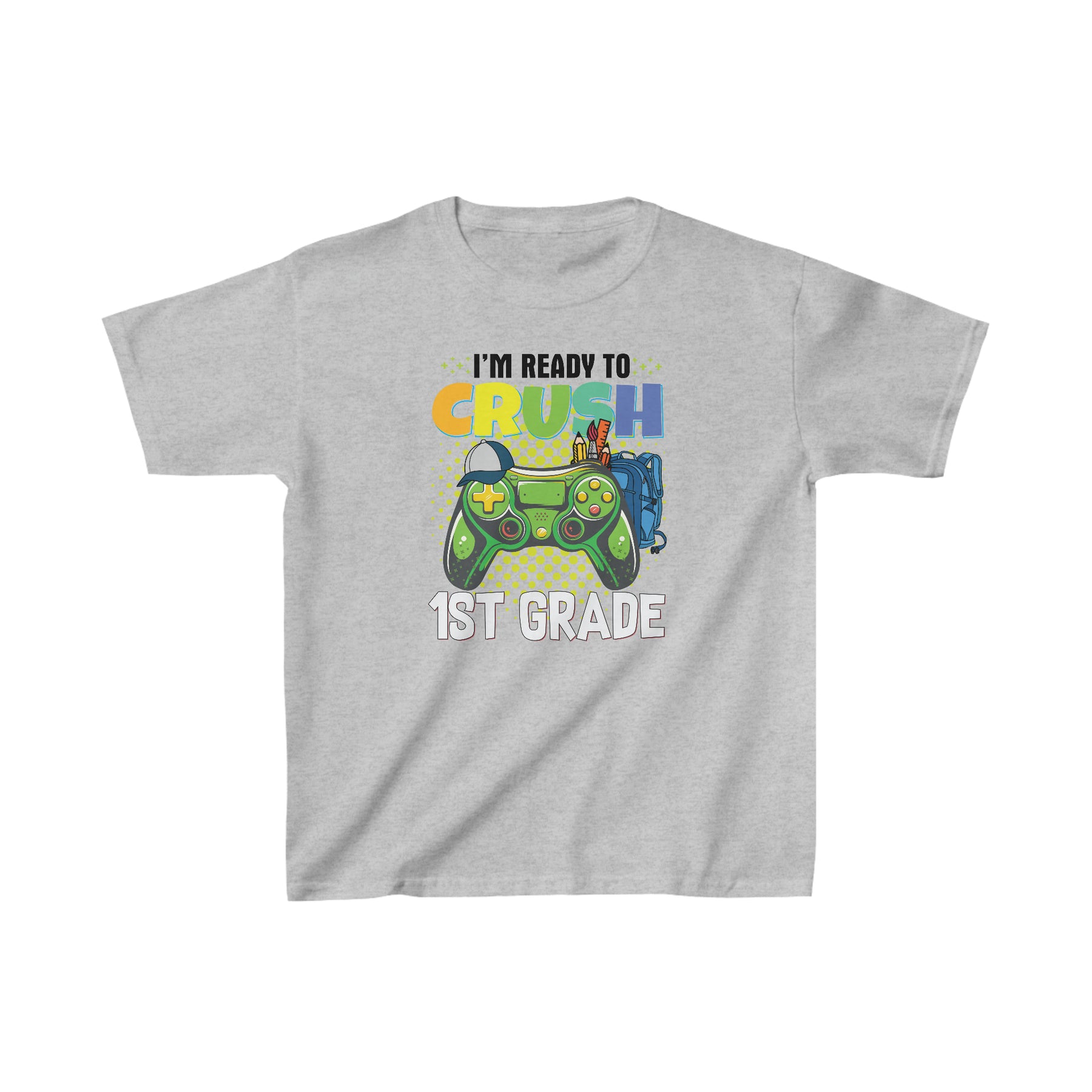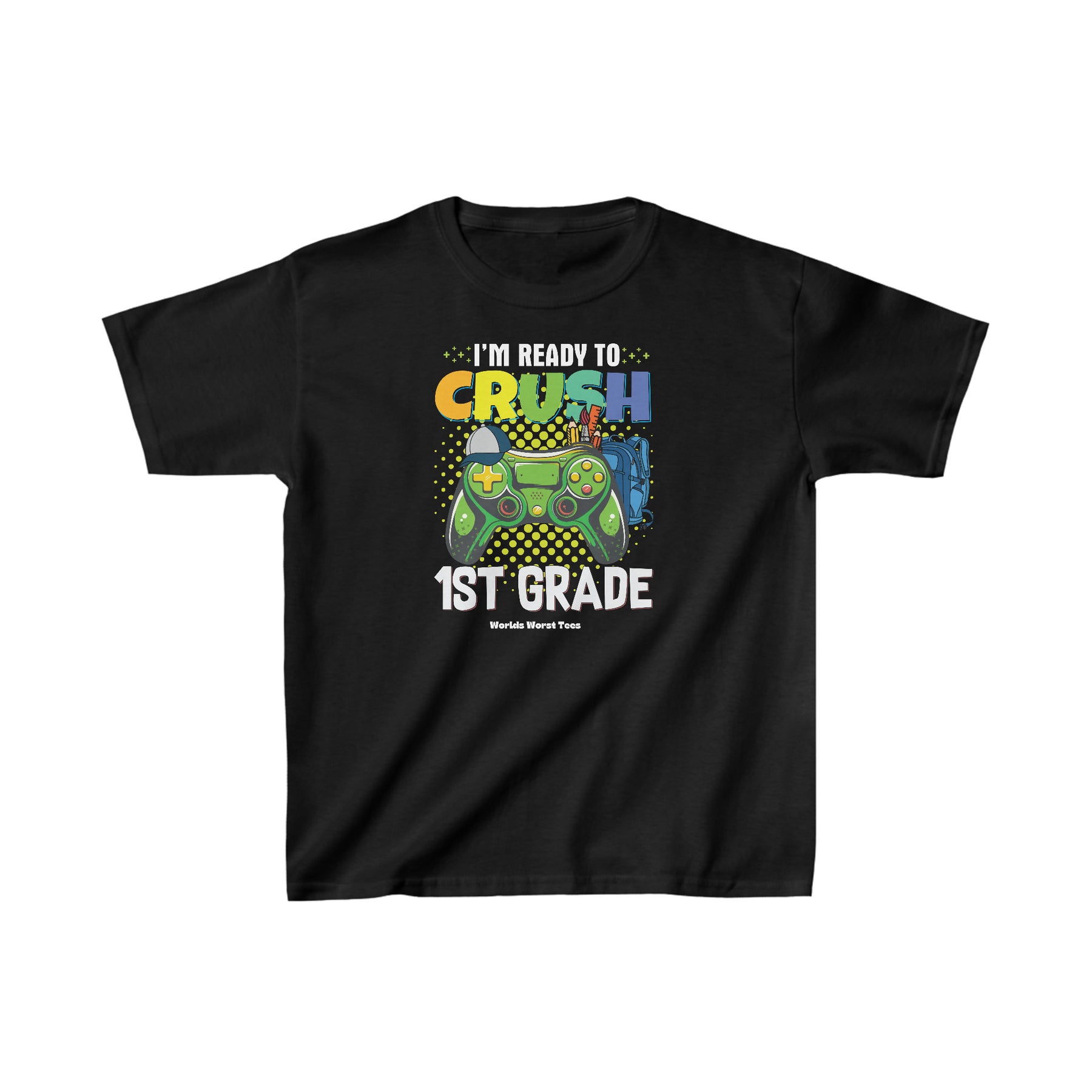 A kids tee for crushing 1st grade, featuring a game controller, backpack, and school supplies. 100% cotton, light fabric, tear-away label, classic fit. No side seams, durable twill tape shoulders, ribbed collar.