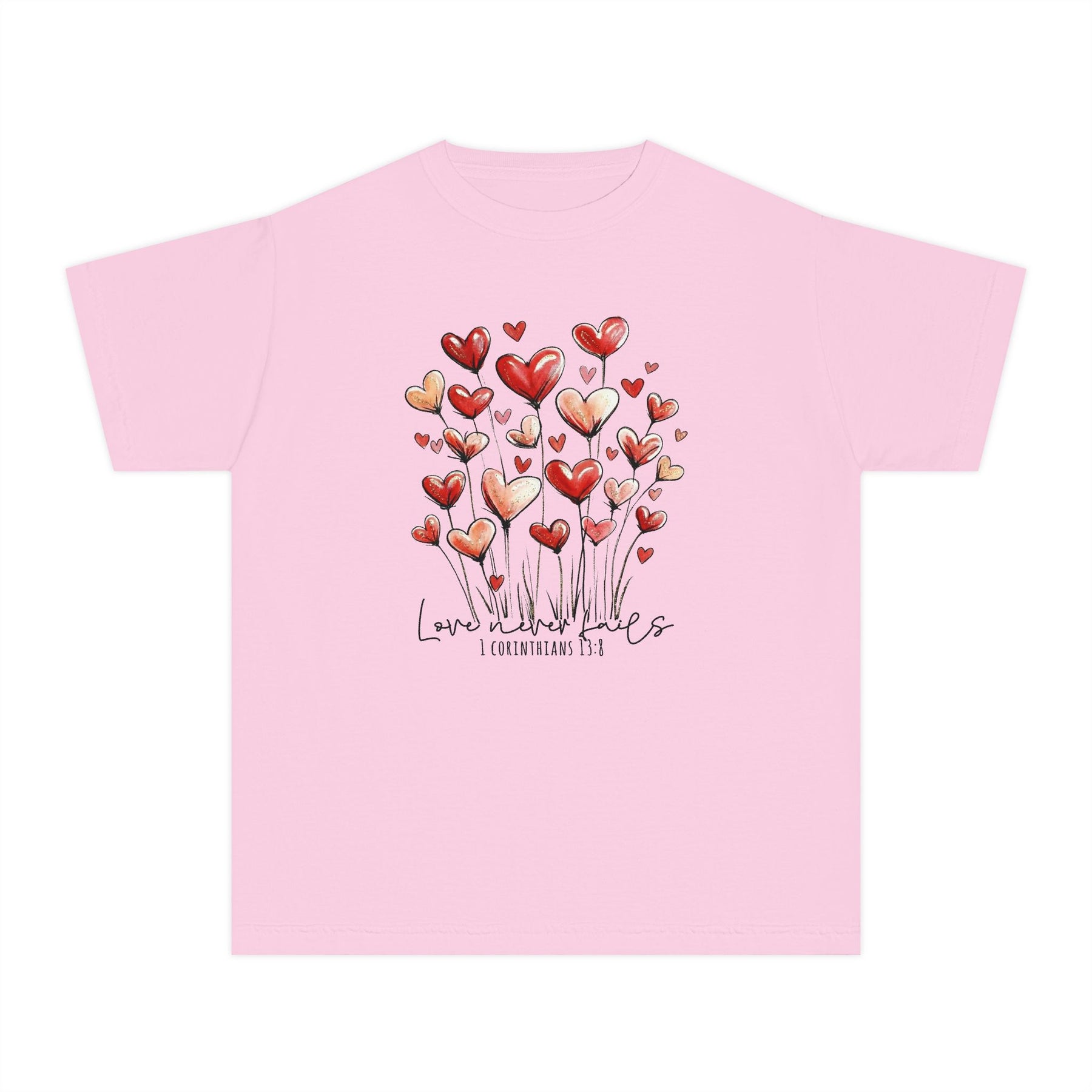 Love Never Fails Kids Tee featuring heart-shaped flowers and “Love never fails” with 1 Corinthians 13:8, in soft-washed, garment-dyed cotton for comfort and activity.
