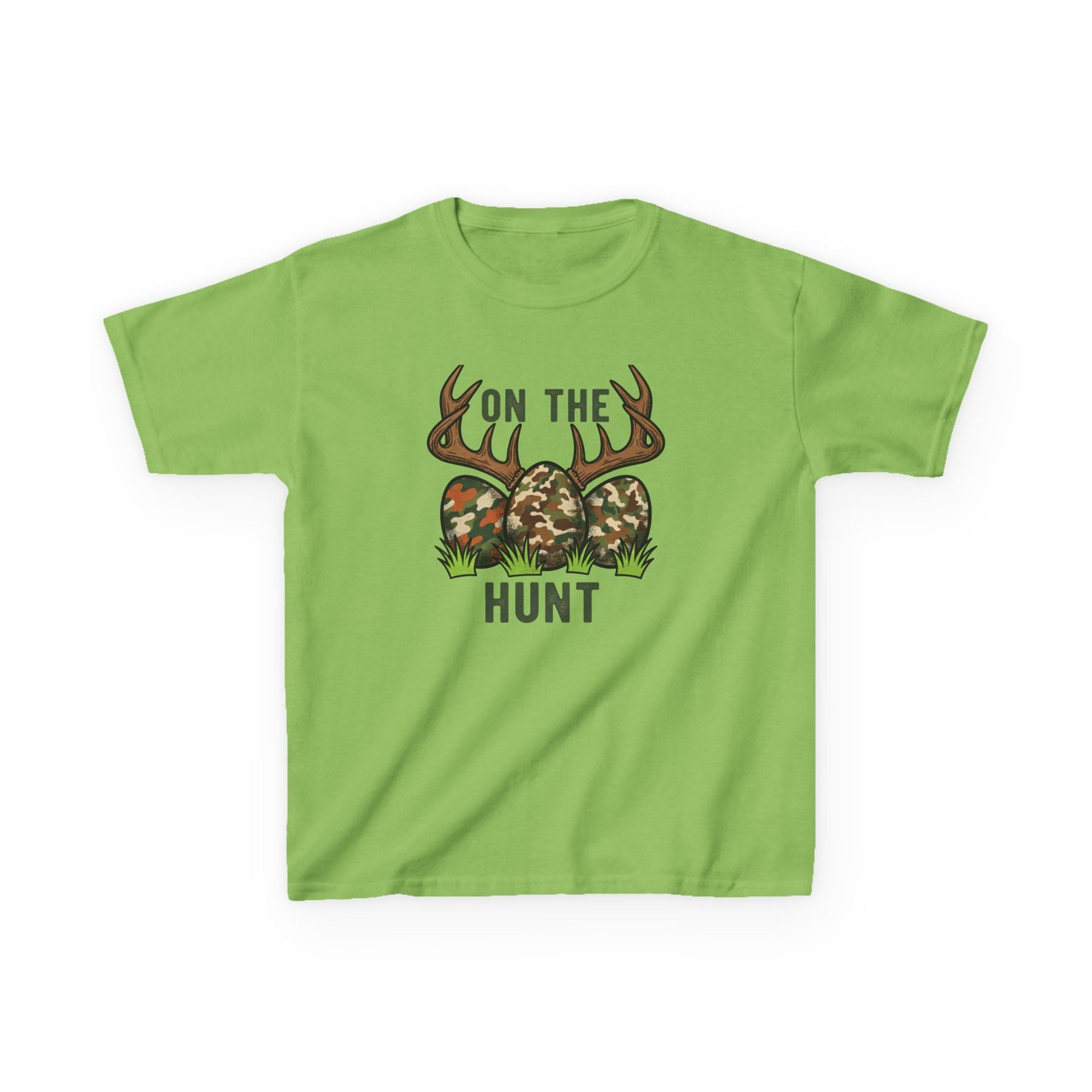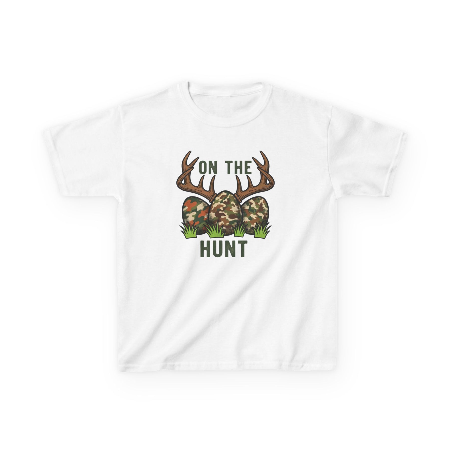 On the Hunt Kids Tee featuring camouflage eggs and antler design, blending Easter fun with hunting humor, perfect for everyday wear.