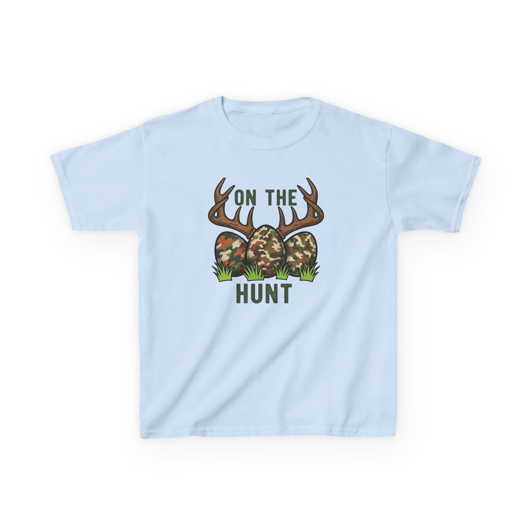 Light-blue On the Hunt Kids Tee with camo eggs, deer antlers, playful Easter-hunting graphic. Durable cotton, perfect for everyday wear.