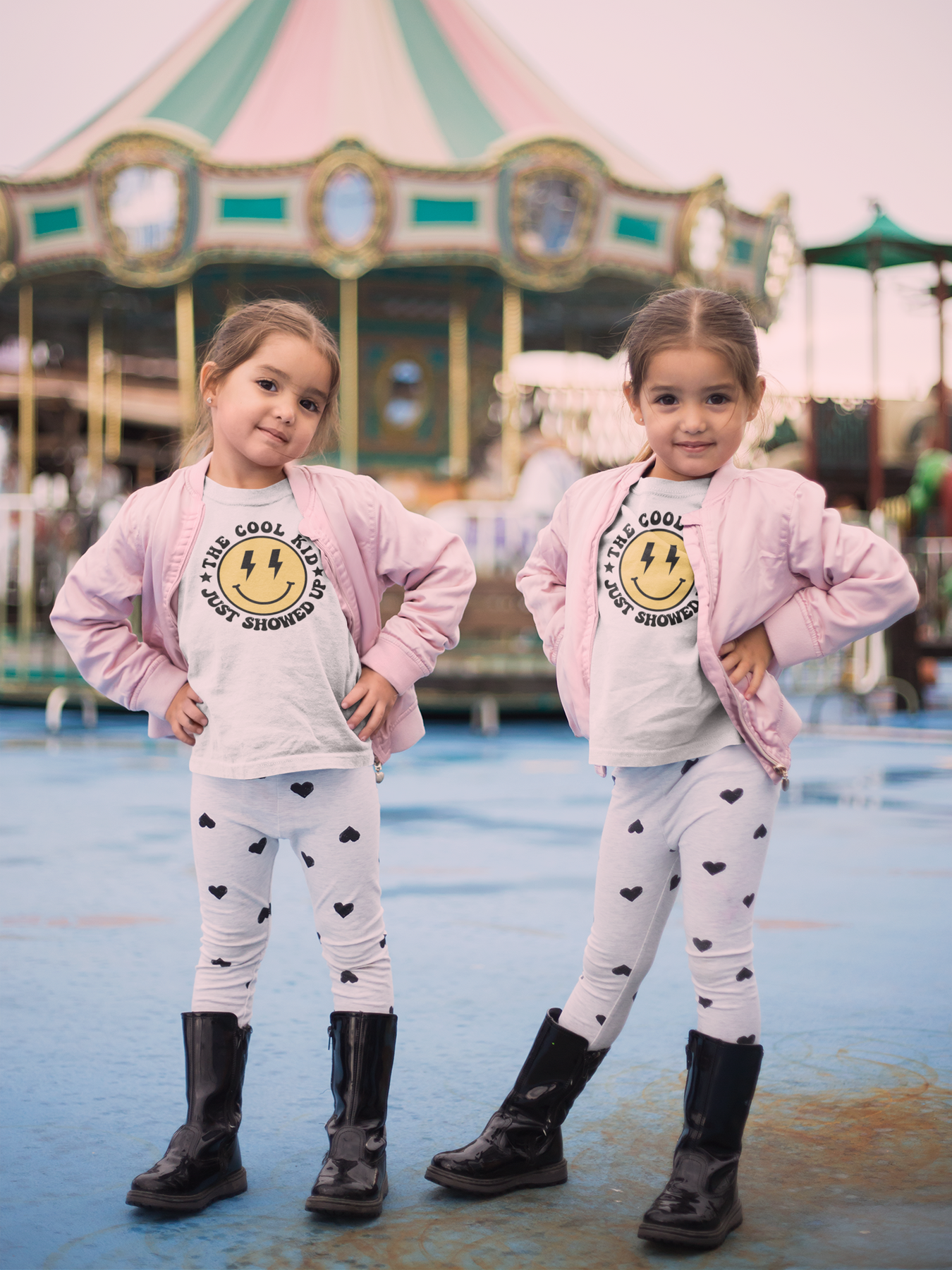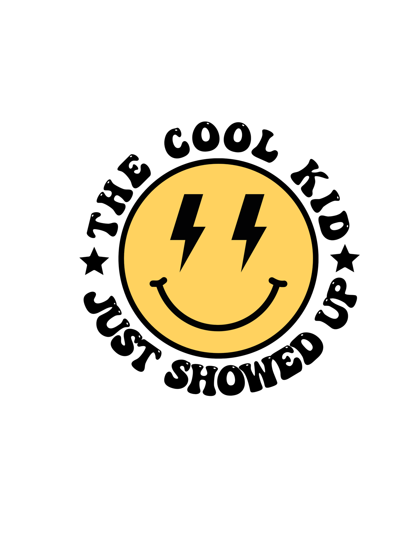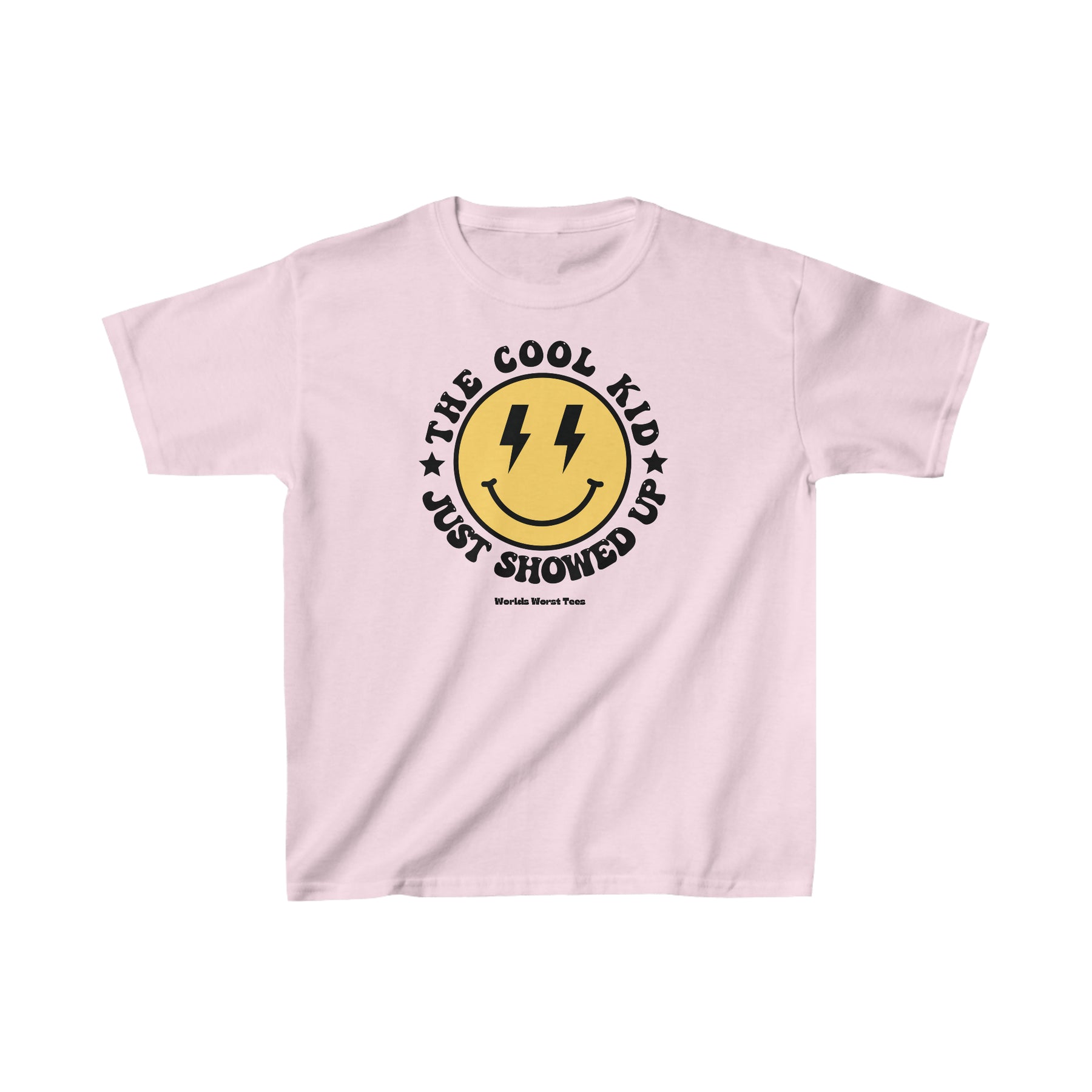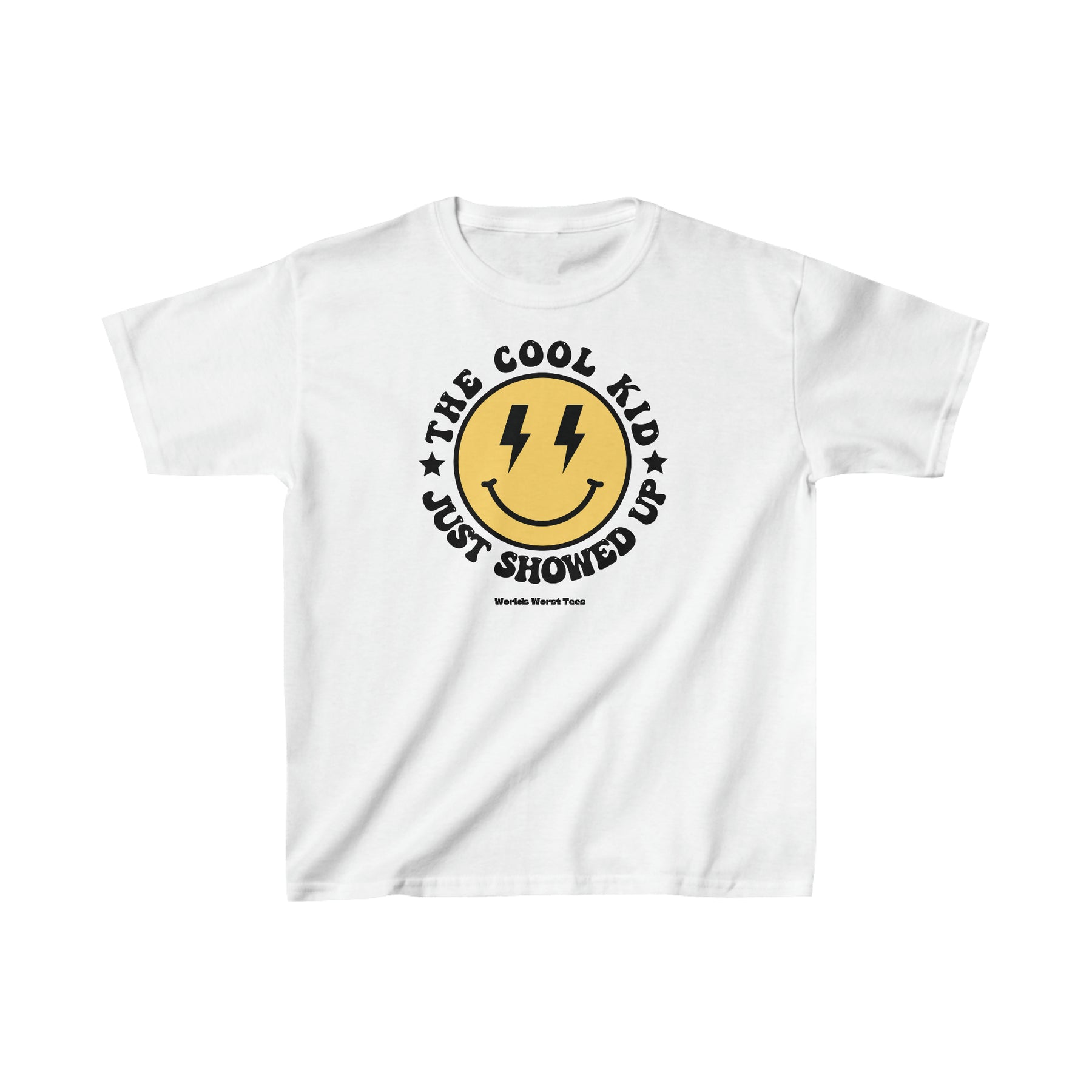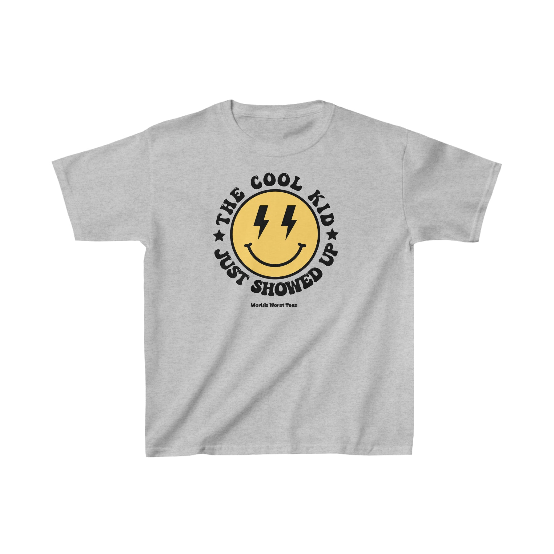 A kids heavy cotton tee featuring a yellow smiley face with lightning bolts and a smile. 100% cotton, light fabric, classic fit, tear-away label. The Cool Kid Just Showed Up by Worlds Worst Tees.