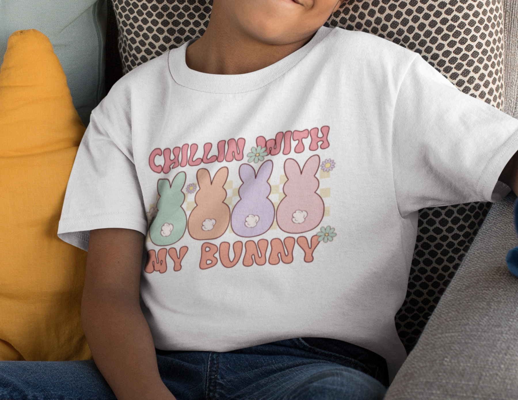 A boy lounging on a couch, wearing the Chillin With My Bunnies Kids Tee. Close-ups of a white shirt, fabric, and adorable bunny details. Perfect for everyday wear, 100% cotton, lightweight, classic fit.