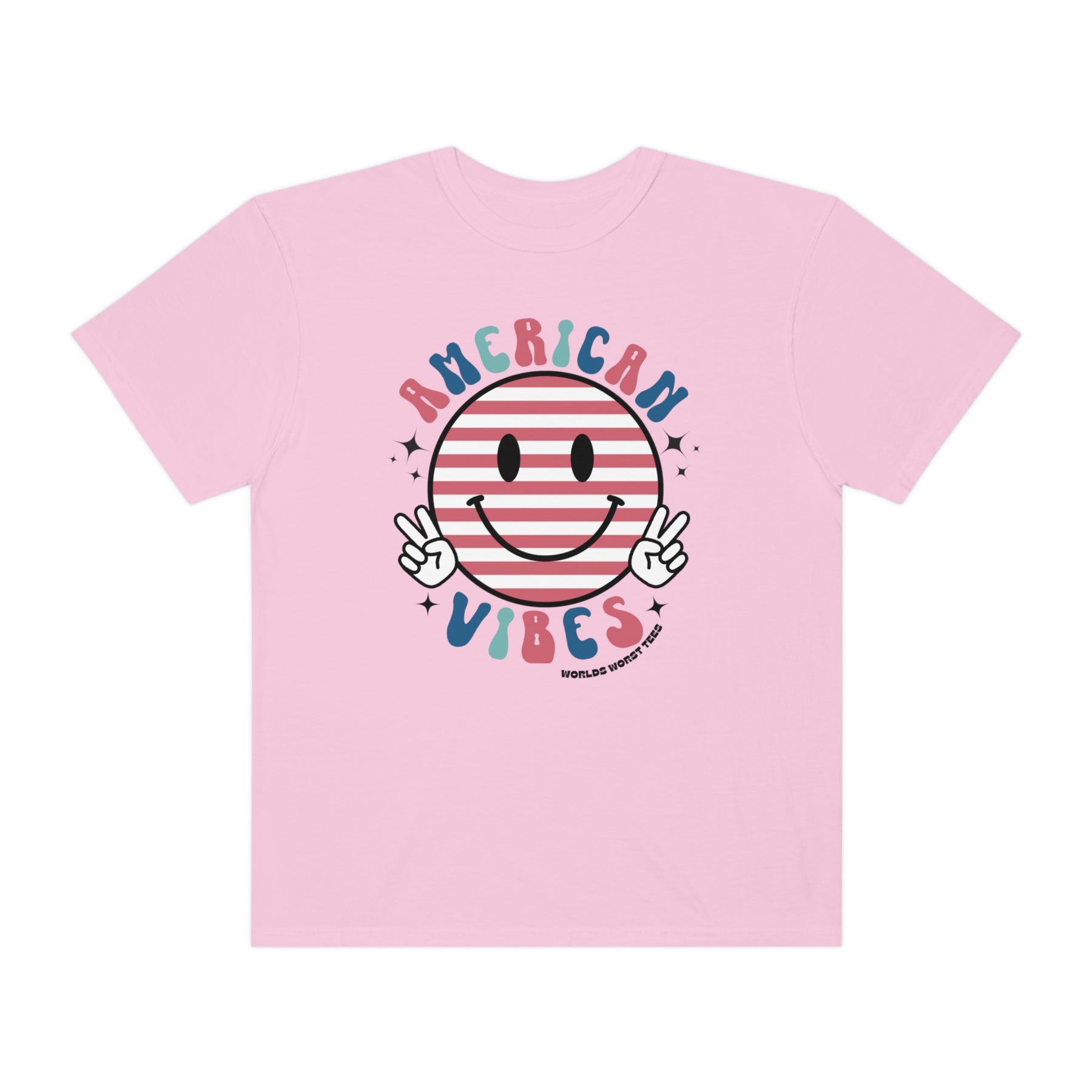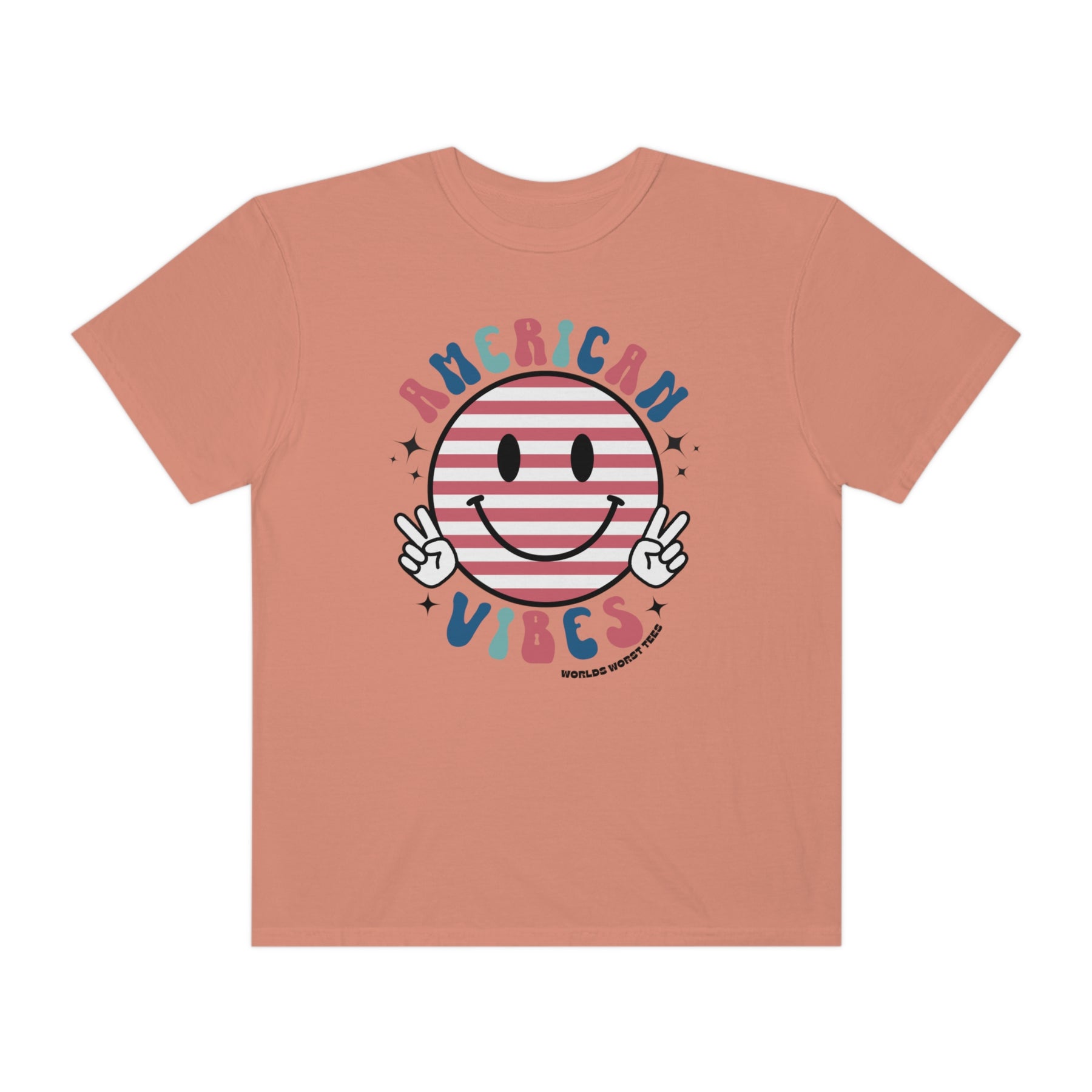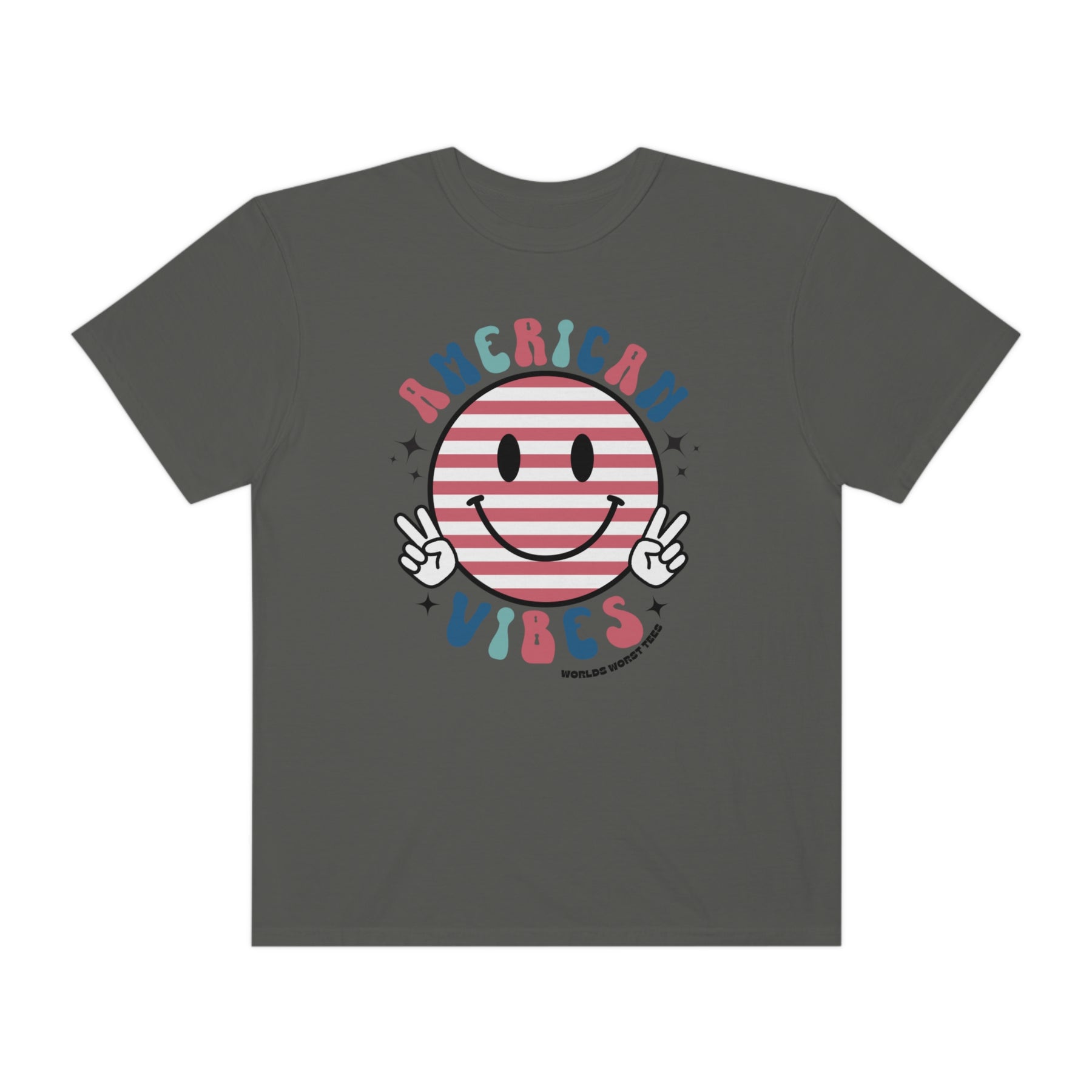 American Vibes Tee: A relaxed fit t-shirt featuring a smiley face and peace sign design. 100% ring-spun cotton, garment-dyed for extra coziness and durability. Ideal for daily wear.