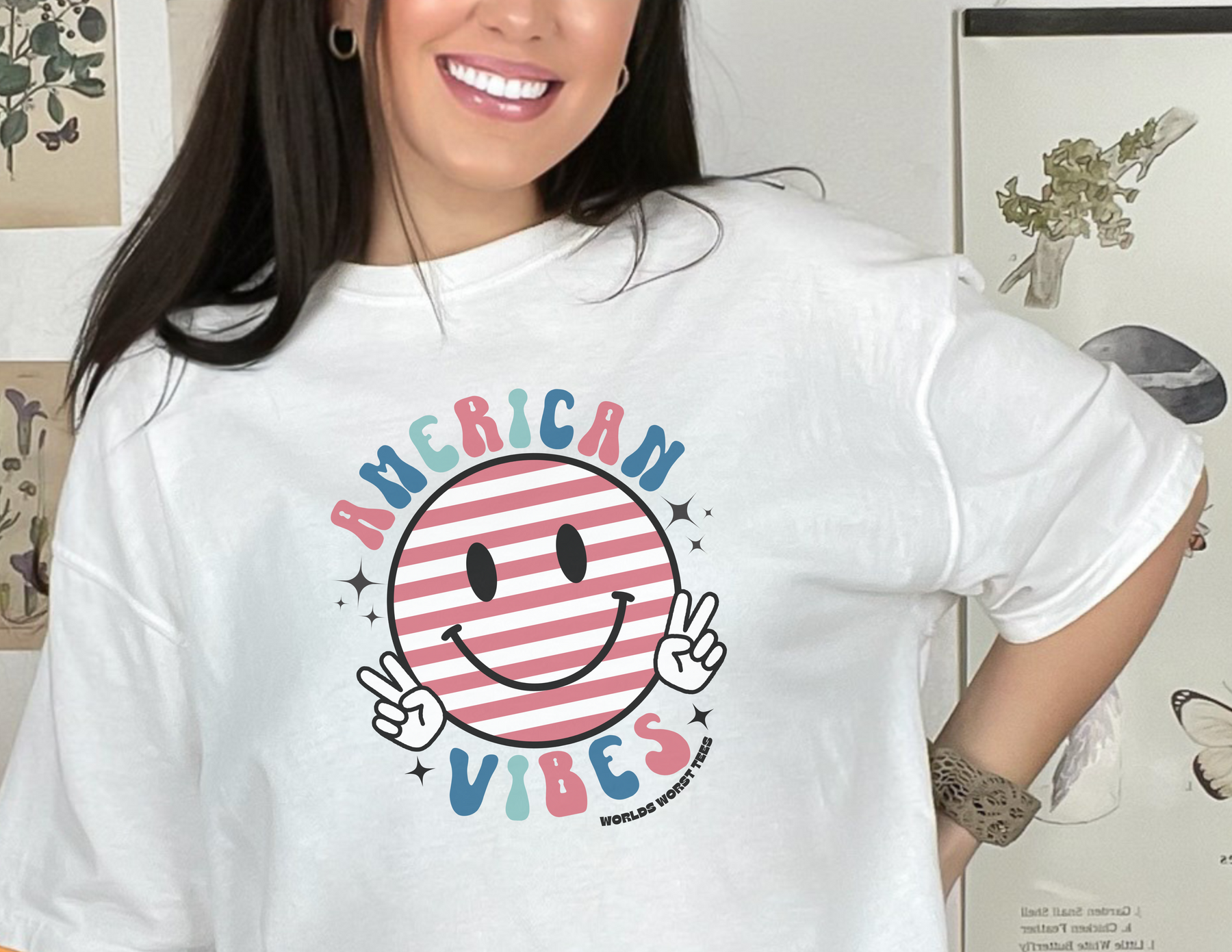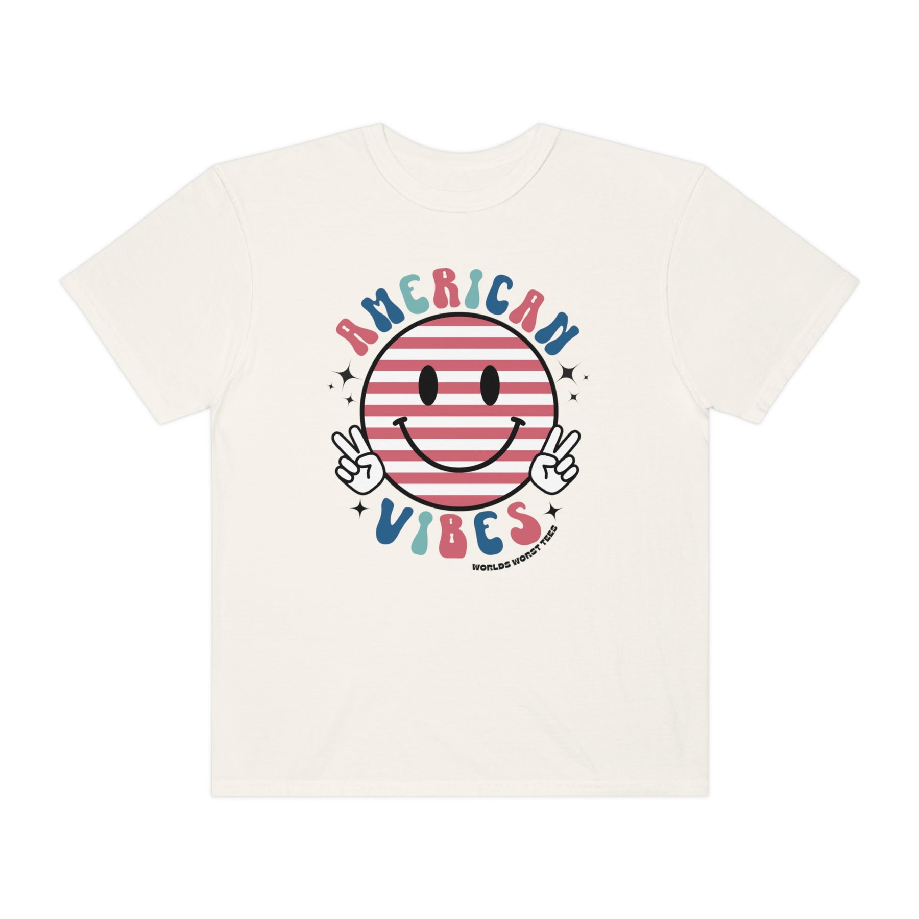 A relaxed fit American Vibes Tee, featuring a smiley face design on white cotton. Garment-dyed for coziness, with durable double-needle stitching and a seamless finish. Made for everyday comfort.