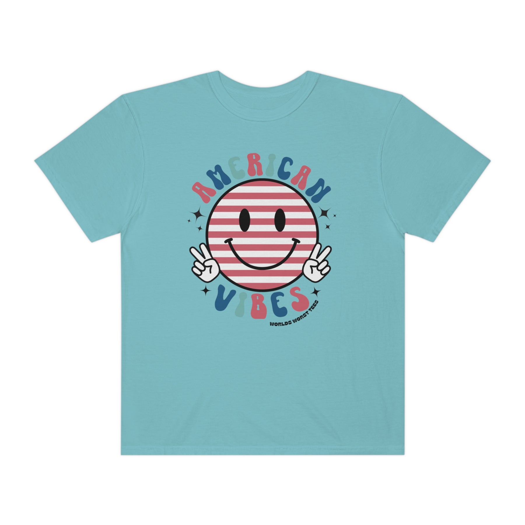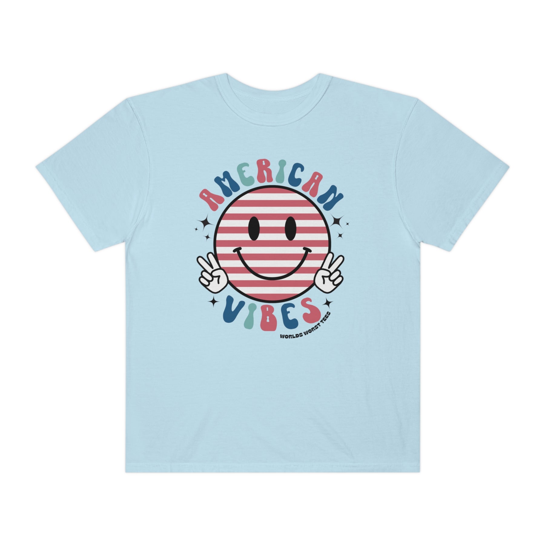 American Vibes Tee: A blue t-shirt featuring a smiley face and peace sign design. 100% ring-spun cotton, garment-dyed for extra coziness. Relaxed fit with double-needle stitching for durability.