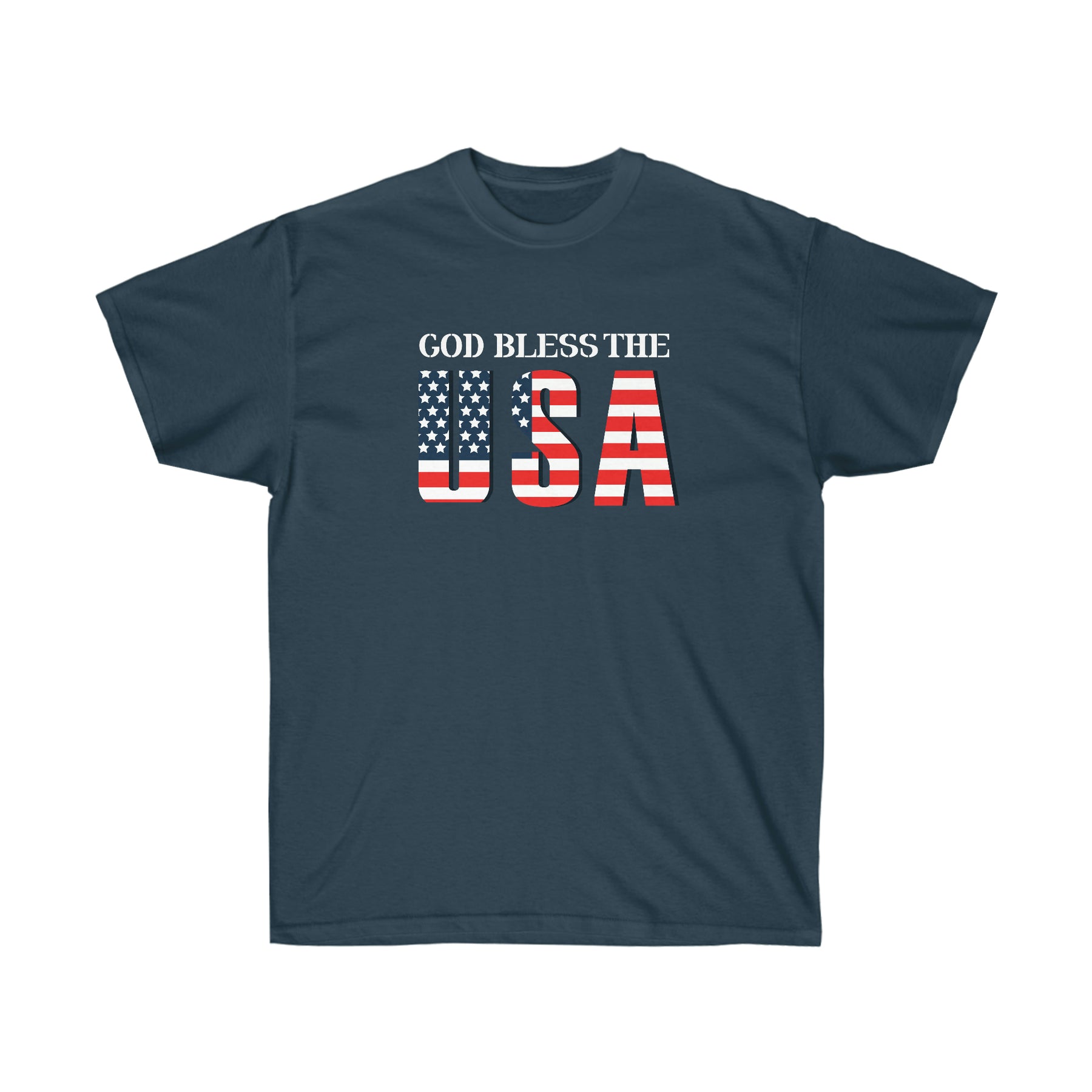 God Bless The USA Unisex Tee is made of ultra cotton and is a classic tee. Quality cotton construction means that designs are sure to shine. The shoulders are tapped for a good upper-body fit. There are no side seams, ensuring a clean, unbroken flow. The collar has ribbed knitting for improved elasticity. The materials that went into this product are sustainably sourced and economically friendly.