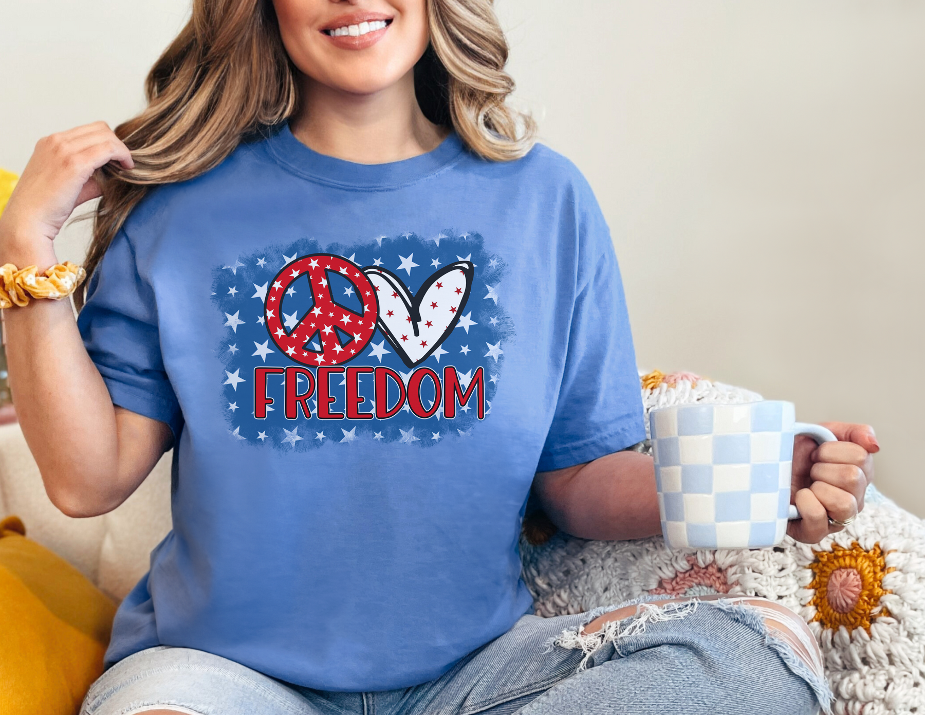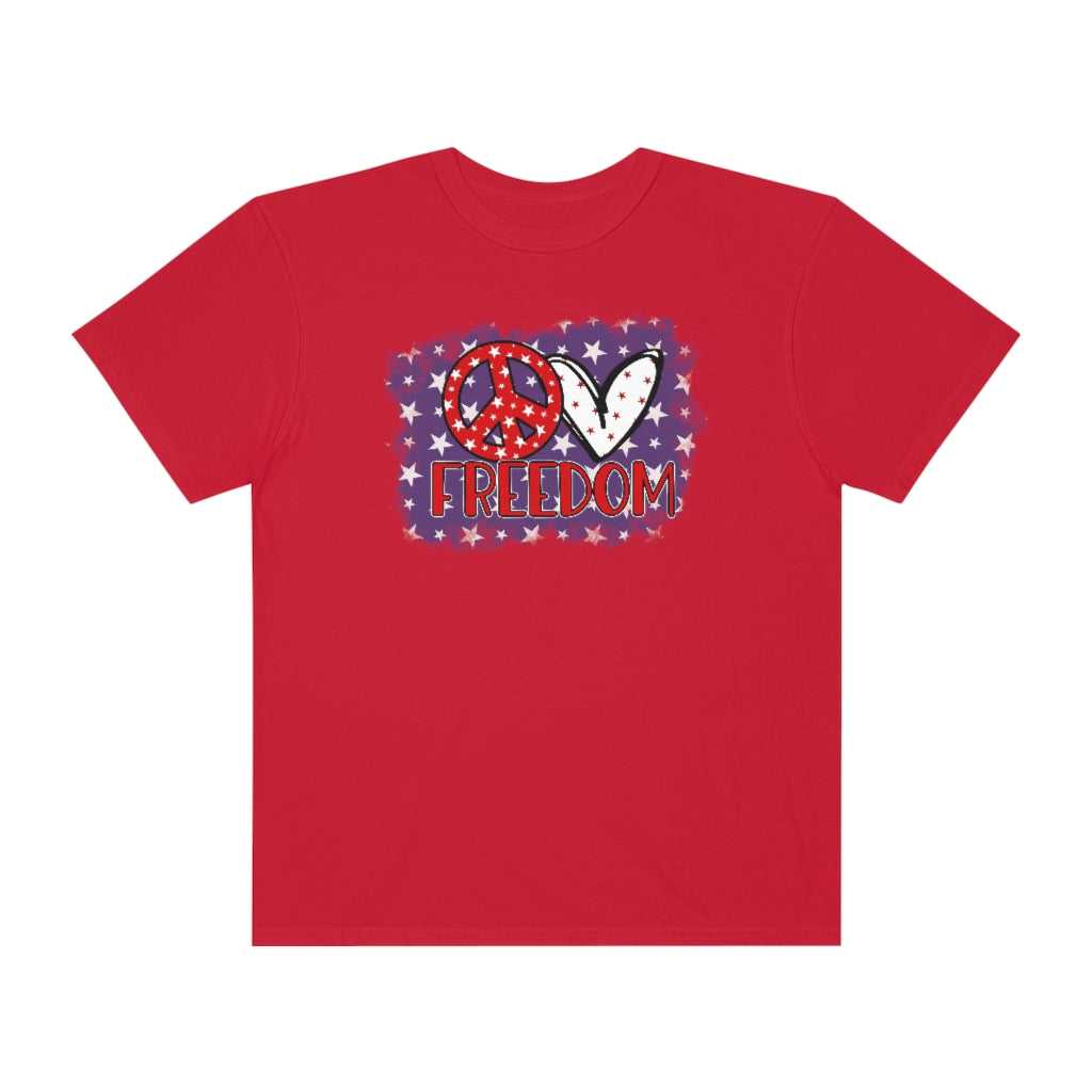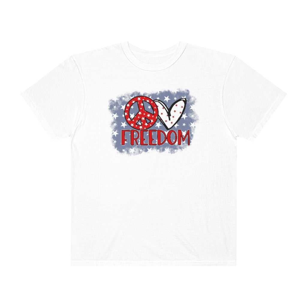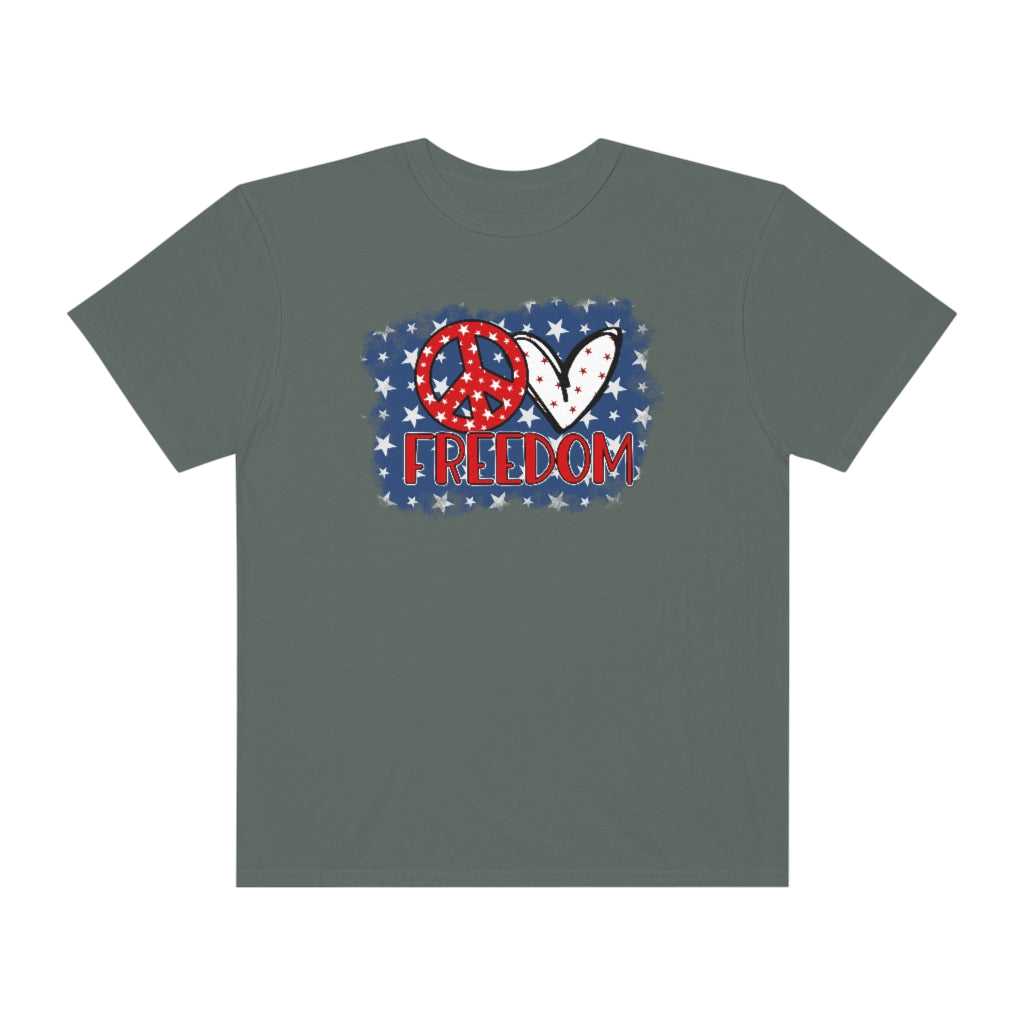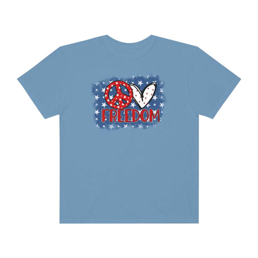 Love Freedom Tee is a garment-dyed t-shirt made 100% with ring-spun cotton. The soft-washed, garment-dyed fabric brings extra coziness to your wardrobe while the relaxed fit makes it an excellent daily choice. The double-needle stitching throughout the tee makes it highly durable while the lack of side-seams helps the shirt retain its tubular shape.