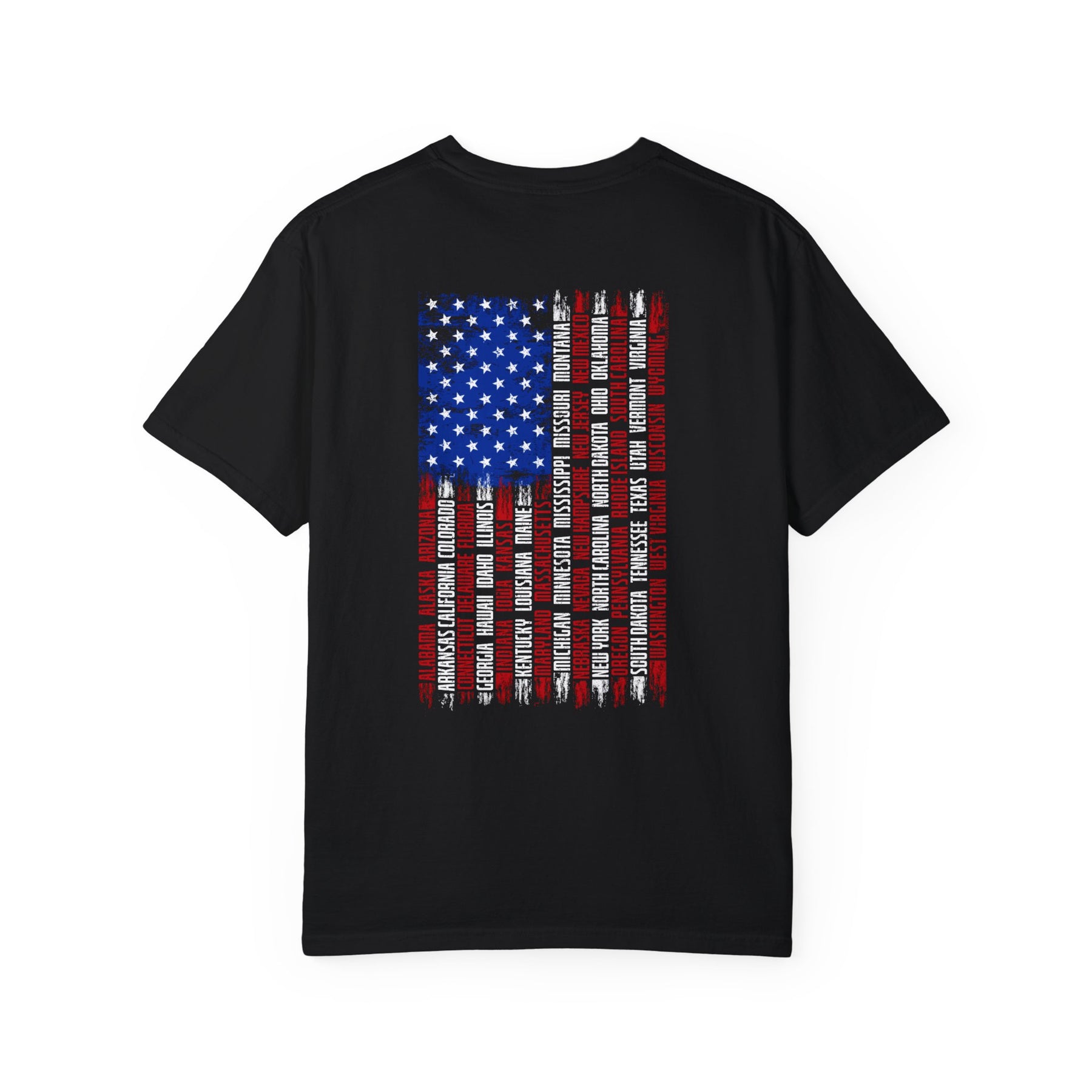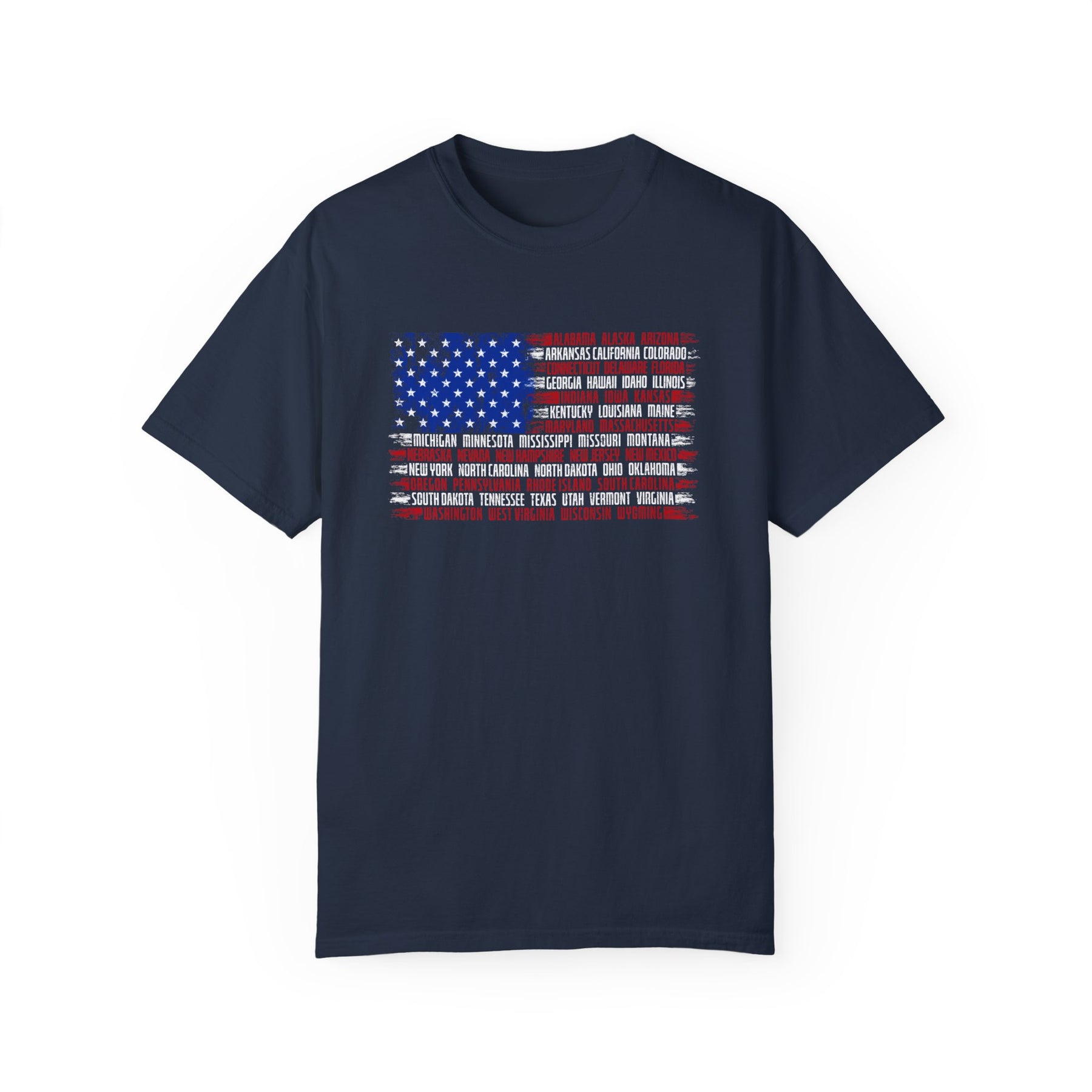 A relaxed fit State Flag Tee crafted from 100% ring-spun cotton, featuring a flag design on a blue shirt. Garment-dyed for extra coziness, with durable double-needle stitching and a seamless tubular shape.