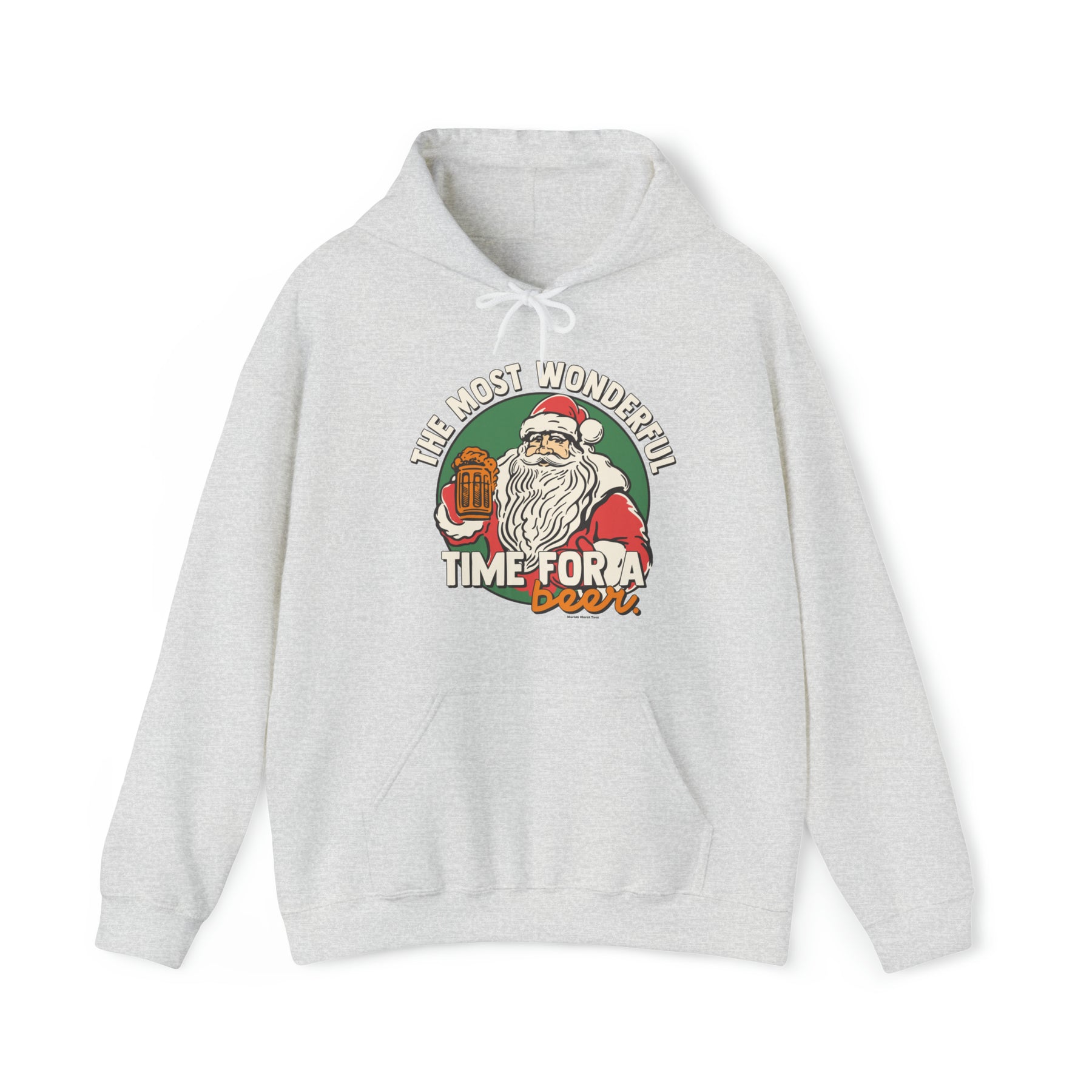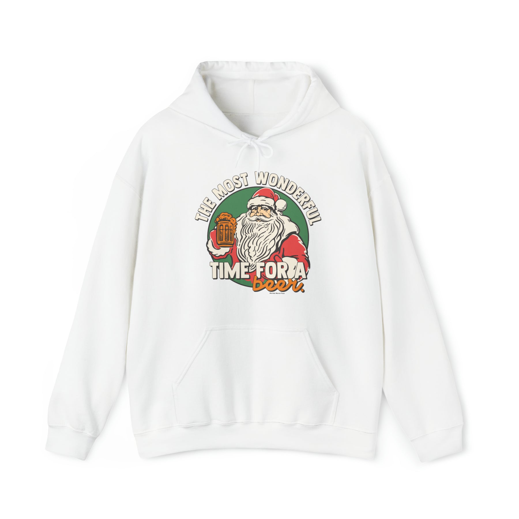 Unisex Most Wonderful Time for a Beer hoodie, featuring Santa Claus design on a white sweatshirt. Heavy blend fabric, kangaroo pocket, and drawstring hood. Perfect for warmth and comfort.