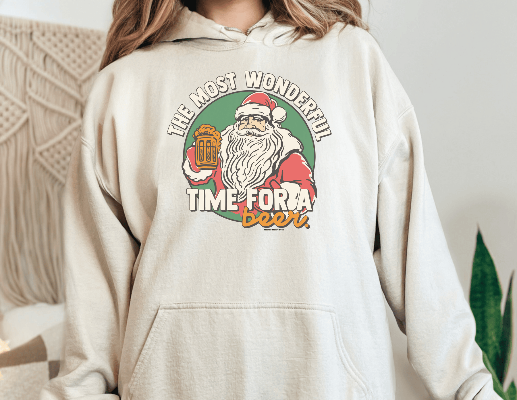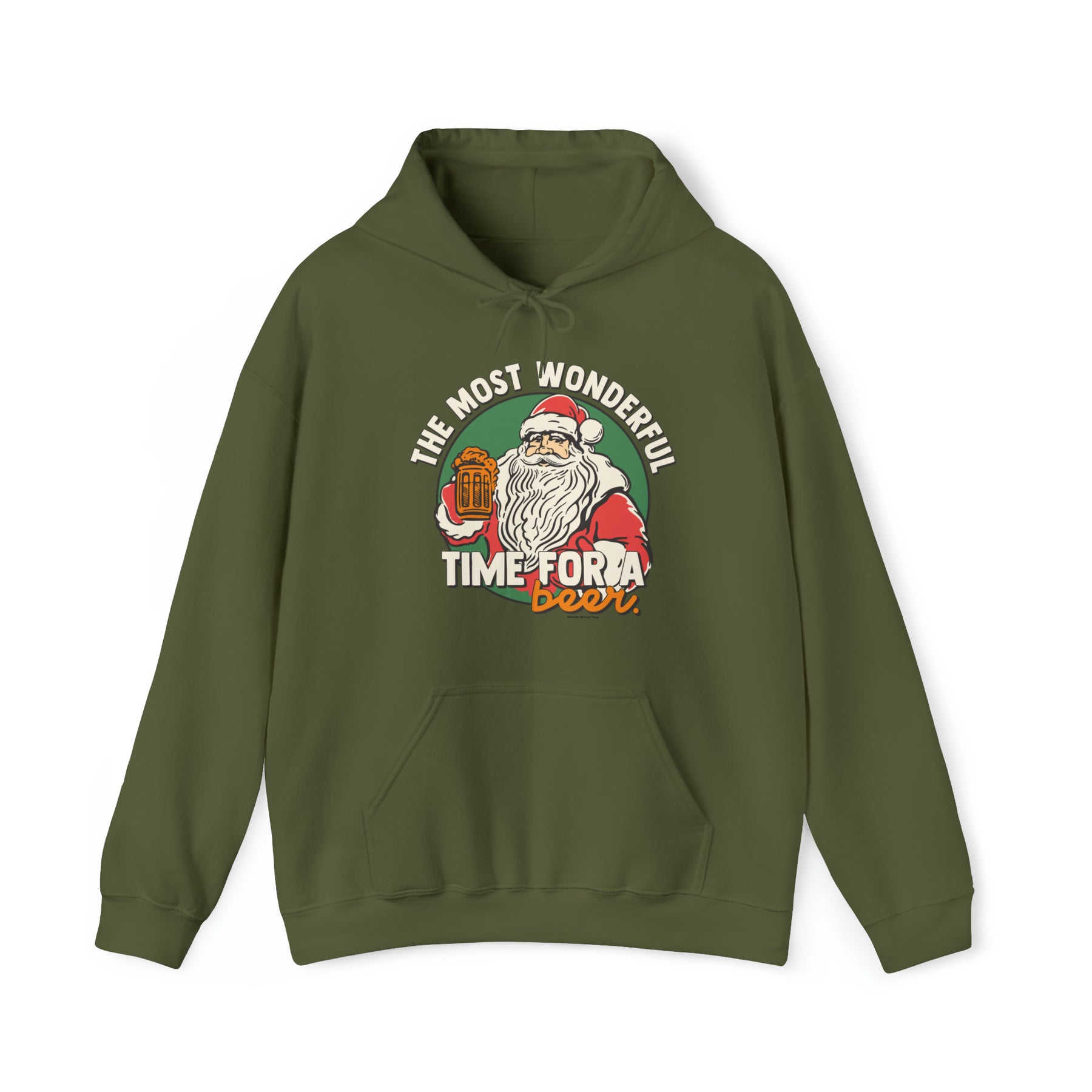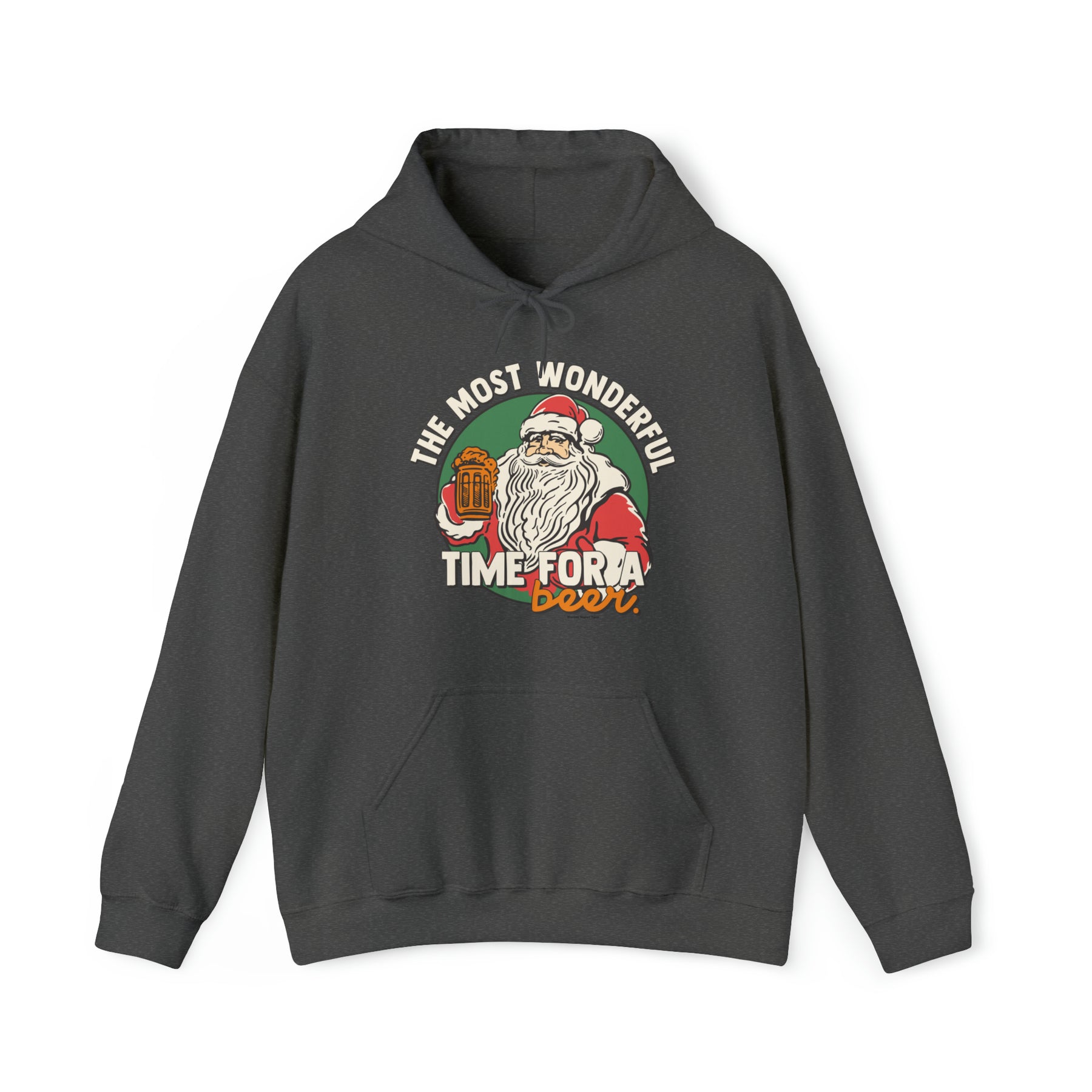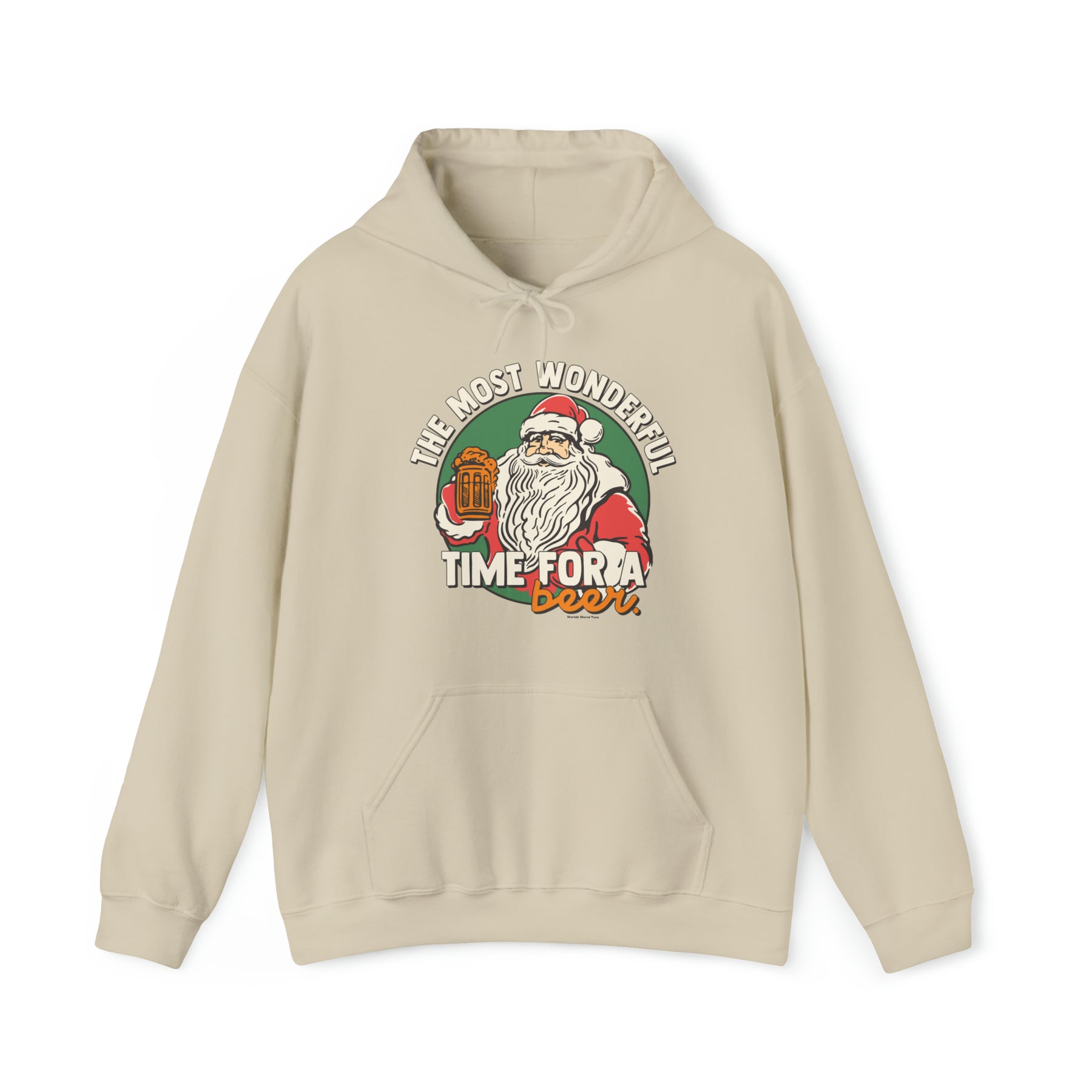 A cozy Most Wonderful Time for a Beer Hoodie featuring Santa Claus holding a beer, with a kangaroo pocket and drawstring hood. Made of 50% cotton, 50% polyester, perfect for warmth and comfort. Classic fit, tear-away label.