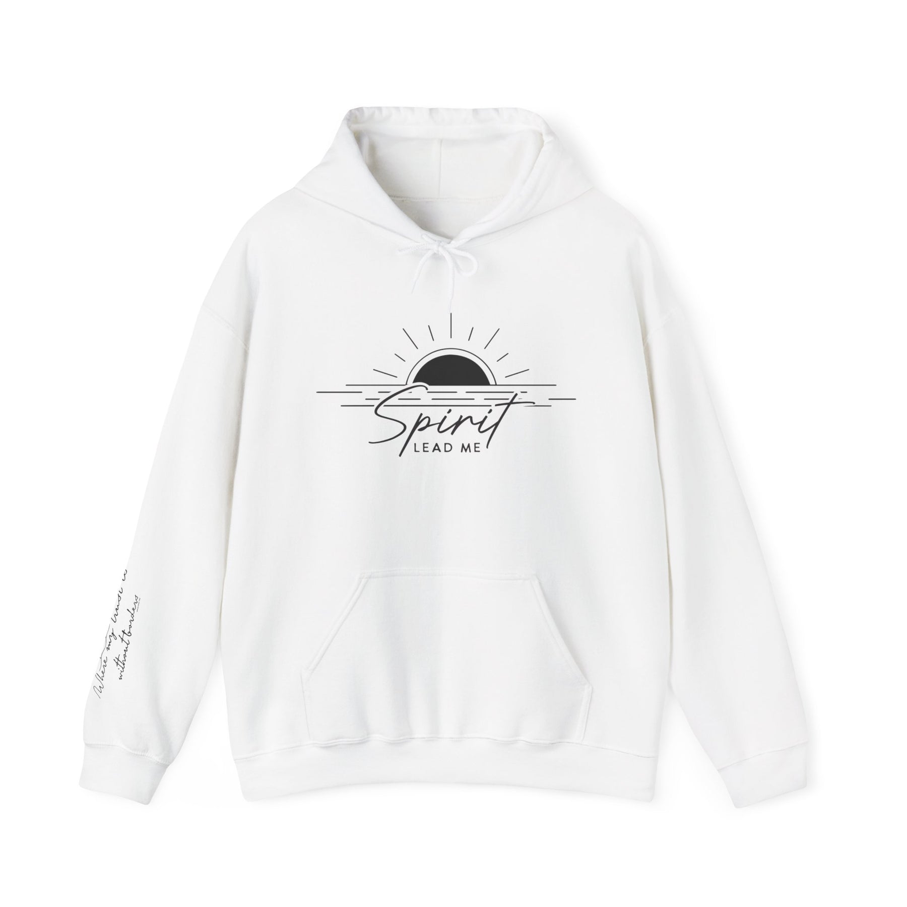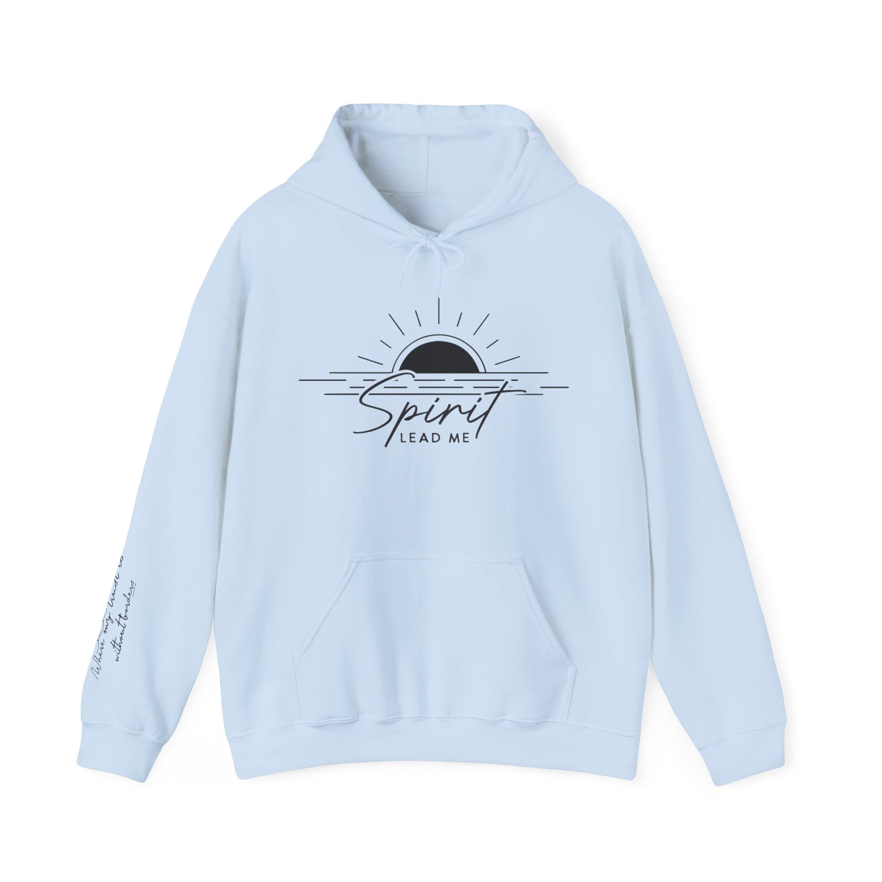 A black Spirit Lead Me Hoodie with white text, featuring a sun and water logo on the front. Unisex heavy blend hooded sweatshirt made of 50% cotton, 50% polyester, with a kangaroo pocket and matching drawstring.