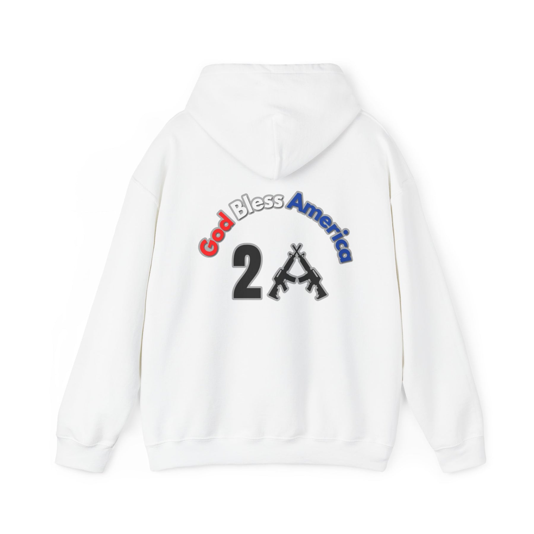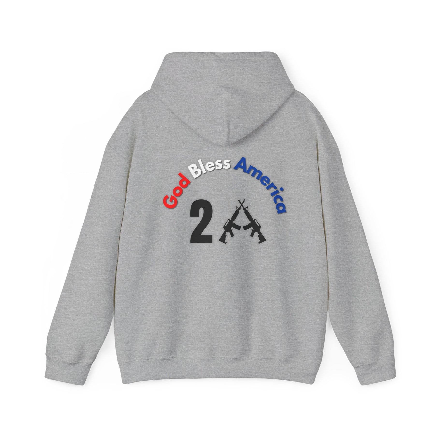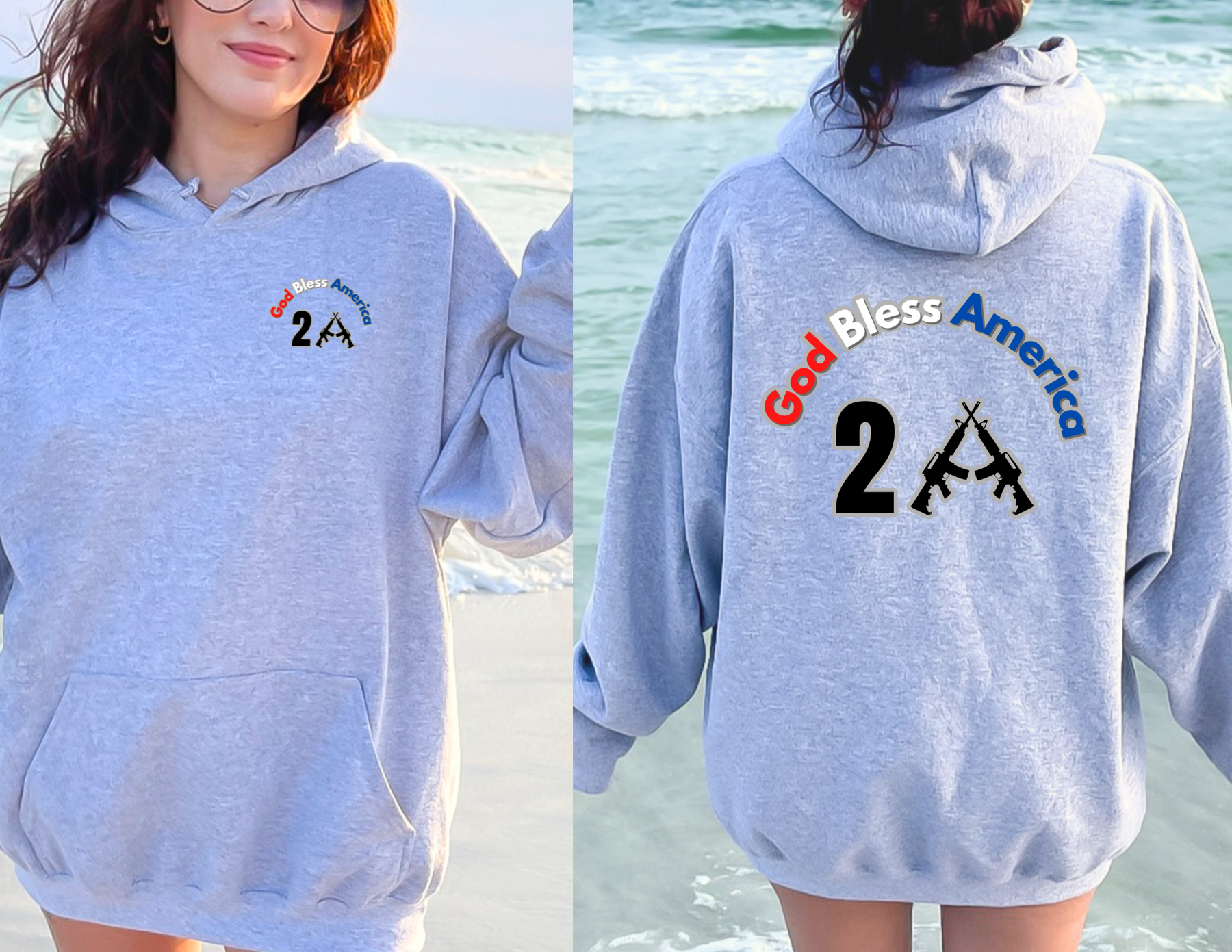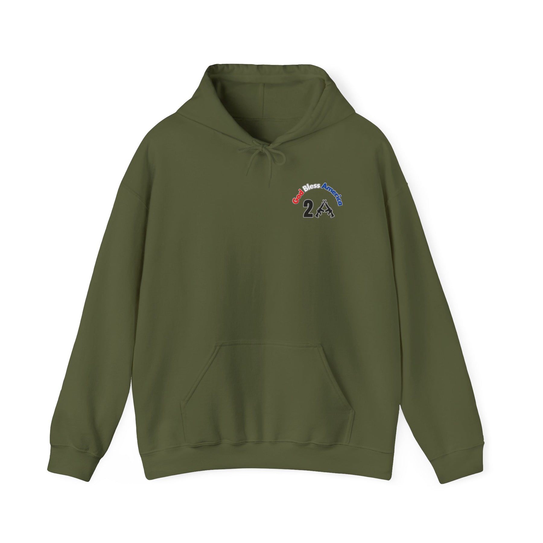 God Bless America 2A Hooded Sweatshirt is a unisex heavy blend hooded sweatshirt that is relaxation itself. The material is a thick blend of cotton and polyester. This makes for a plush, soft feel alongside warmth. It's also a great surface for printing. There are no side seams. A spacious kangaroo pocket hangs in front. The hood's drawstring is the same color as the base sweater.