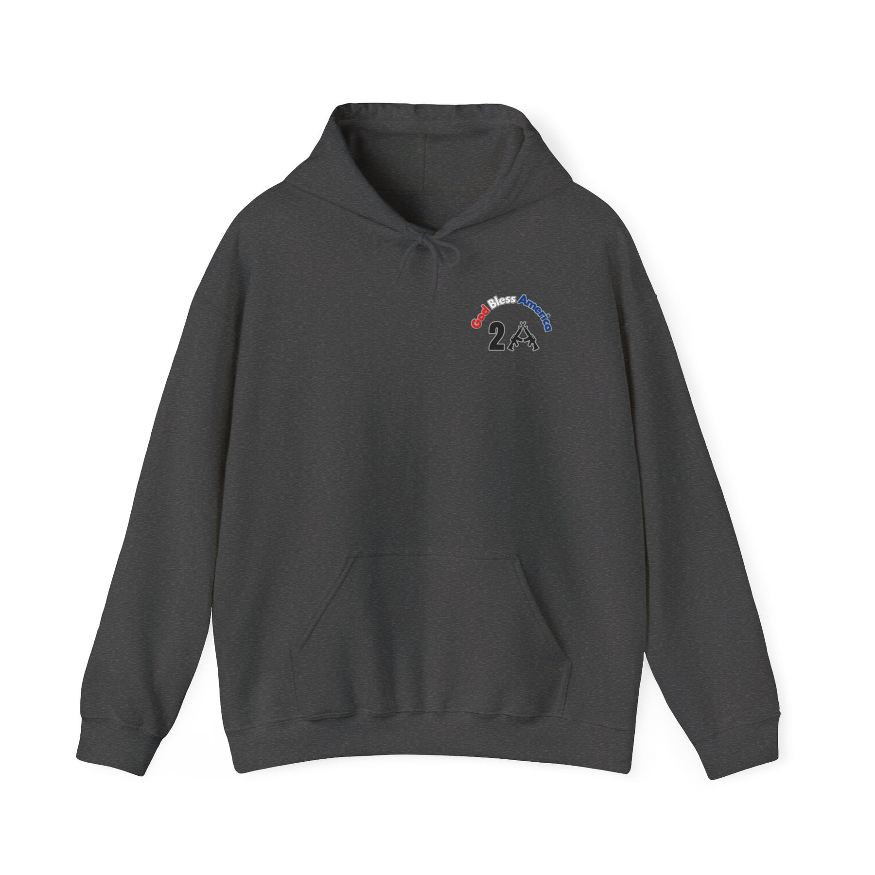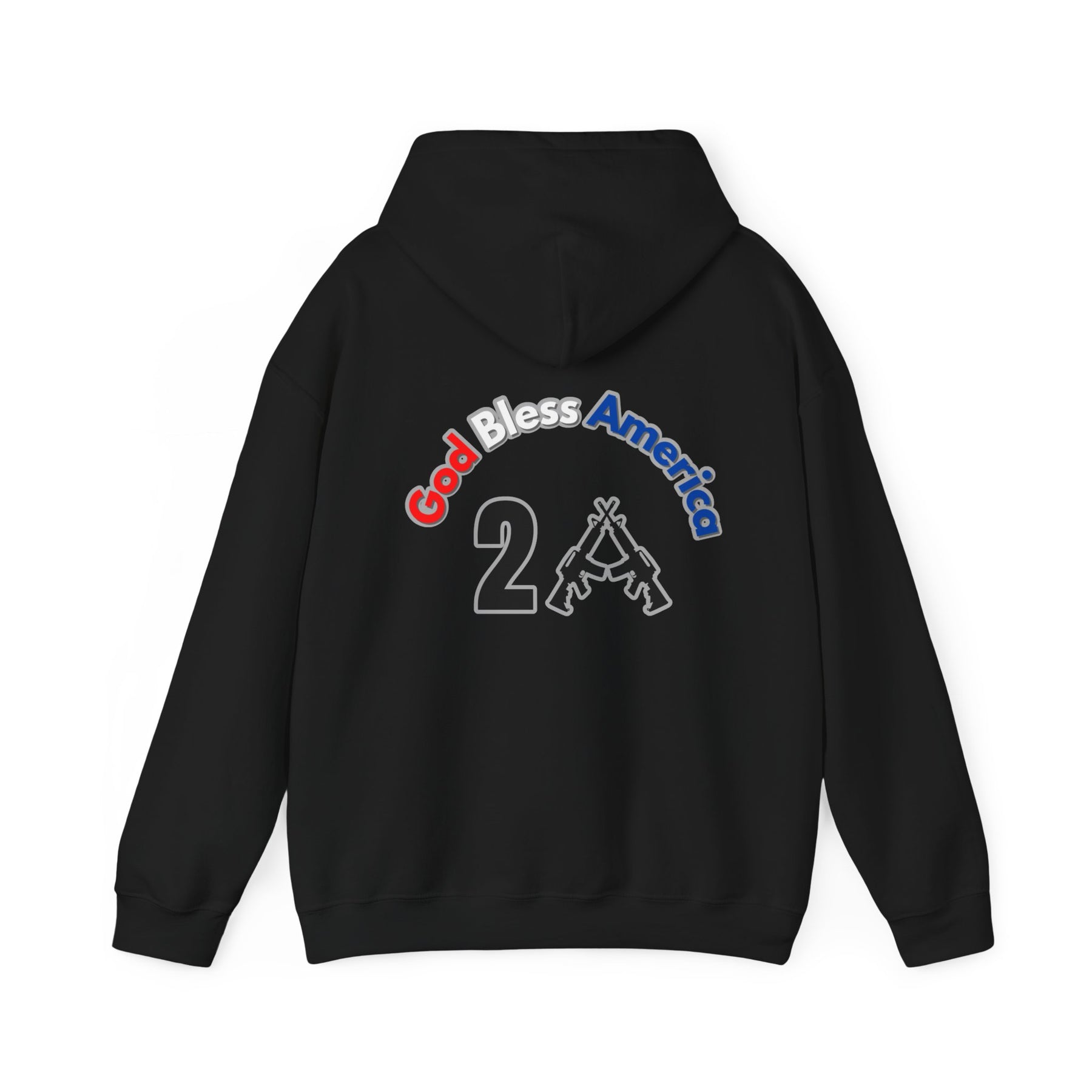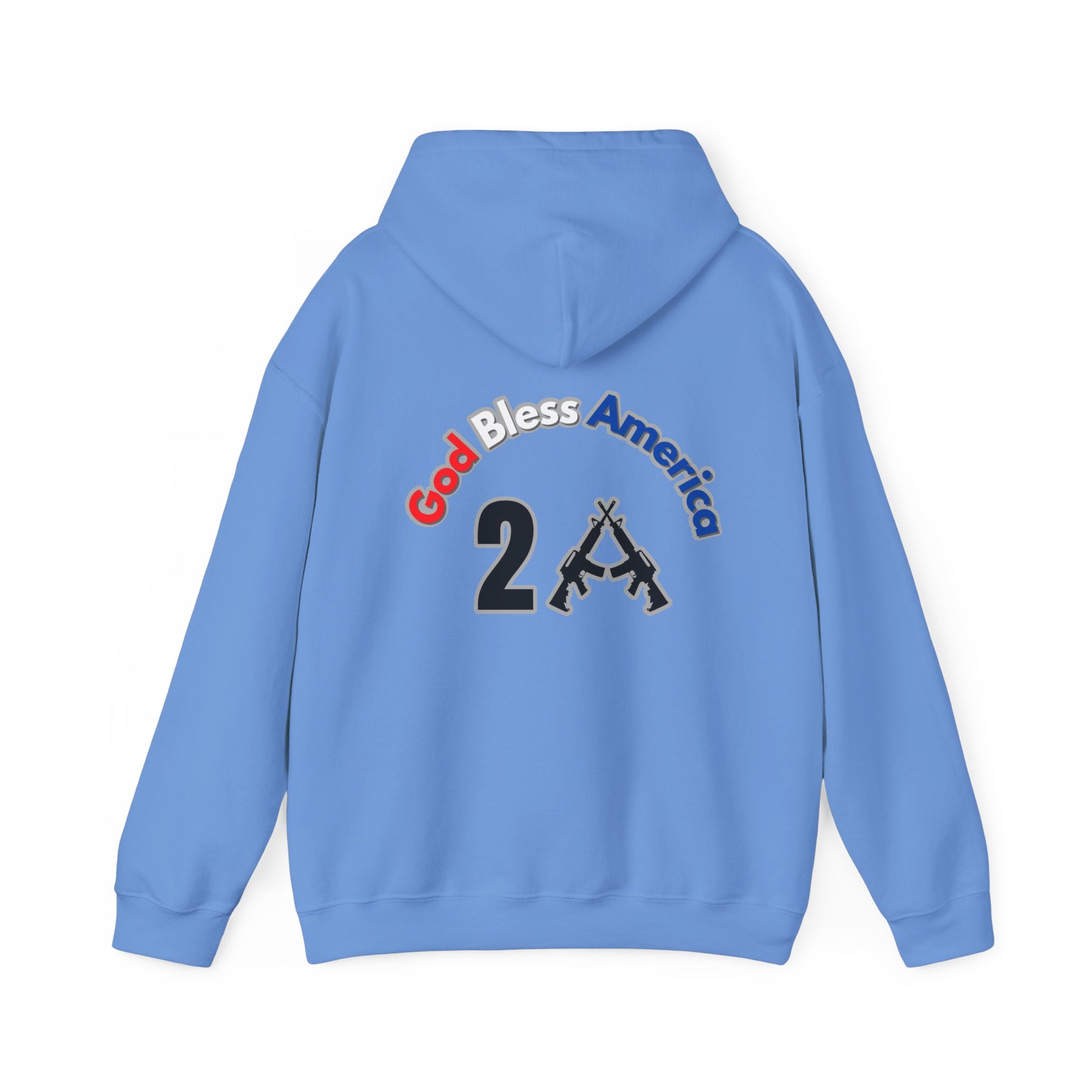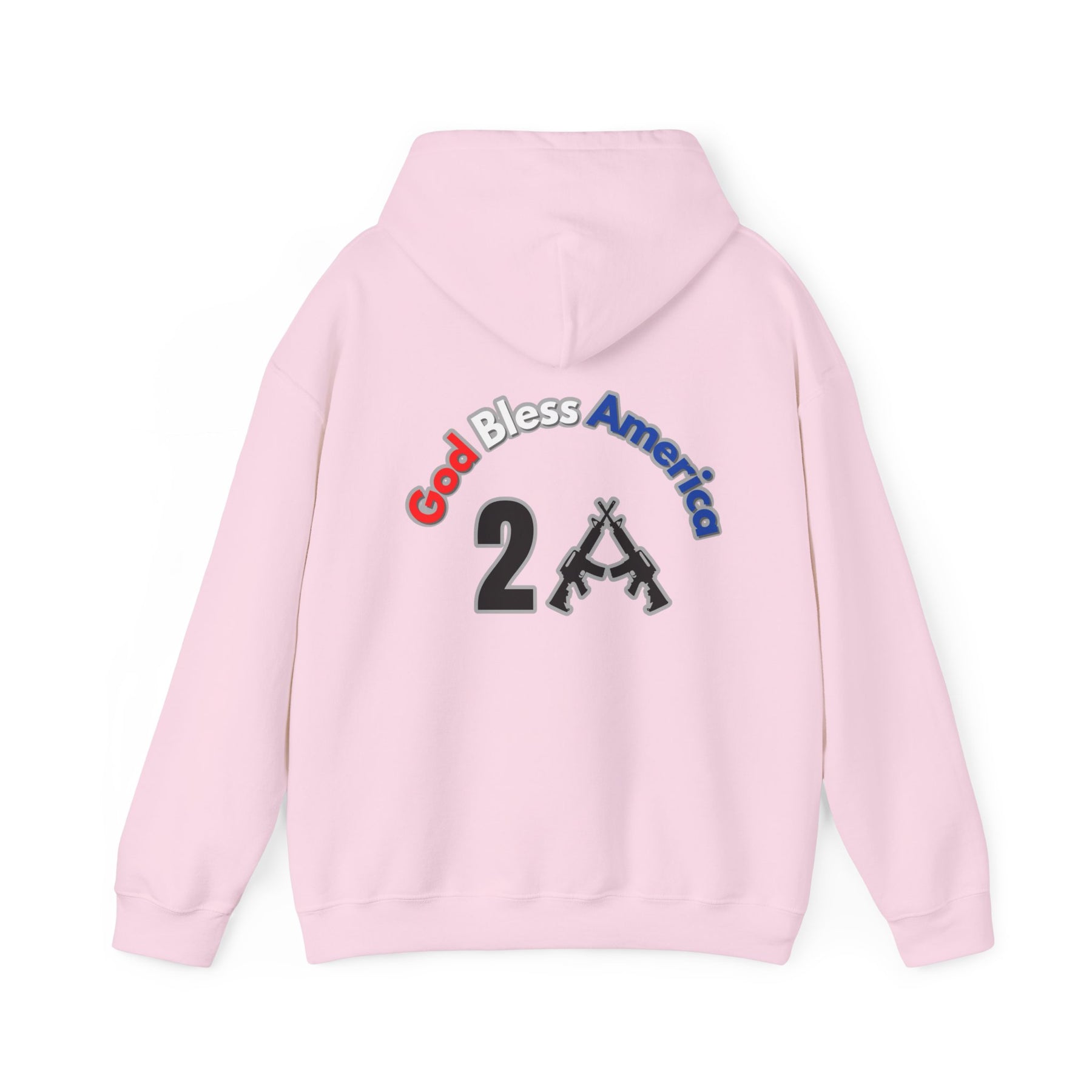 God Bless America 2A Hooded Sweatshirt is a unisex heavy blend hooded sweatshirt that is relaxation itself. The material is a thick blend of cotton and polyester. This makes for a plush, soft feel alongside warmth. It's also a great surface for printing. There are no side seams. A spacious kangaroo pocket hangs in front. The hood's drawstring is the same color as the base sweater.