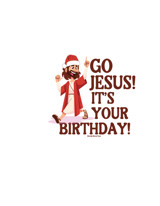 Unisex Go Jesus It's Your Birthday Tee featuring a cartoon character in a Santa hat. Made of 80% ring-spun cotton and 20% polyester, with a relaxed fit and rolled-forward shoulder. From Worlds Worst Tees.
