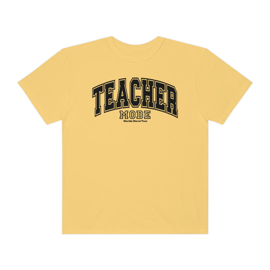 A relaxed fit Teacher Mode Tee in yellow with black text, made of 80% ring-spun cotton and 20% polyester. Unisex garment-dyed sweatshirt with rolled-forward shoulder and medium-heavy fabric.