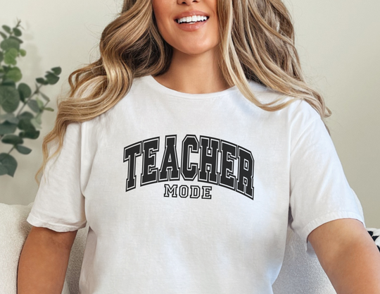 Unisex Teacher Mode Tee: White shirt with black text, relaxed fit, 80% ring-spun cotton, 20% polyester, medium-heavy fabric. Perfect for comfort and style.