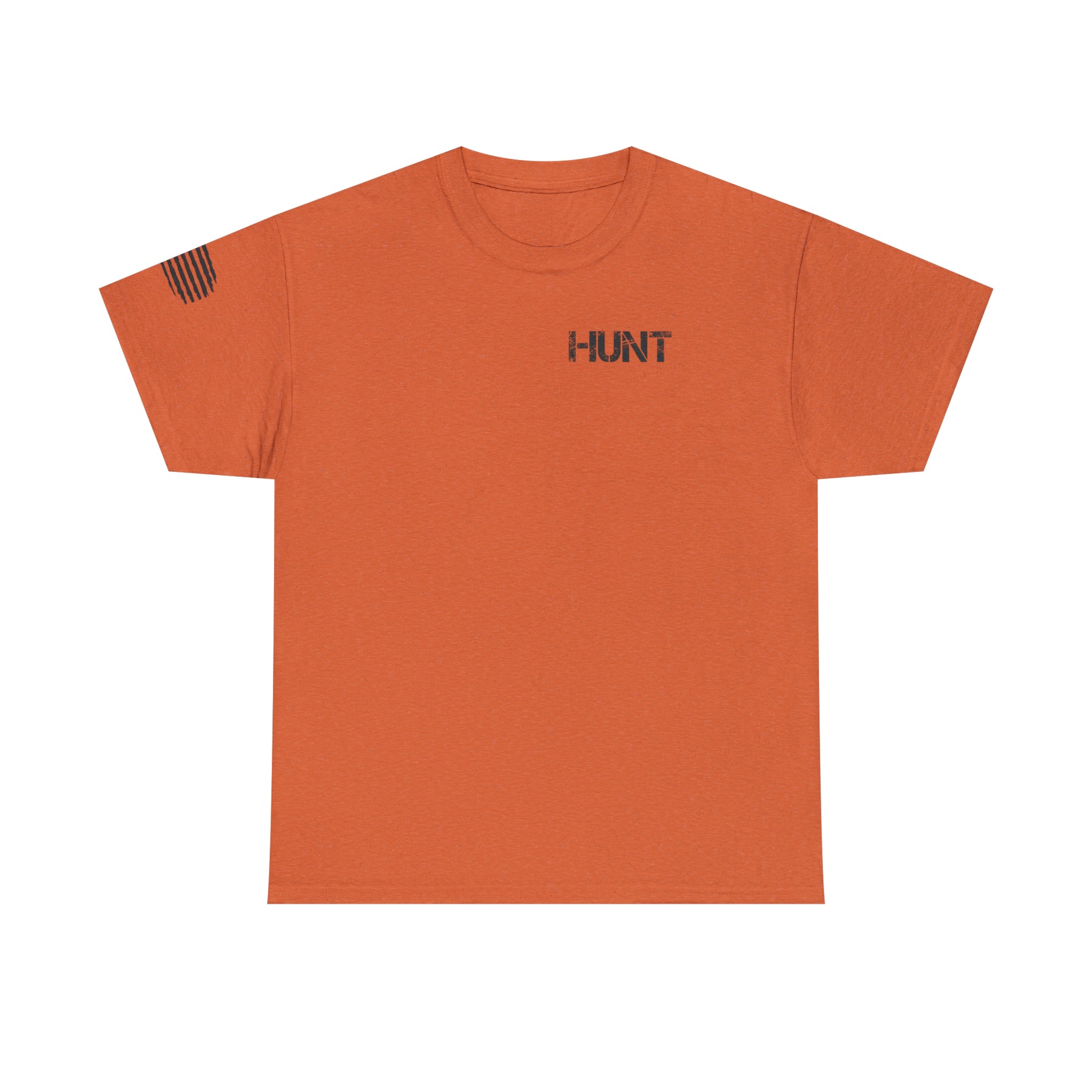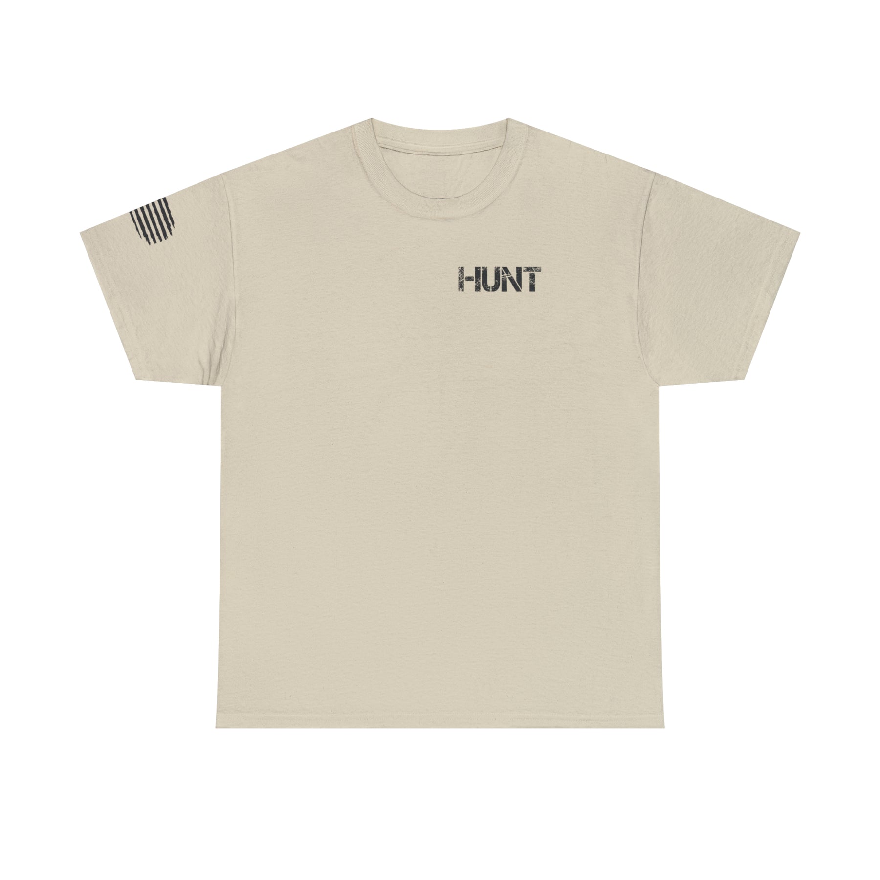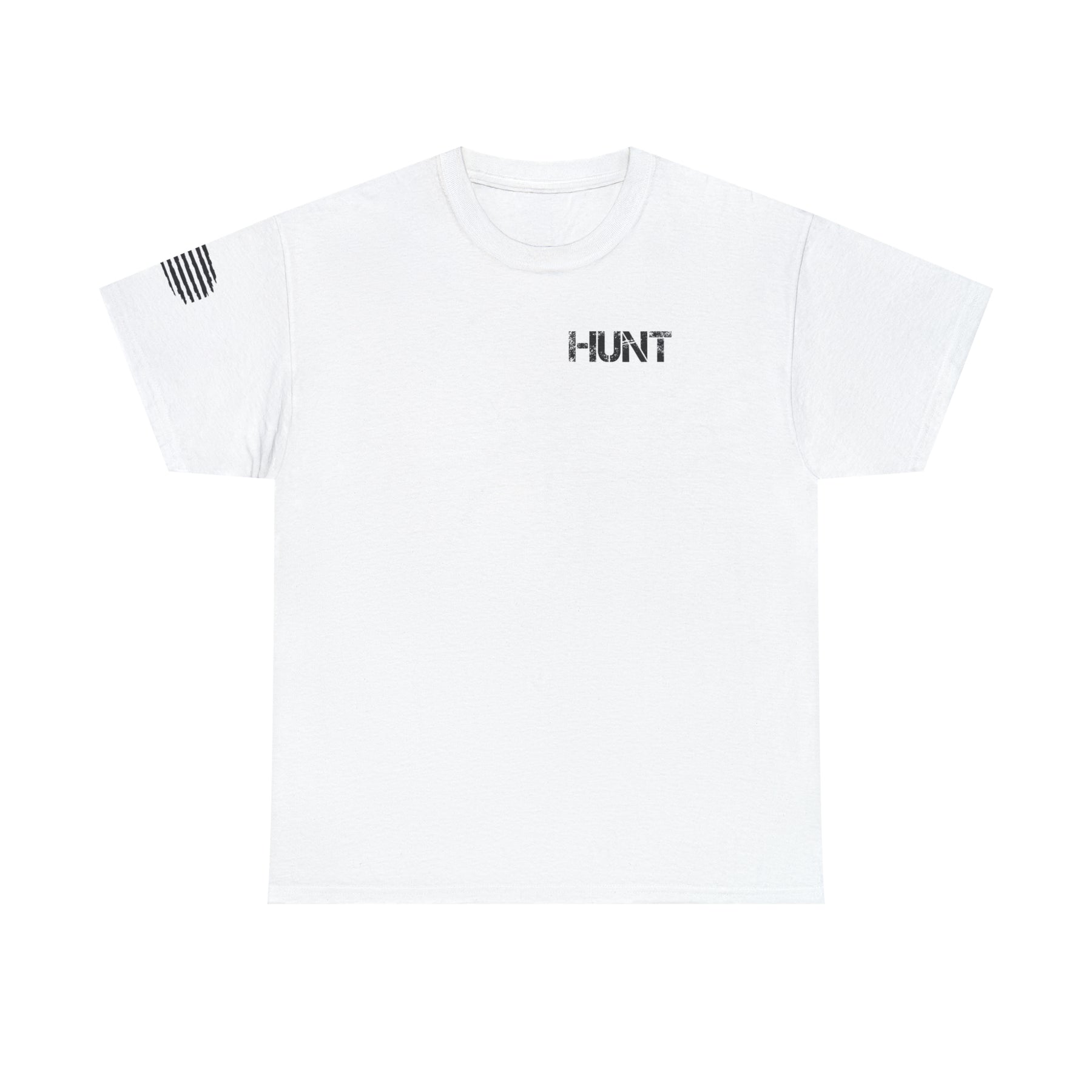 American Hunter Tee: A premium fitted men’s t-shirt with black text on white fabric. Comfy, light, and roomy, perfect for workouts or daily wear. Ribbed collar, side seams for durability. 100% combed cotton.