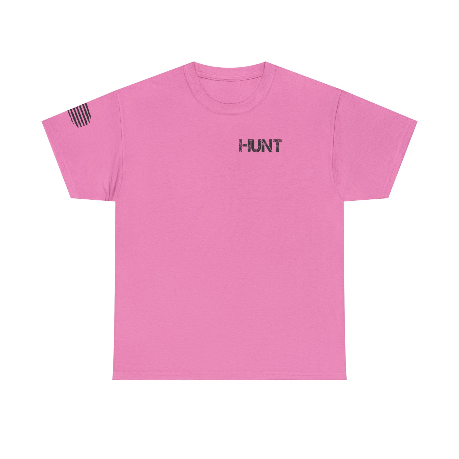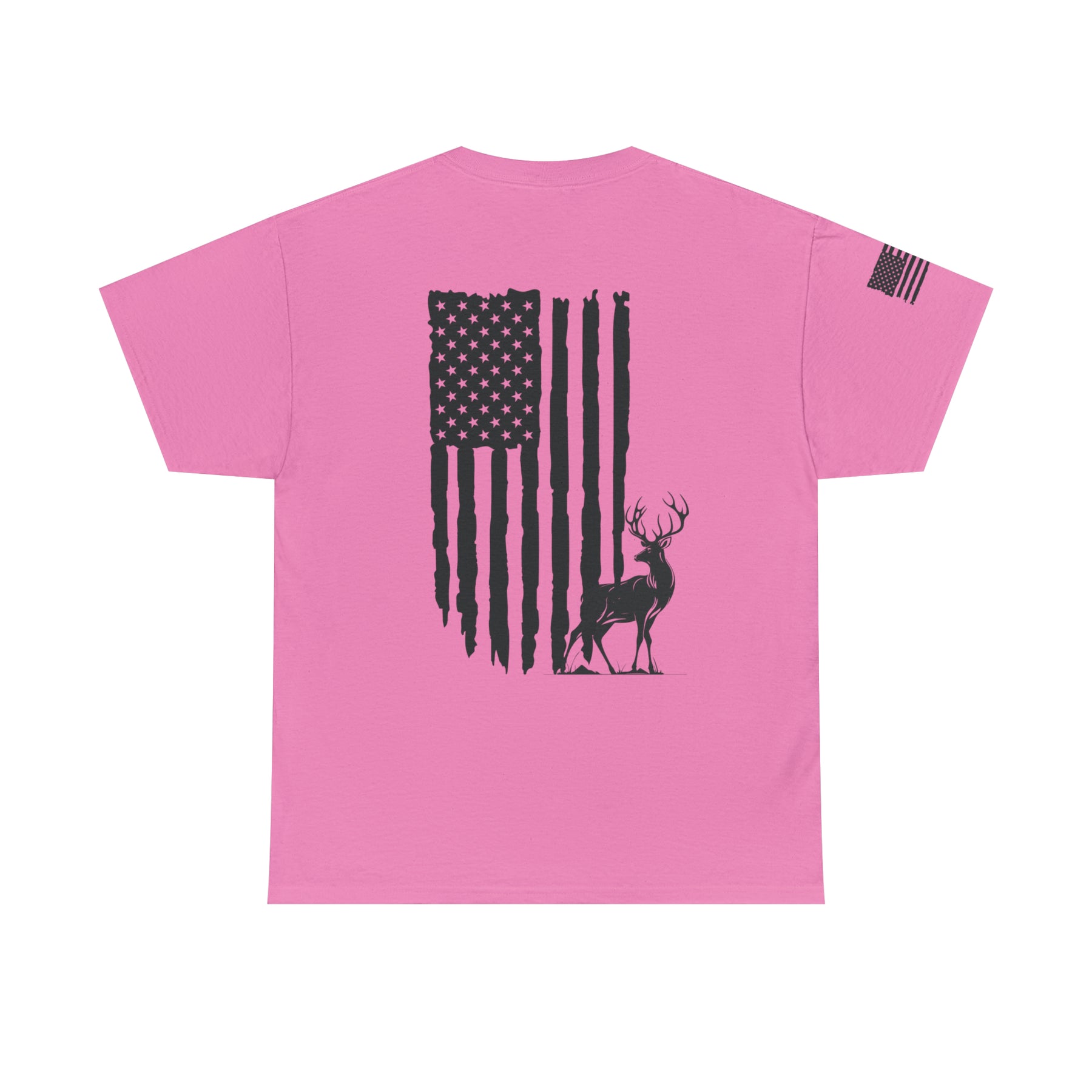 American Hunter Tee: A pink shirt featuring a flag and deer silhouette. Premium fitted men’s short sleeve, 100% combed cotton, light fabric, and roomy fit. Ideal for workouts or daily wear.