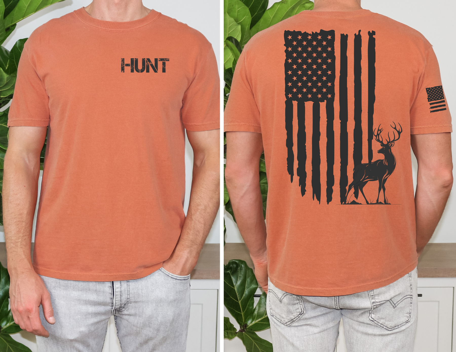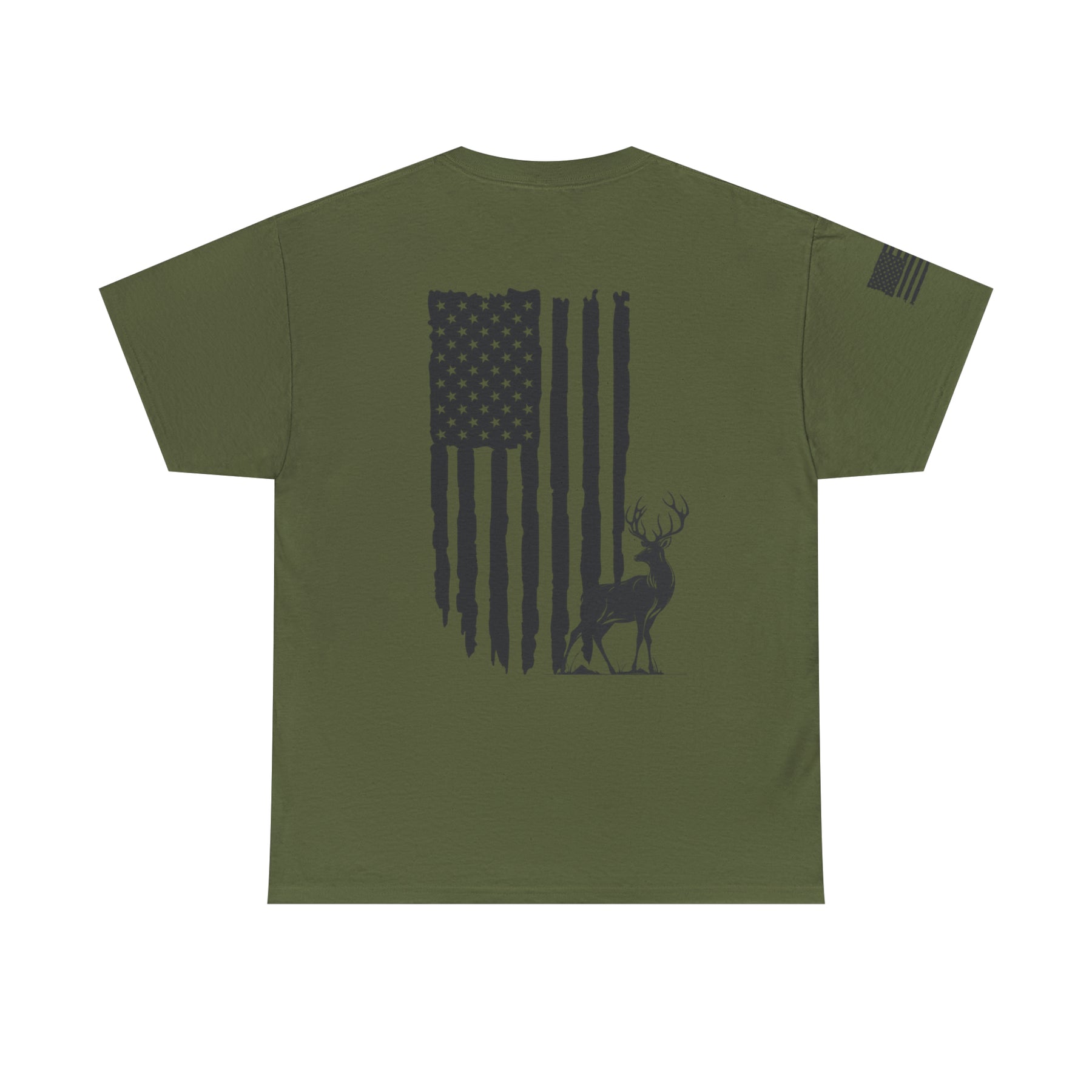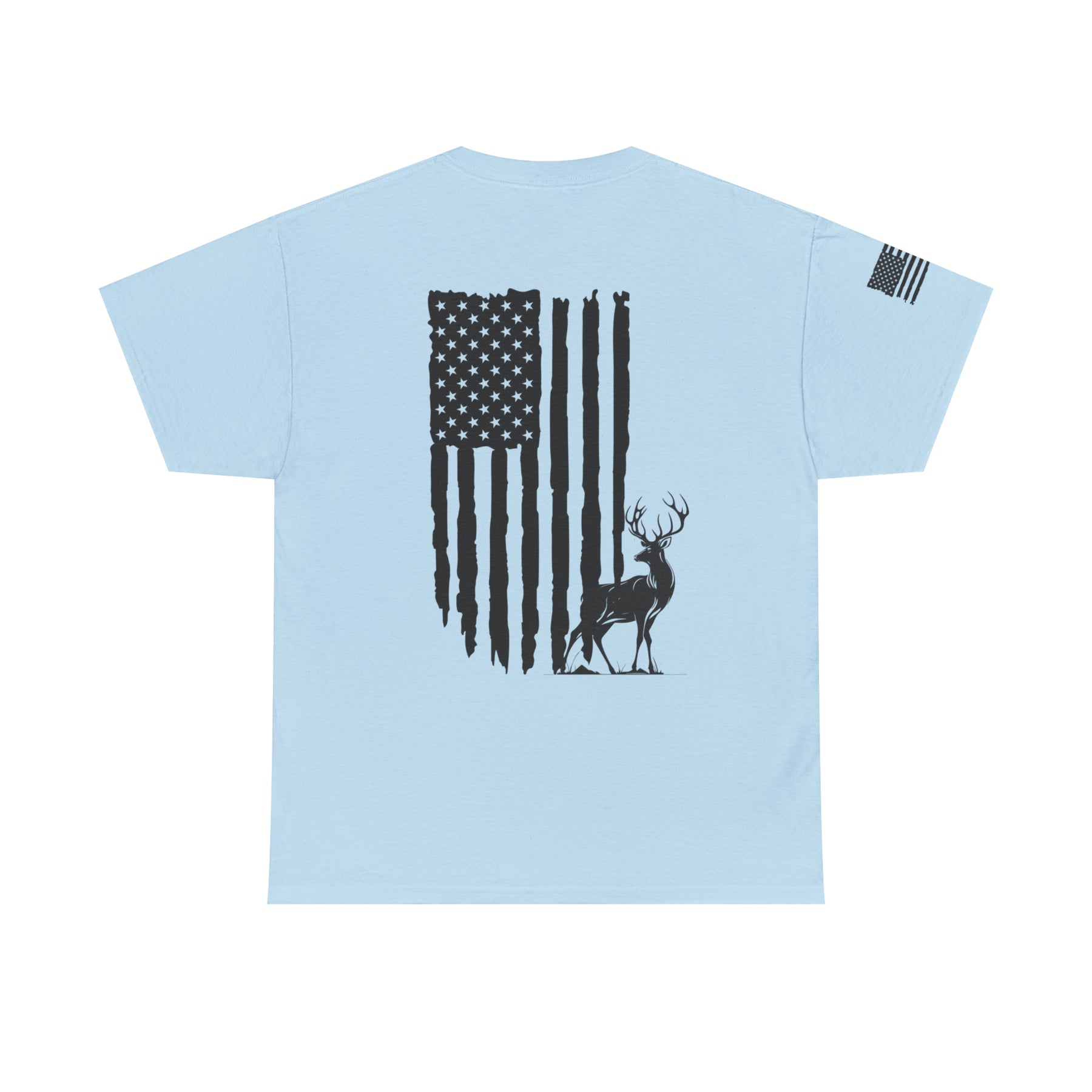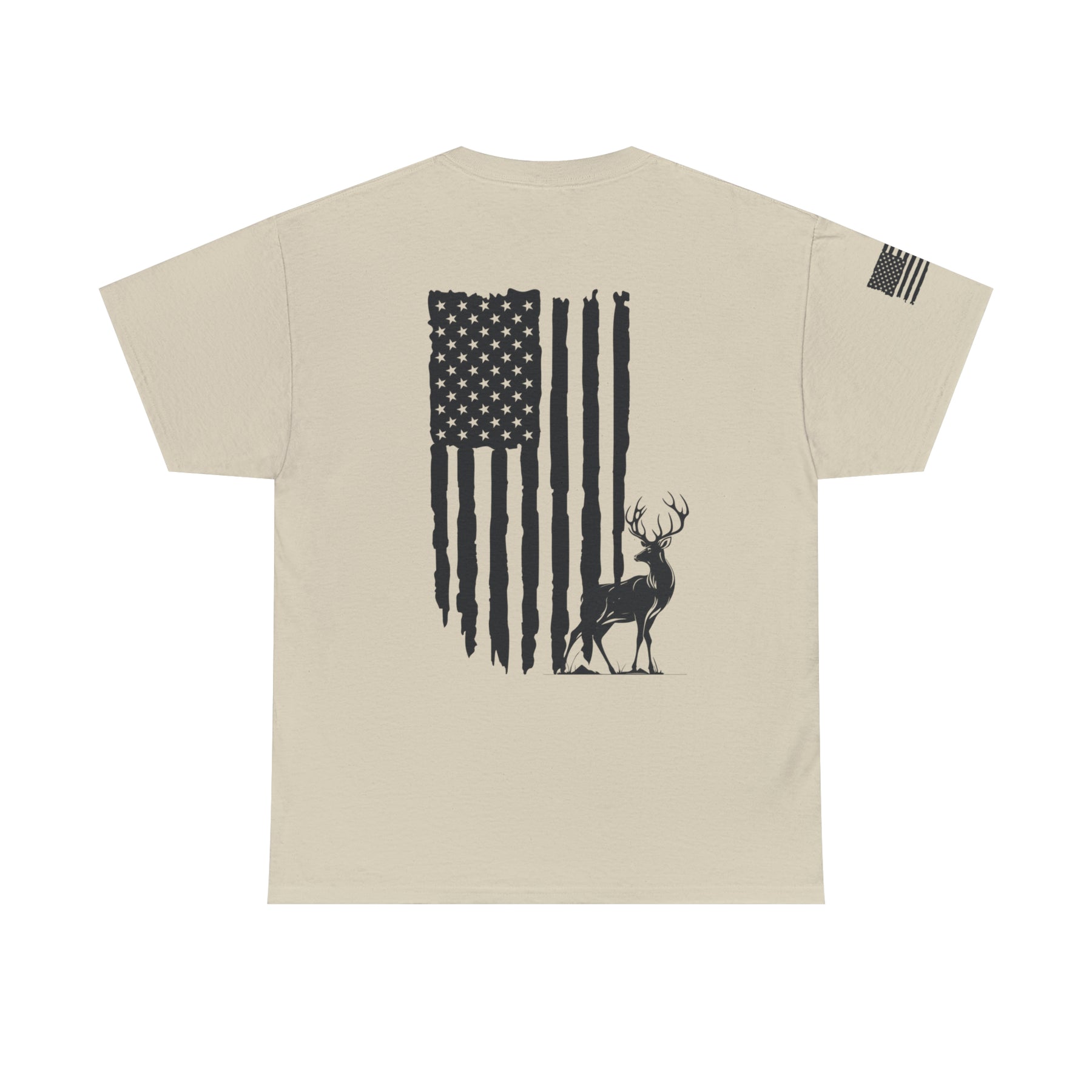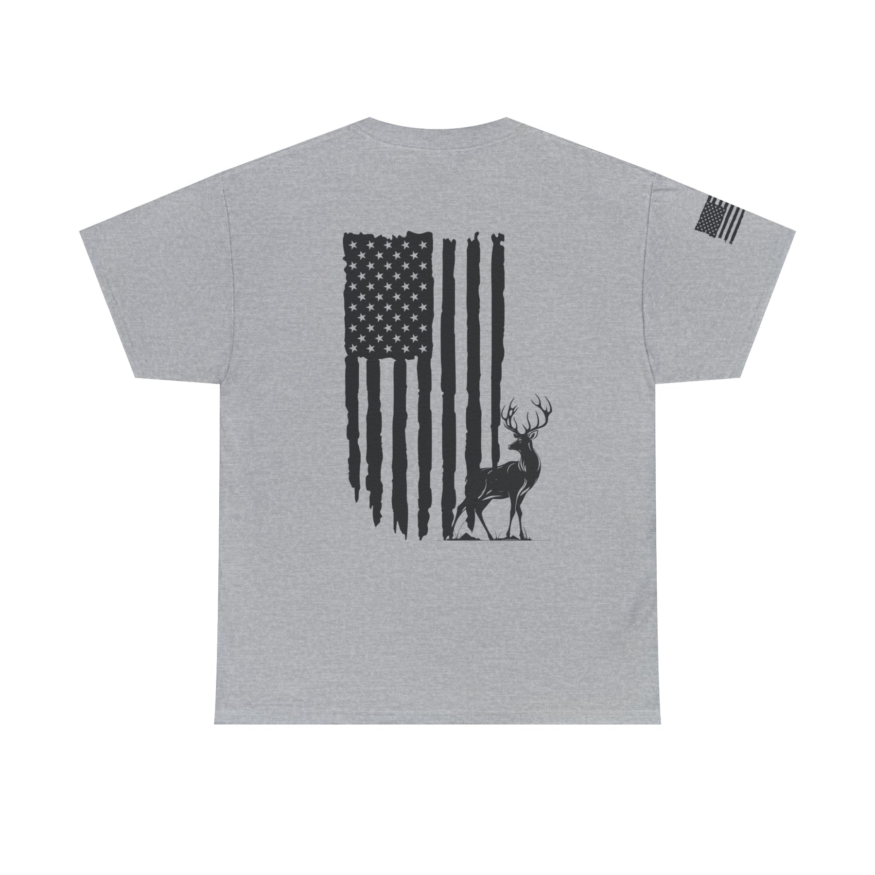 A premium American Hunter Tee for men, featuring a flag and deer design. Comfy, light, and roomy with ribbed knit collar and side seams for durability. 100% combed, ring-spun cotton.