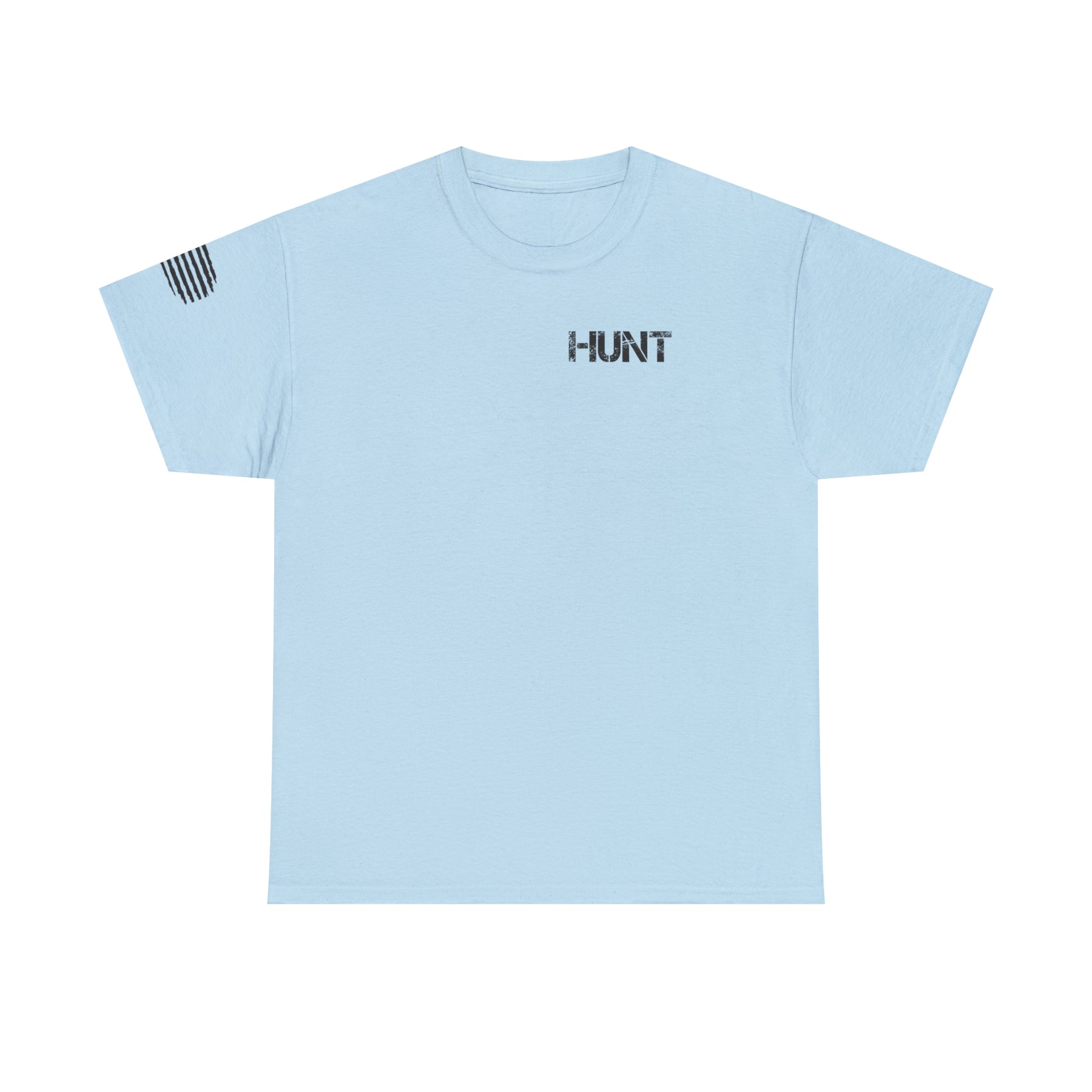 American Hunter Tee: A light blue t-shirt with black text, featuring a premium fit for comfort and style. Made of 100% combed, ring-spun cotton, with ribbed knit collar and roomy design. Ideal for workouts or daily wear.