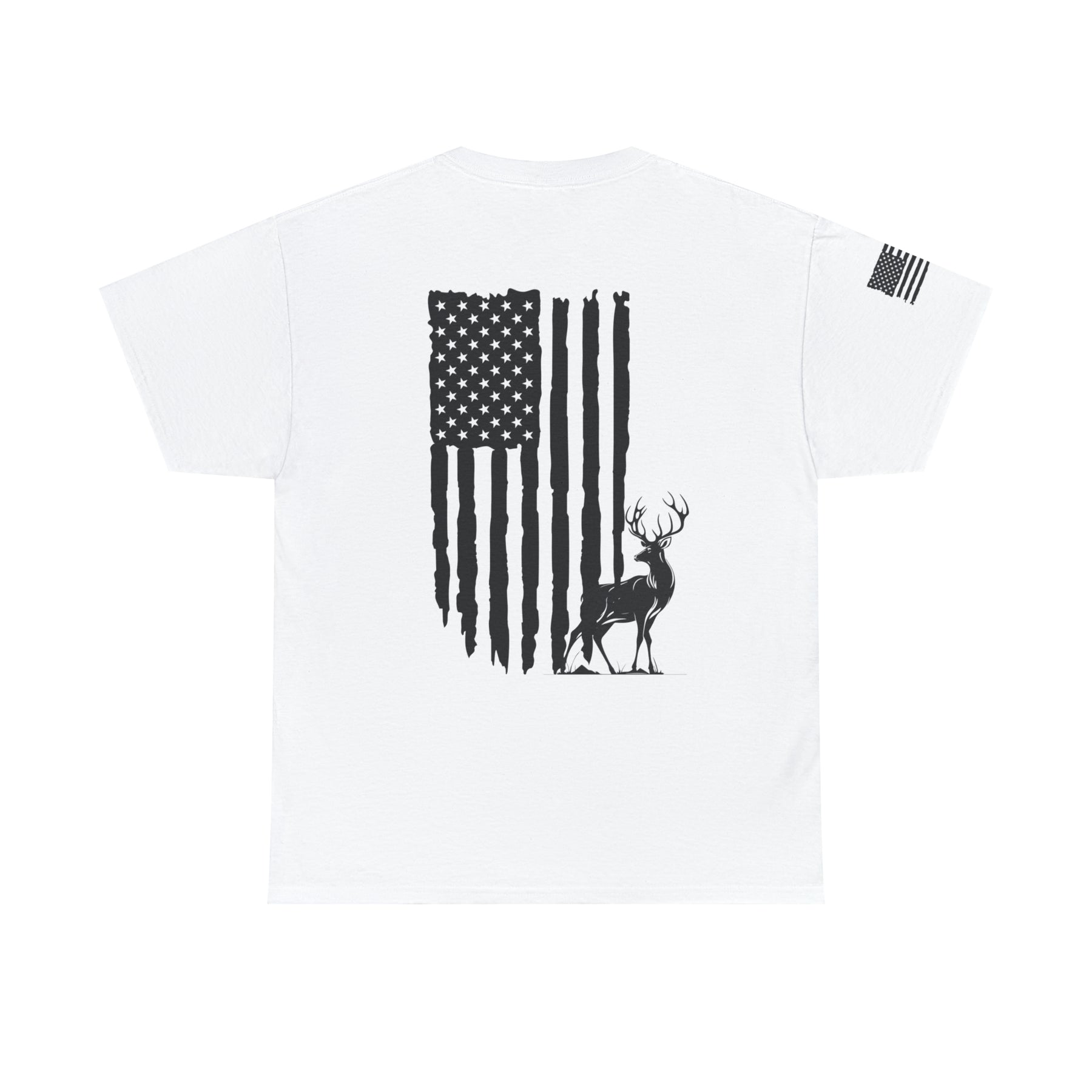 American Hunter Tee: A white shirt featuring a flag and deer design. Premium fit, 100% combed cotton, light fabric. Ribbed collar, roomy, and comfy for everyday wear.