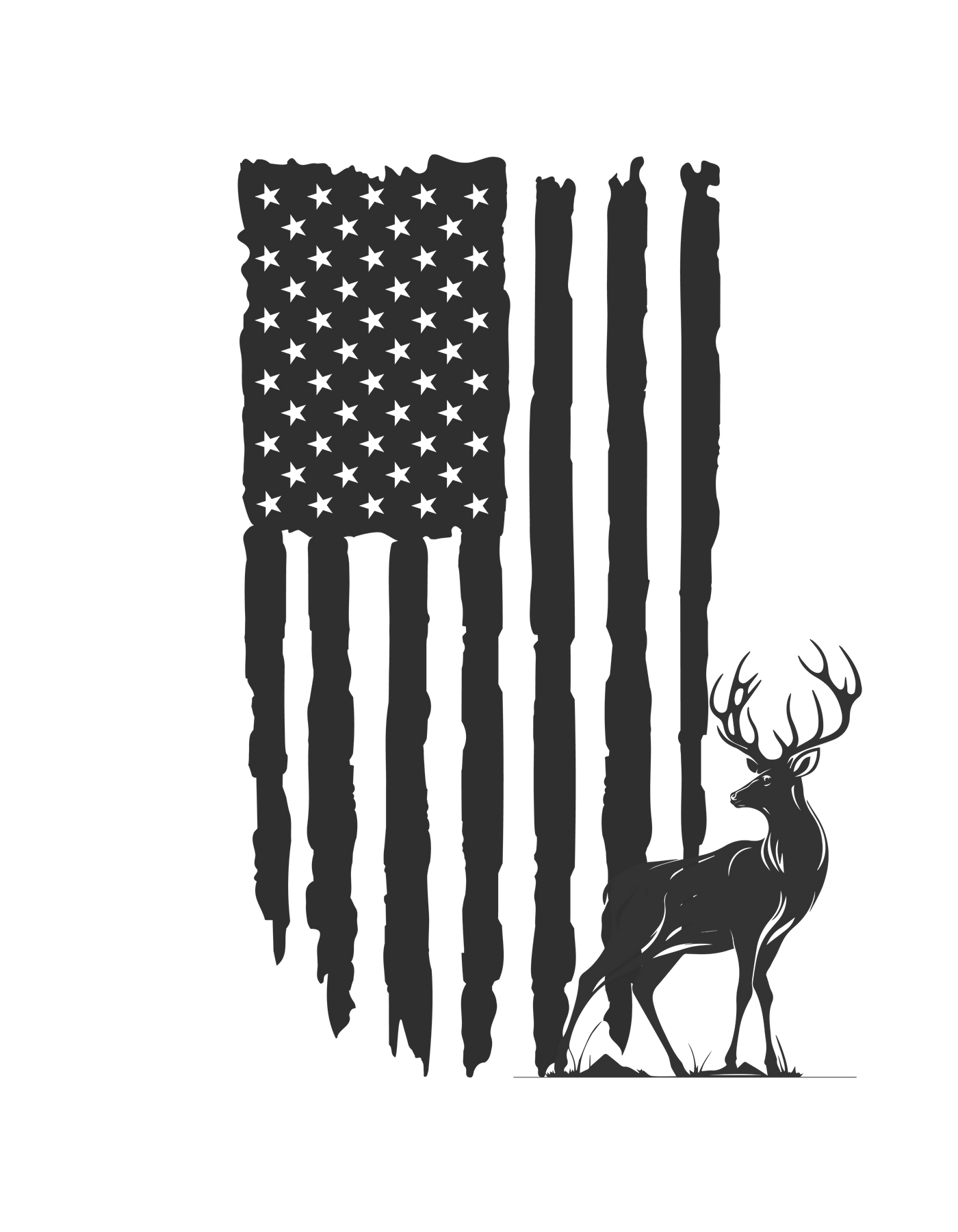 American Hunter Tee: A monochrome sketch of a deer on a flag, embodying art and wildlife. Premium fitted men’s tee in various sizes, 100% cotton, with ribbed knit collar for comfort and style.