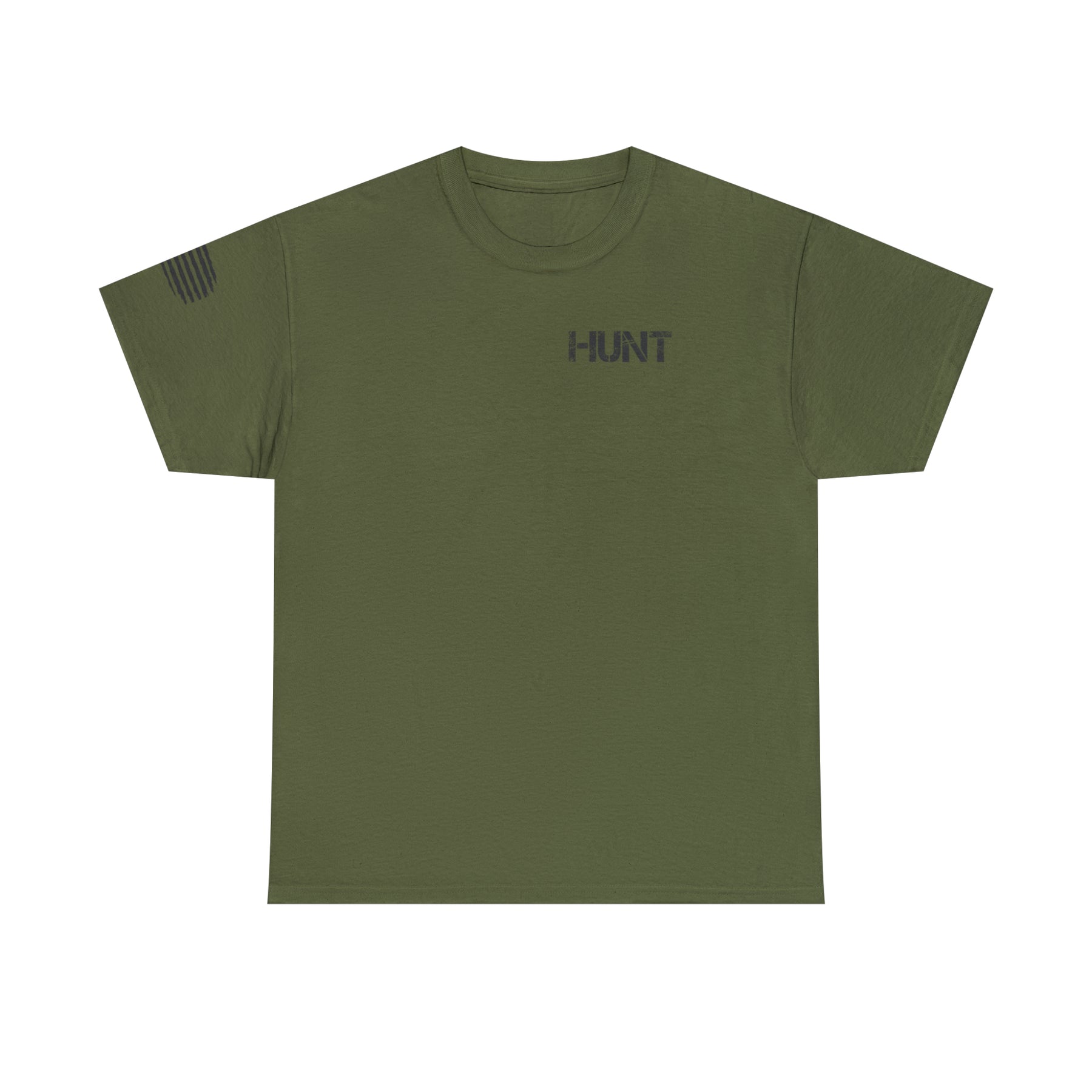 American Hunter Tee: A premium fitted men’s short sleeve t-shirt in green with black text. Comfy, light, and roomy, ideal for workouts or daily wear. Made of 100% combed, ring-spun cotton.