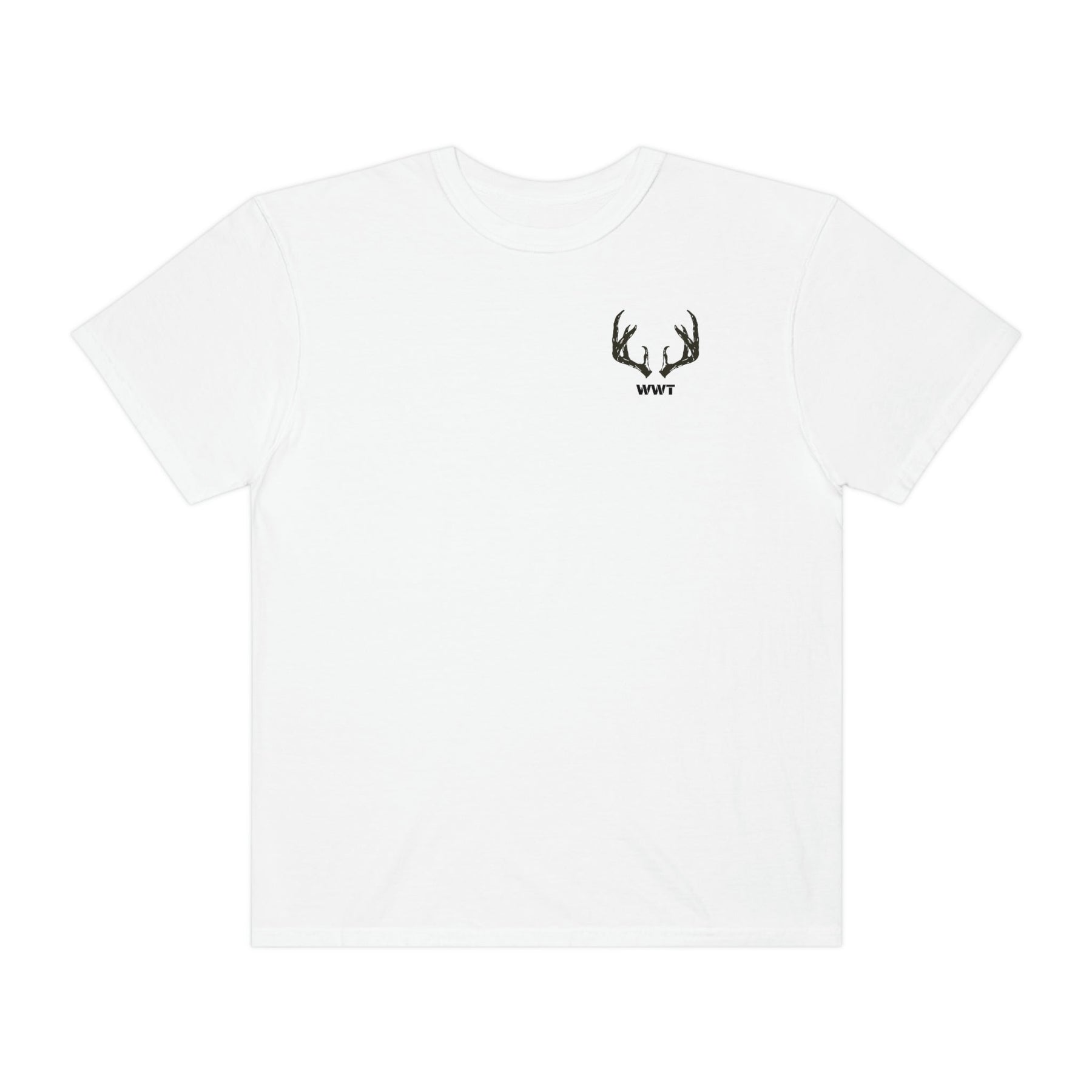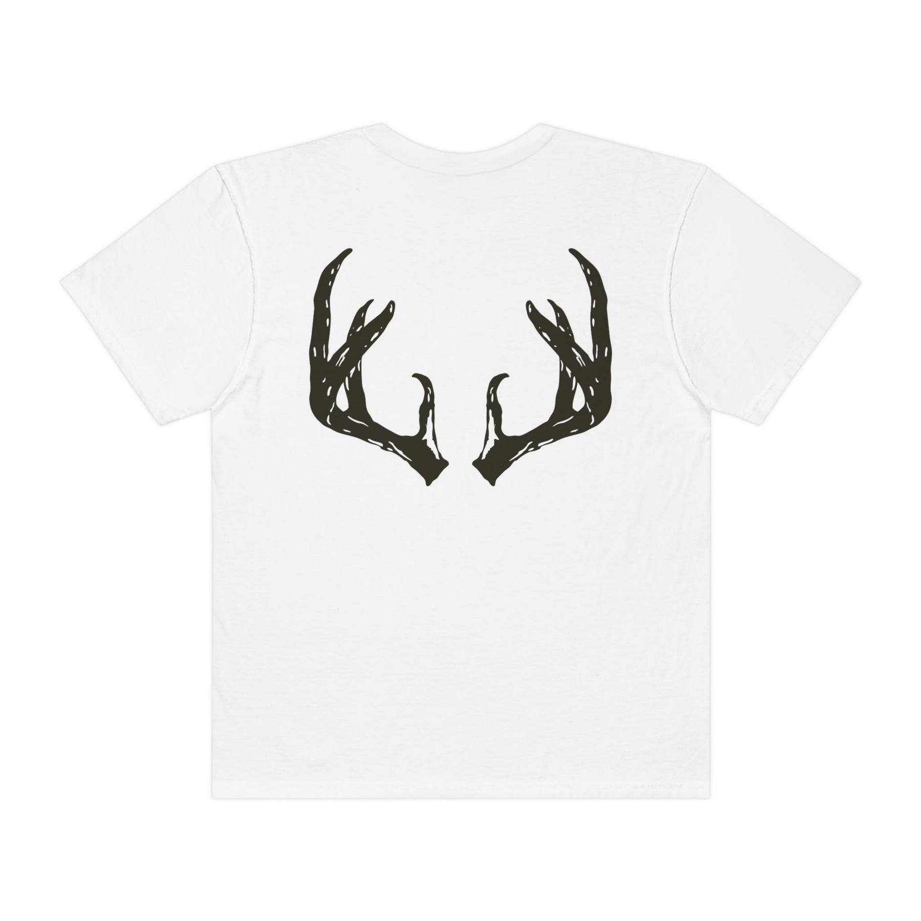 A white Antler Tee in ring-spun cotton, featuring black antlers on a relaxed fit shirt. Garment-dyed for coziness, with double-needle stitching for durability. From Worlds Worst Tees.