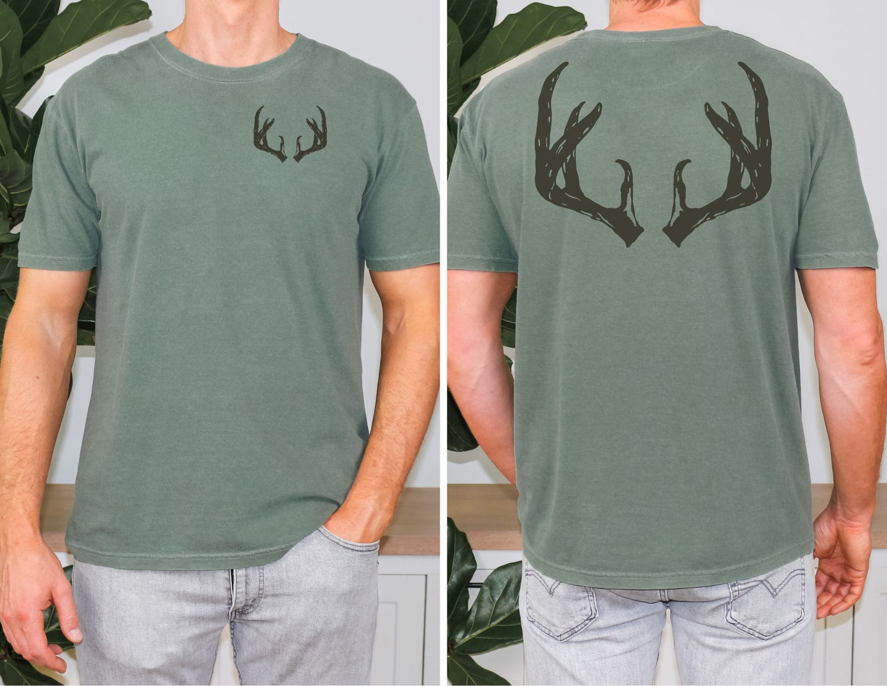 Antler Tee: Back view of a shirt with antlers drawing. 100% ring-spun cotton, garment-dyed for extra coziness. Relaxed fit, double-needle stitching for durability, no side-seams for a tubular shape.
