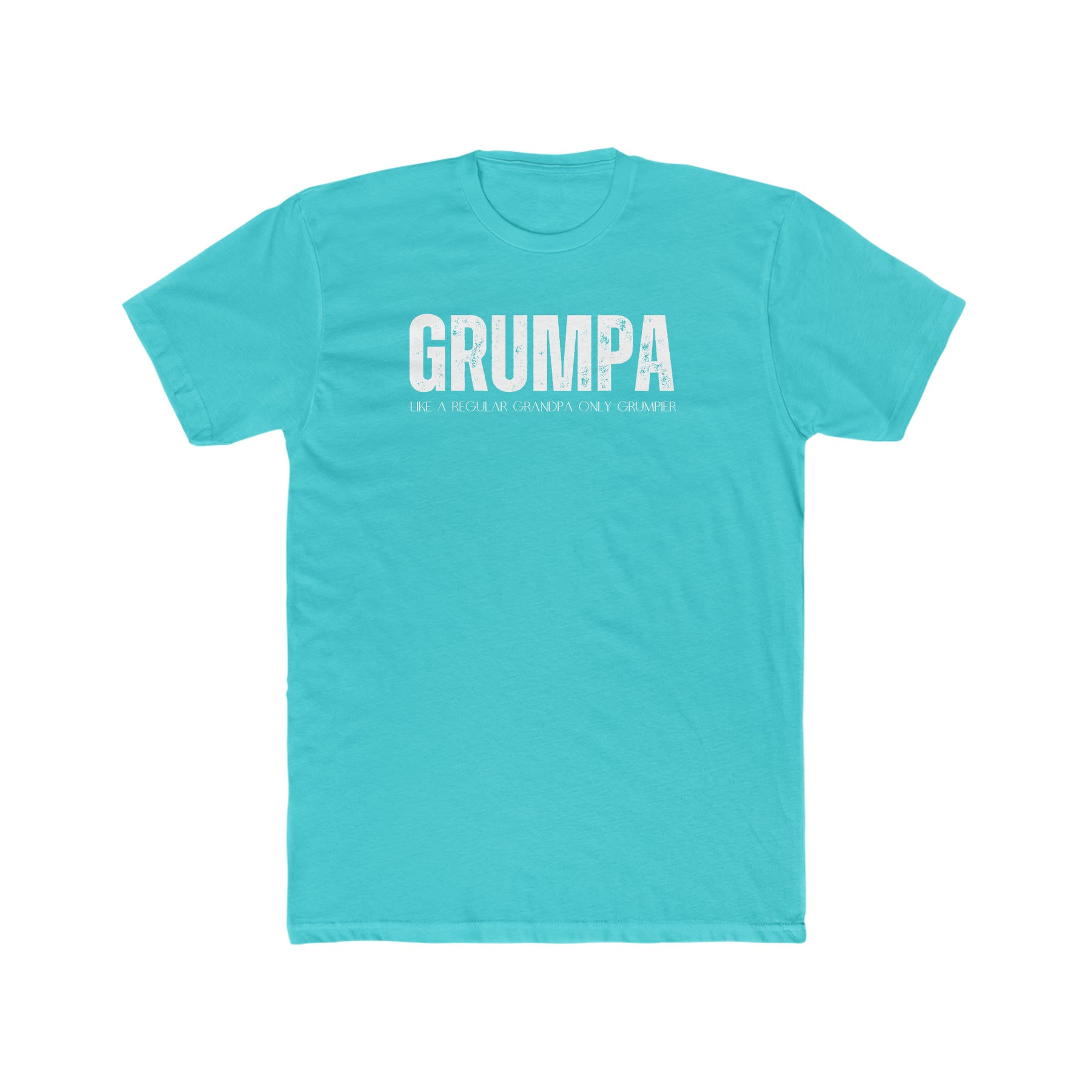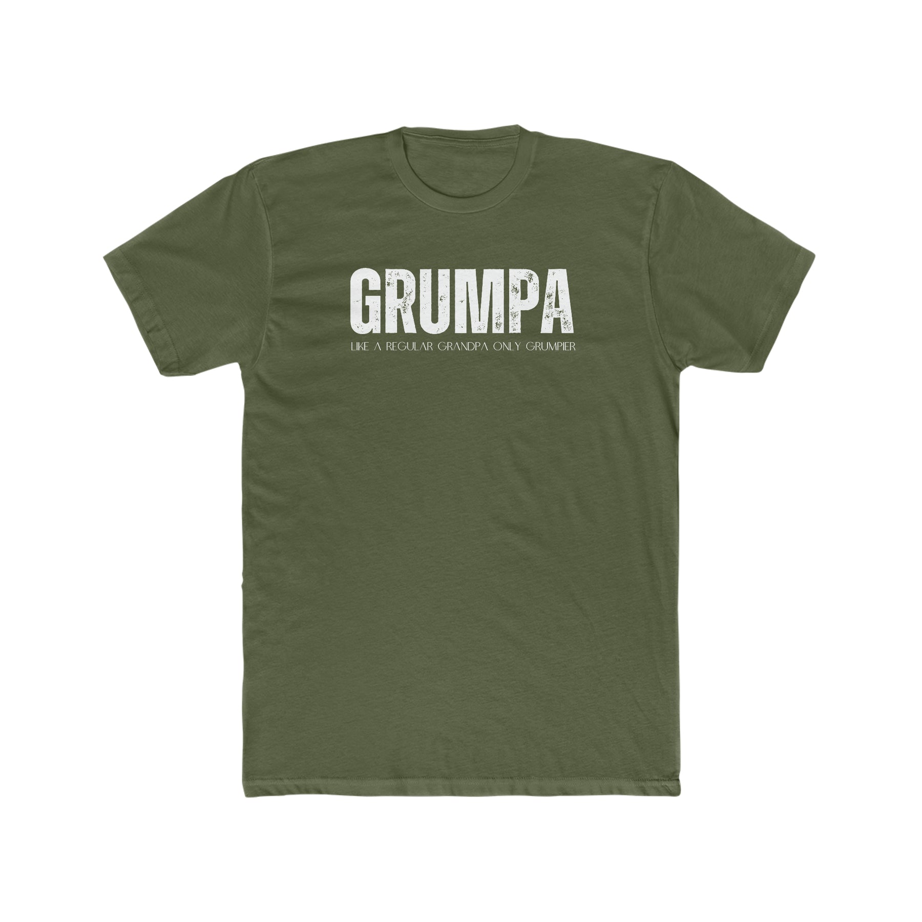 A Grumpa Tee: Green shirt with white text. 100% ring-spun cotton, garment-dyed for coziness. Relaxed fit, durable double-needle stitching, tubular shape. Ideal for daily wear.