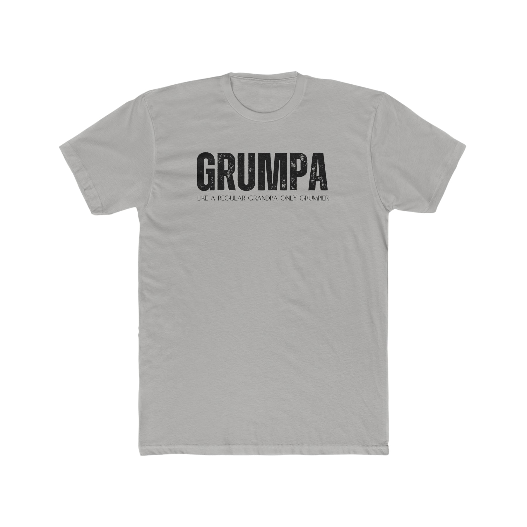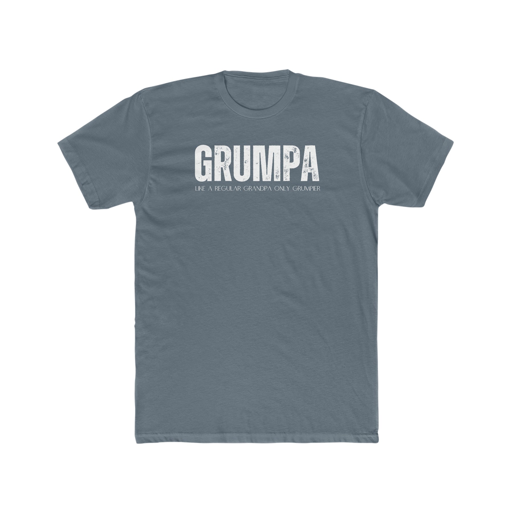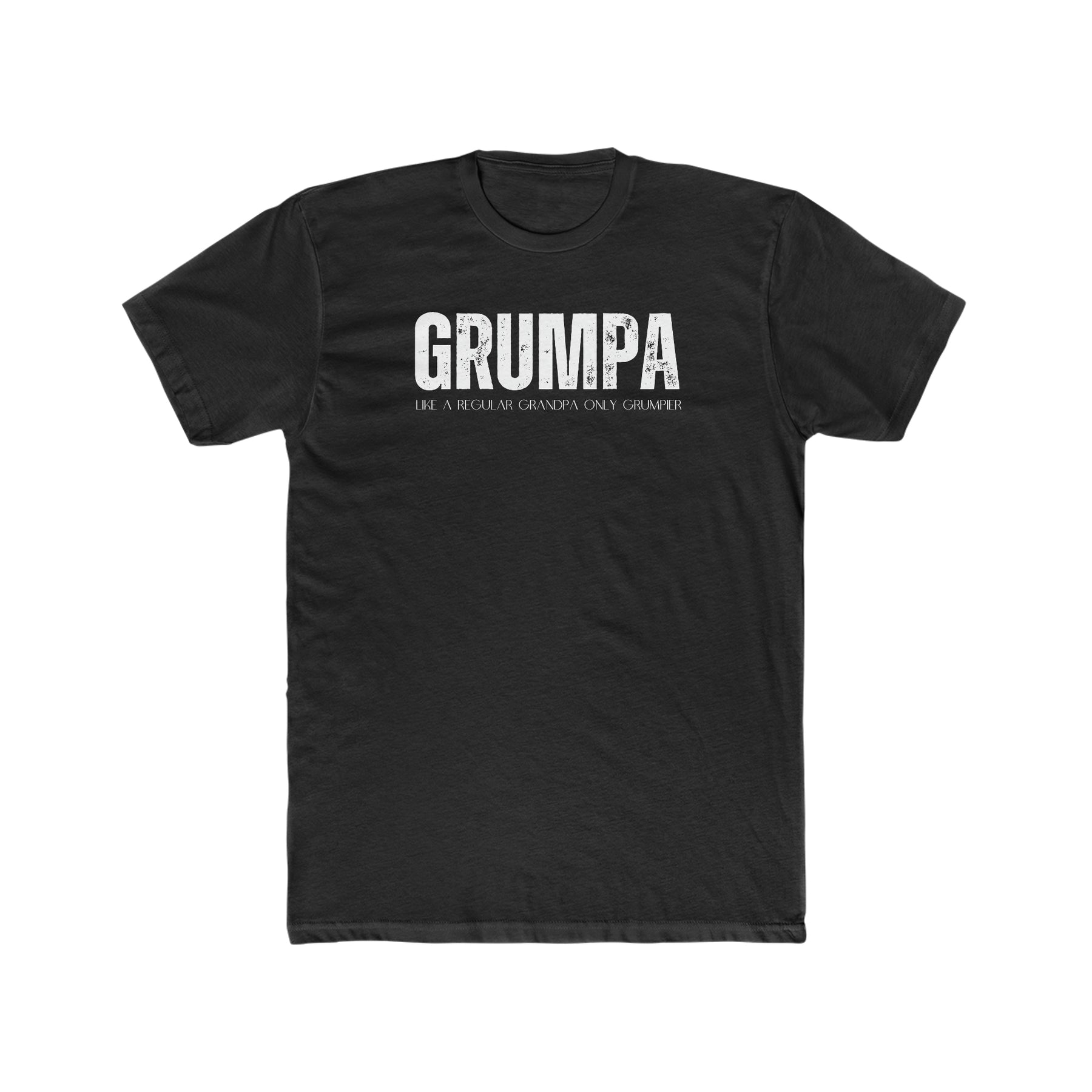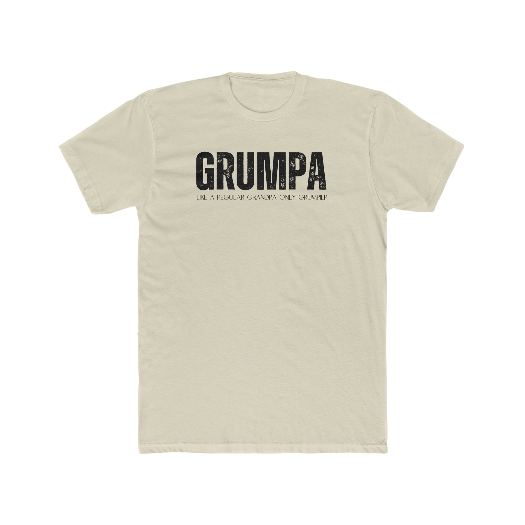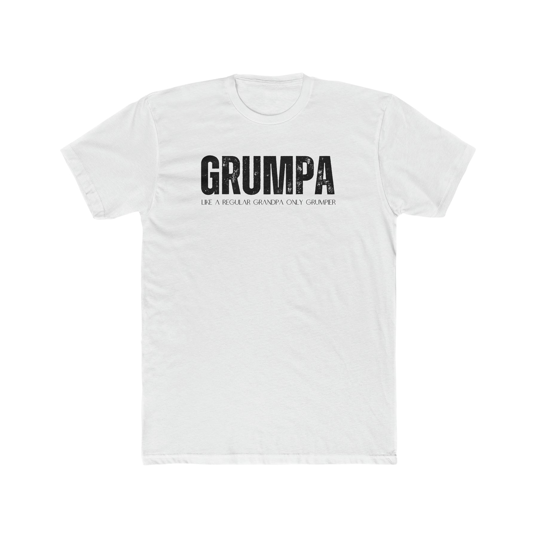 A Grumpa Tee: White shirt with black text. 100% ring-spun cotton, garment-dyed for coziness. Relaxed fit, durable double-needle stitching, seamless design for lasting comfort.