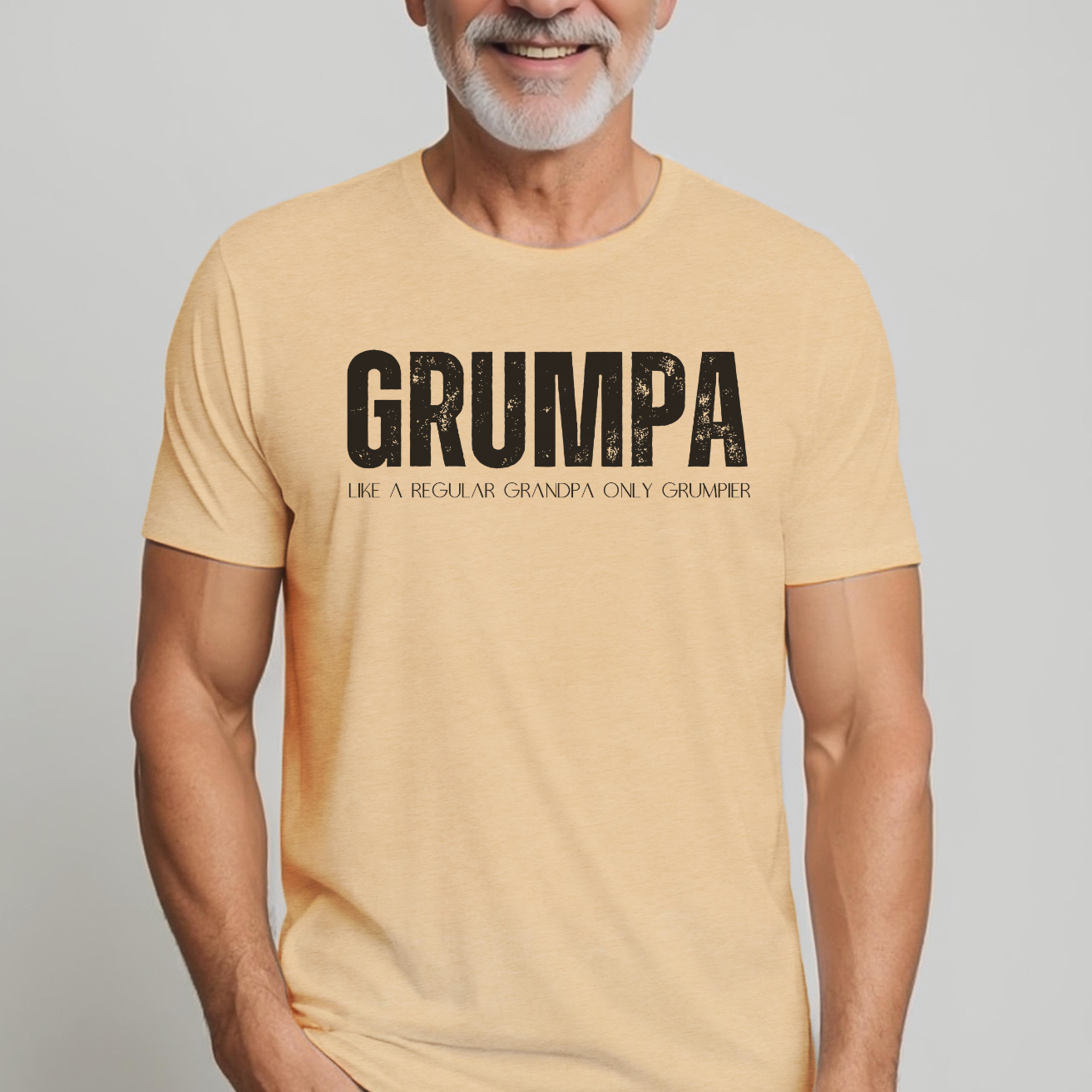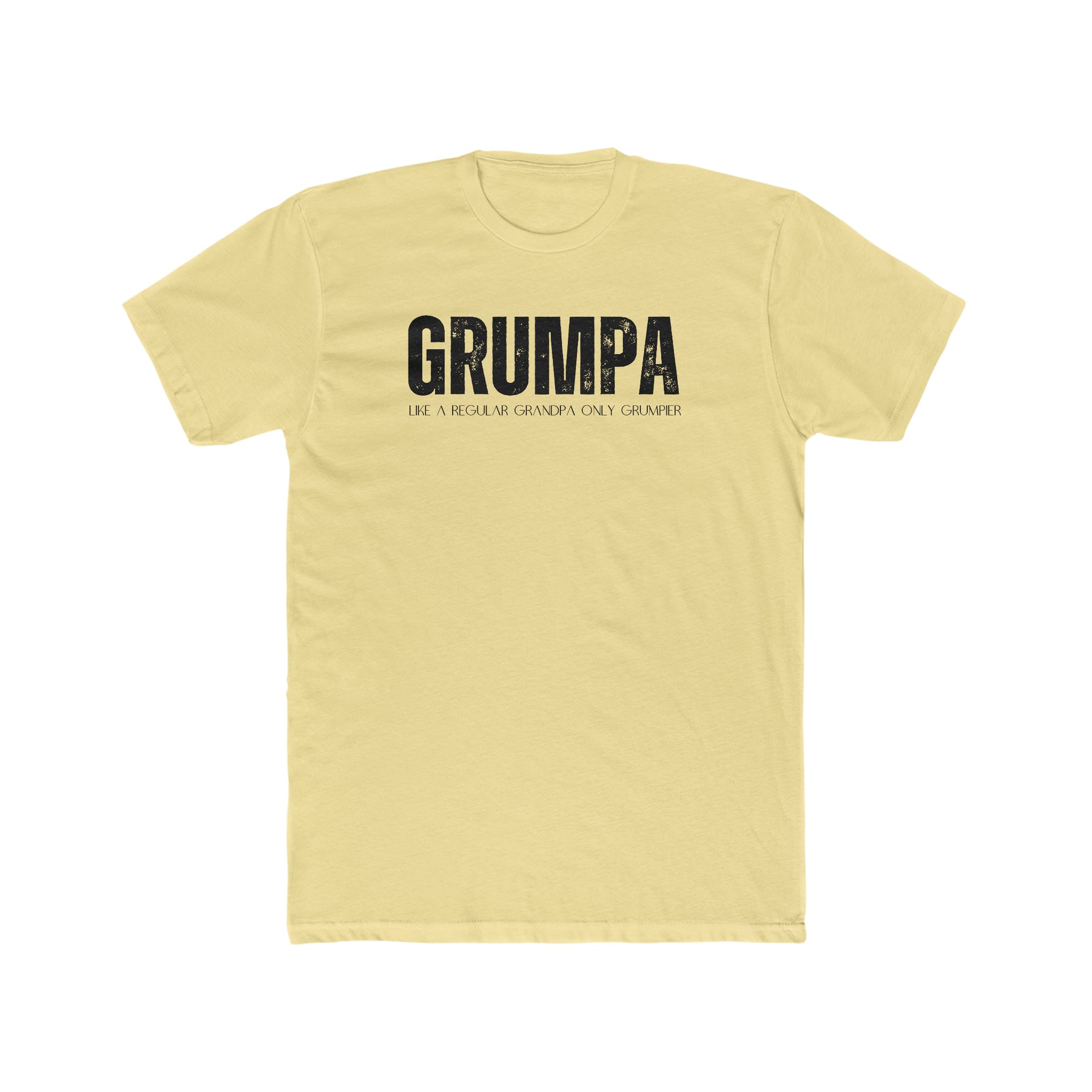 A Grumpa Tee, a yellow shirt with black text, made of 100% ring-spun cotton. Medium weight, relaxed fit, double-needle stitching for durability, and seamless design for comfort.