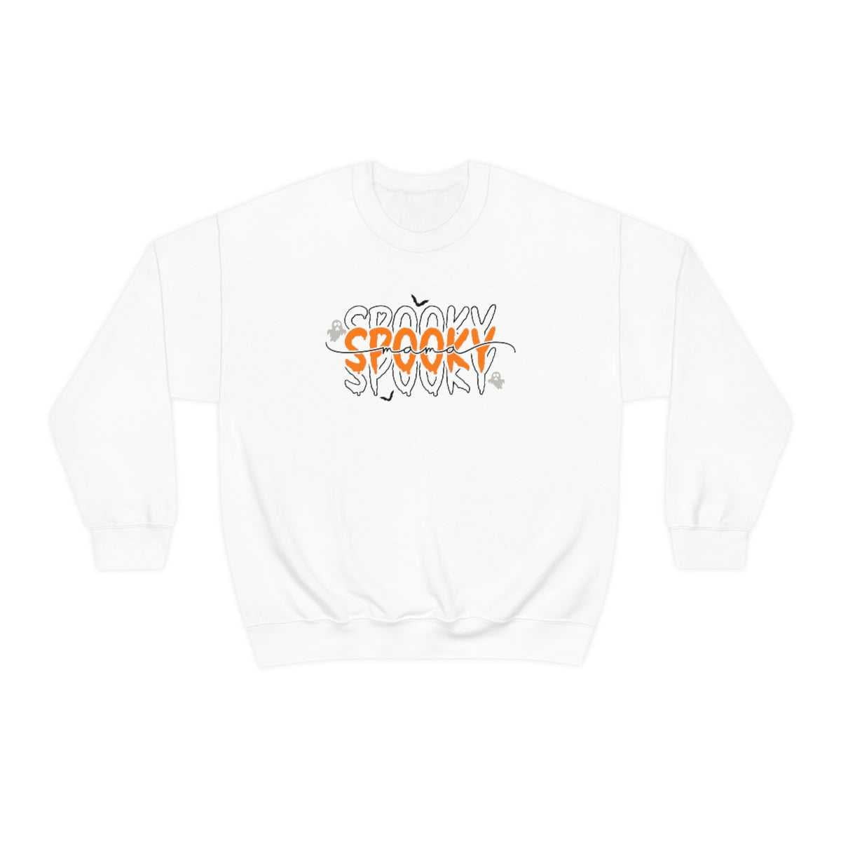 A unisex heavy blend crewneck sweatshirt, the Spooky Mama Crewneck, offers comfort with ribbed knit collar, no itchy seams, and a loose fit. Made of 50% cotton, 50% polyester. Sizes S-5XL.