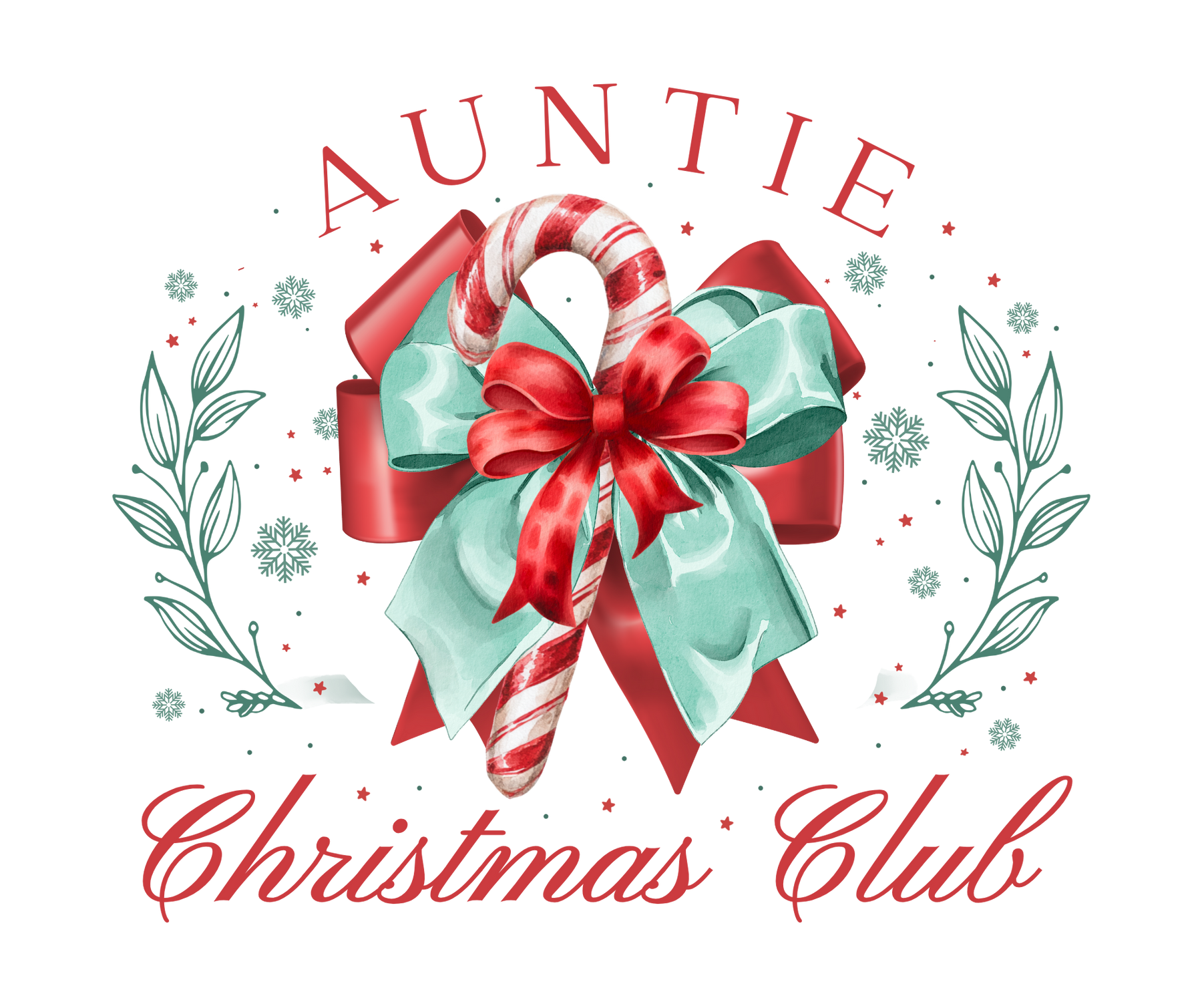 Auntie Christmas Club Hoodie: Light-beige pullover with candy canes, bow, greenery, and snowflakes. AUNTIE in block letters, Christmas Club in cursive below.