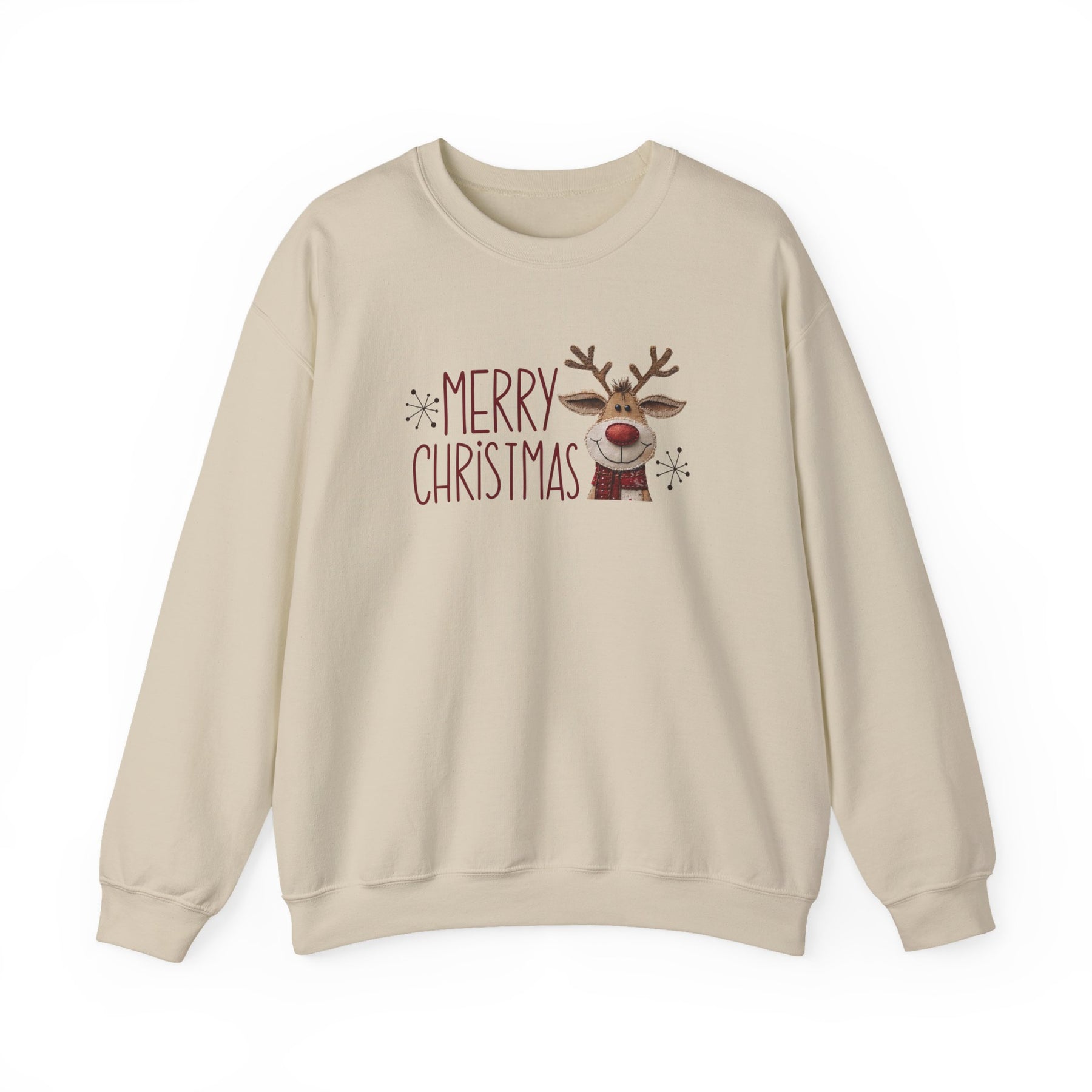 Merry Christmas Reindeer Crew sweatshirt features a smiling reindeer and festive text, designed for comfort with a ribbed crew neckline and durable stitching.