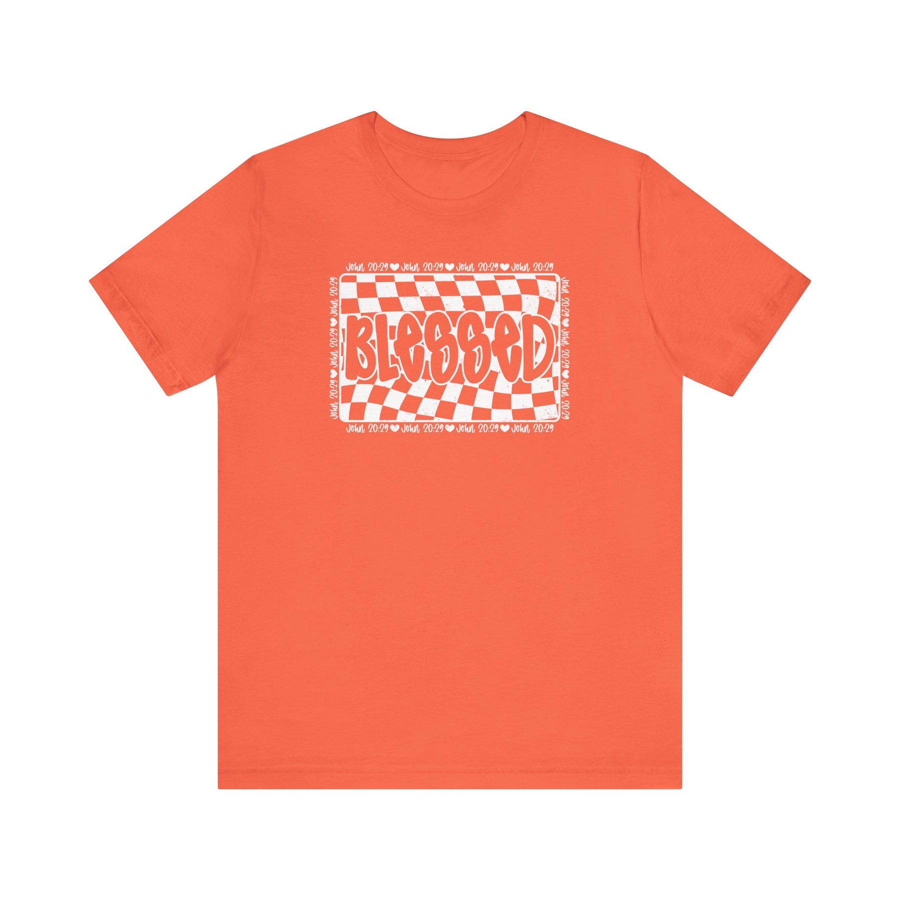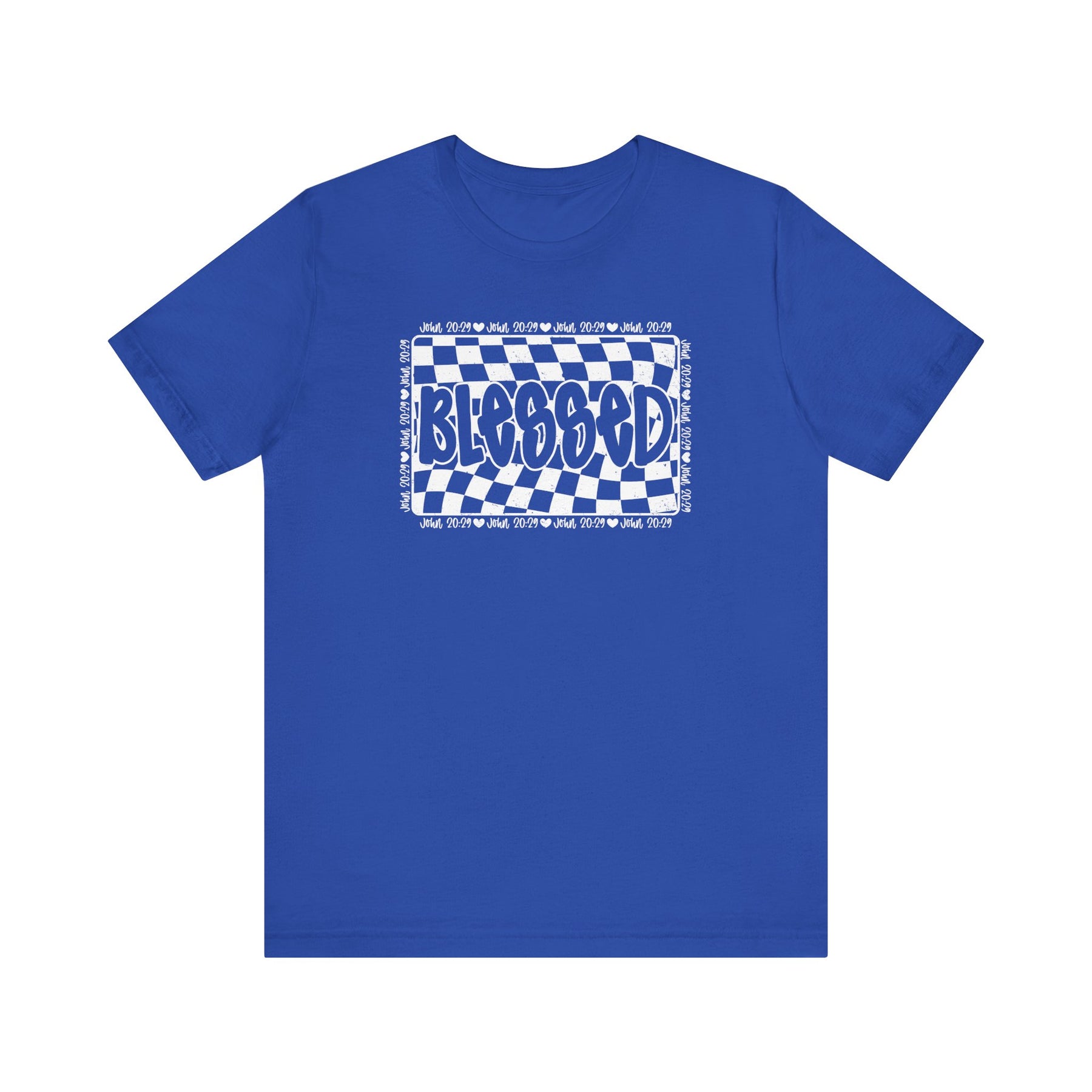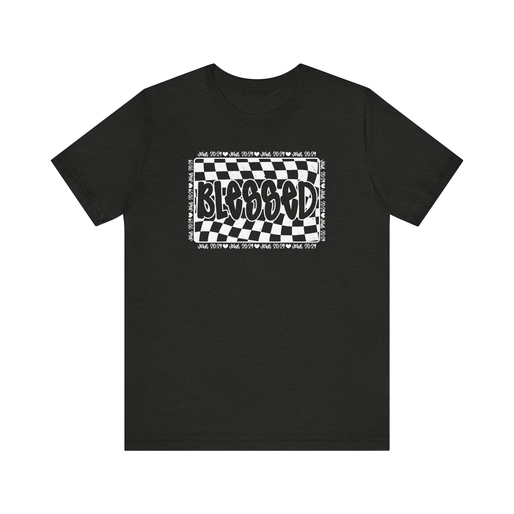 Blessed Tee: Classic unisex jersey t-shirt featuring a checkered design, crafted from soft cotton with ribbed knit collars and dual side seams for durability.