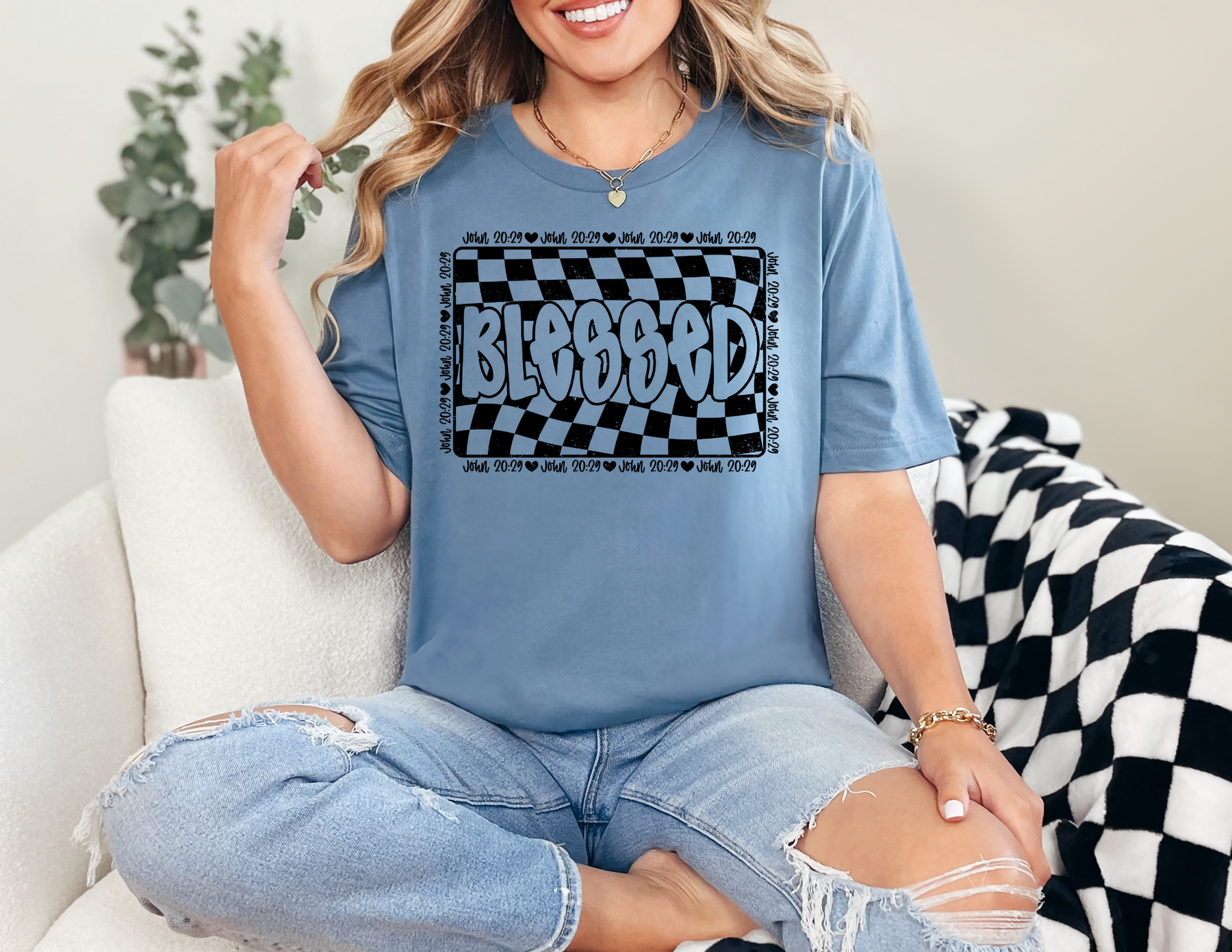 Blessed Tee featuring a black and white checkered design on a white t-shirt, combining comfort and style with a classic unisex fit.