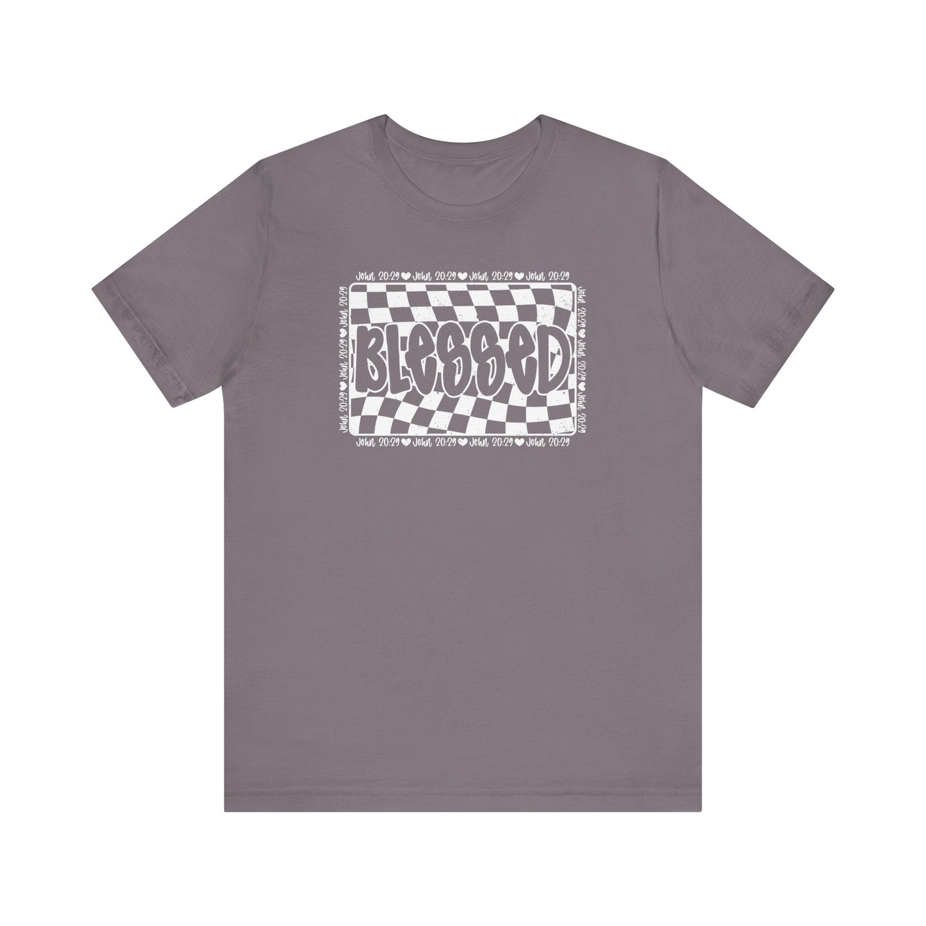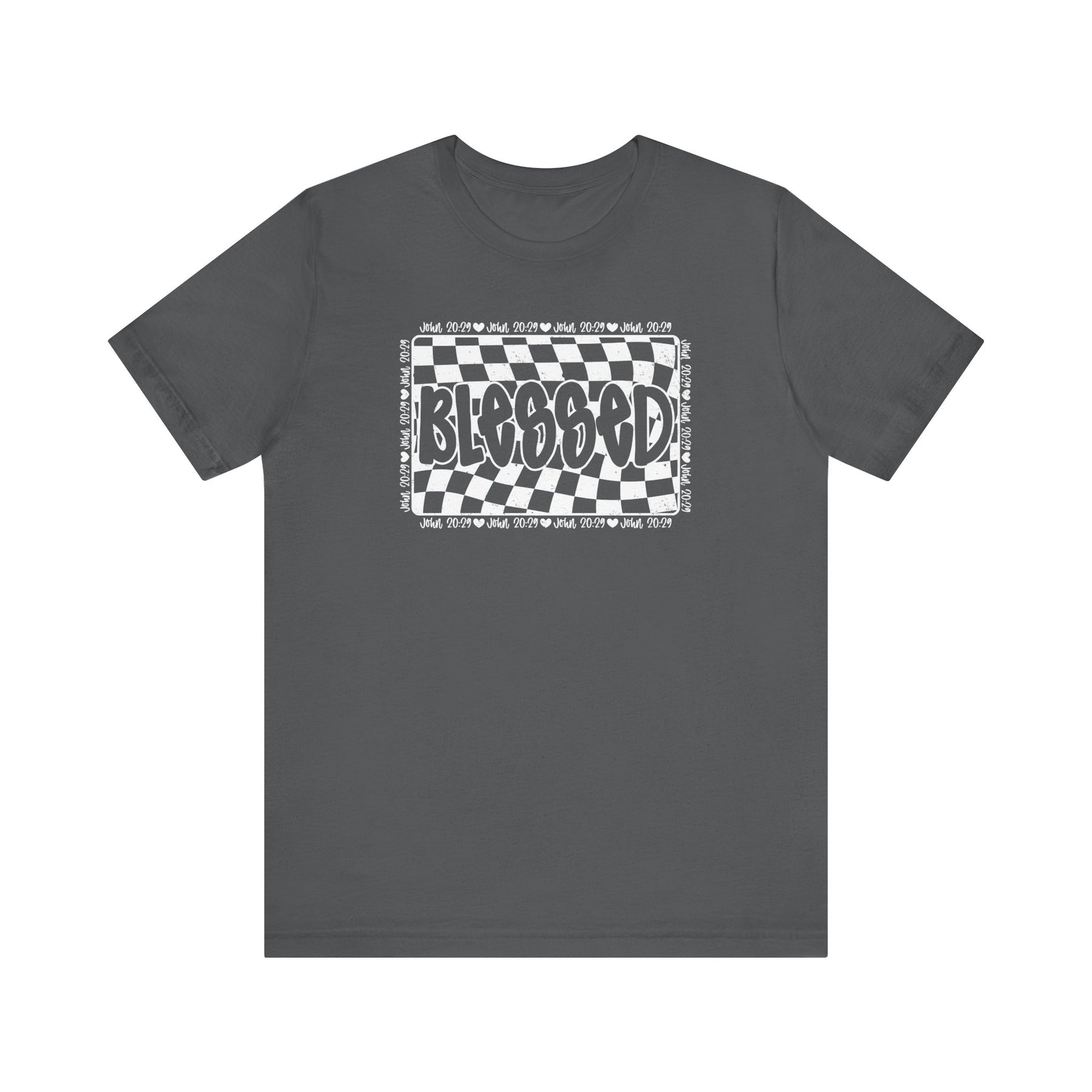 Blessed Tee: Grey unisex jersey t-shirt with black and white checkered design, featuring ribbed knit collars and shoulder taping for a comfortable, lasting fit.