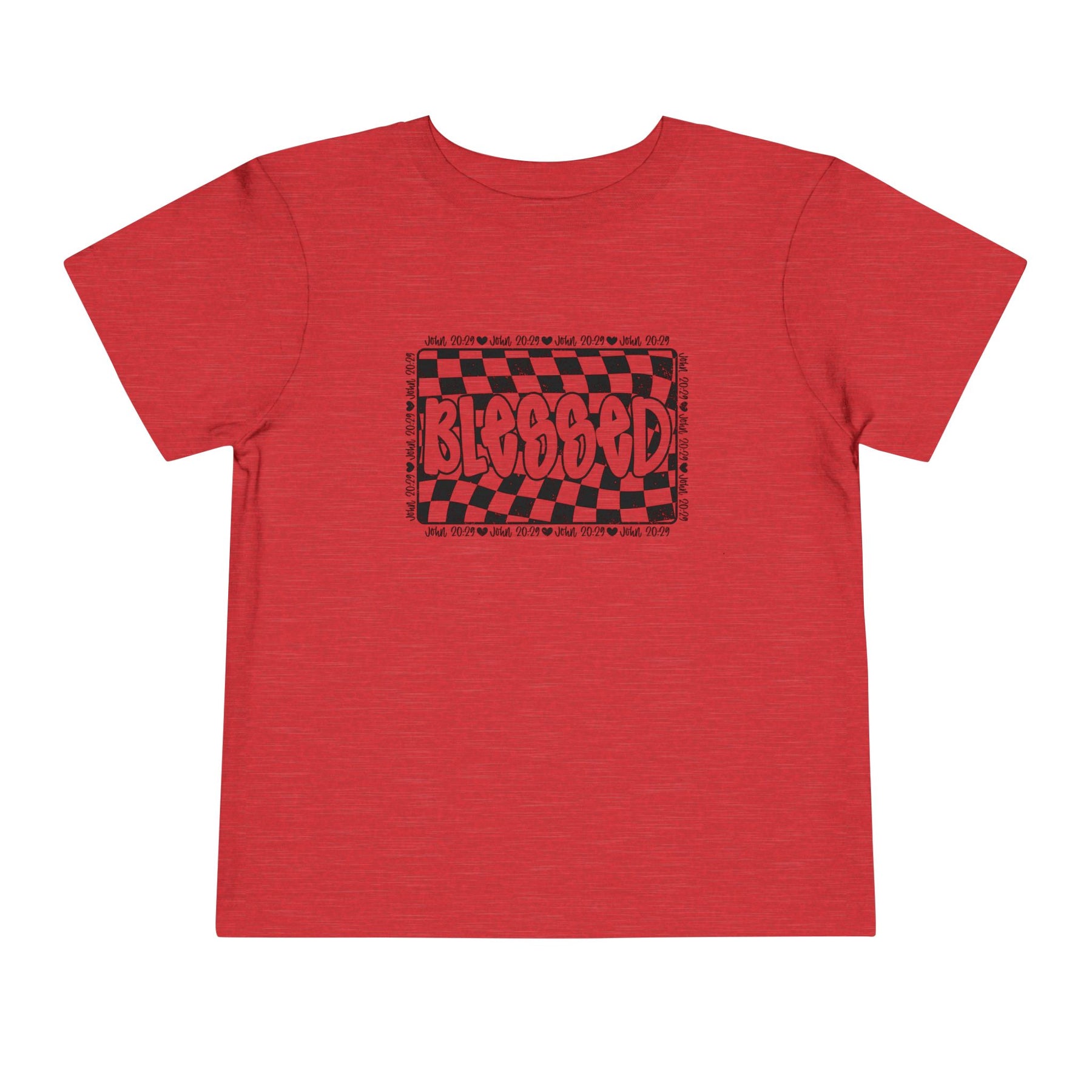 Blessed Toddler Tee: A red short sleeve tee for toddlers featuring a playful black and red graphic, crafted from soft Airlume cotton for comfort.