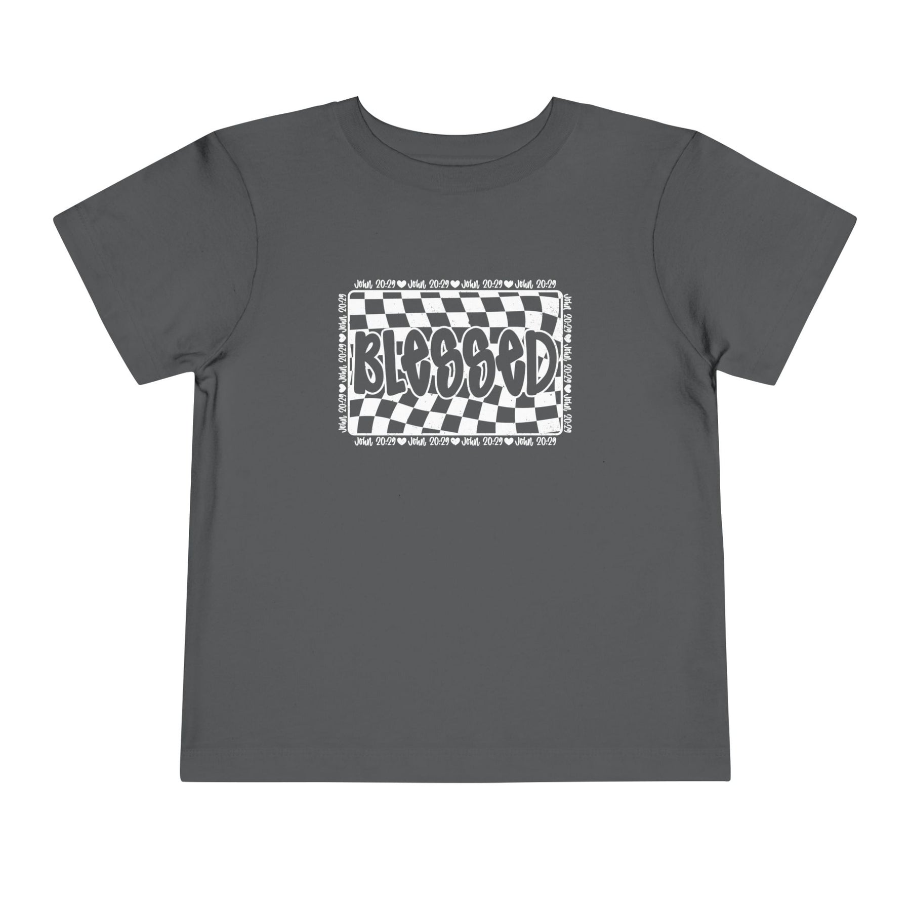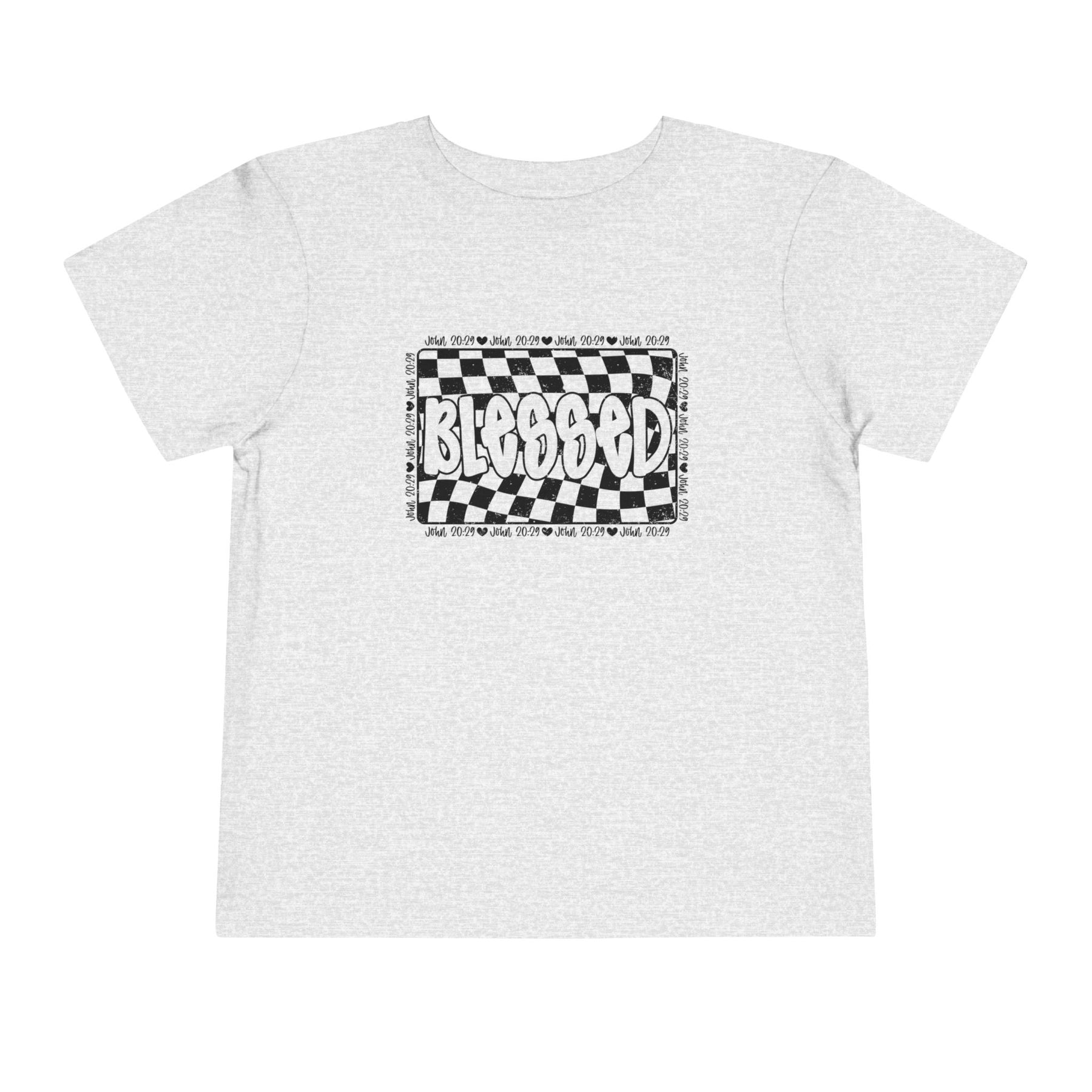 Blessed Toddler Tee with black and white checkered design, made from 100% Airlume cotton, offering comfort and style for kids.